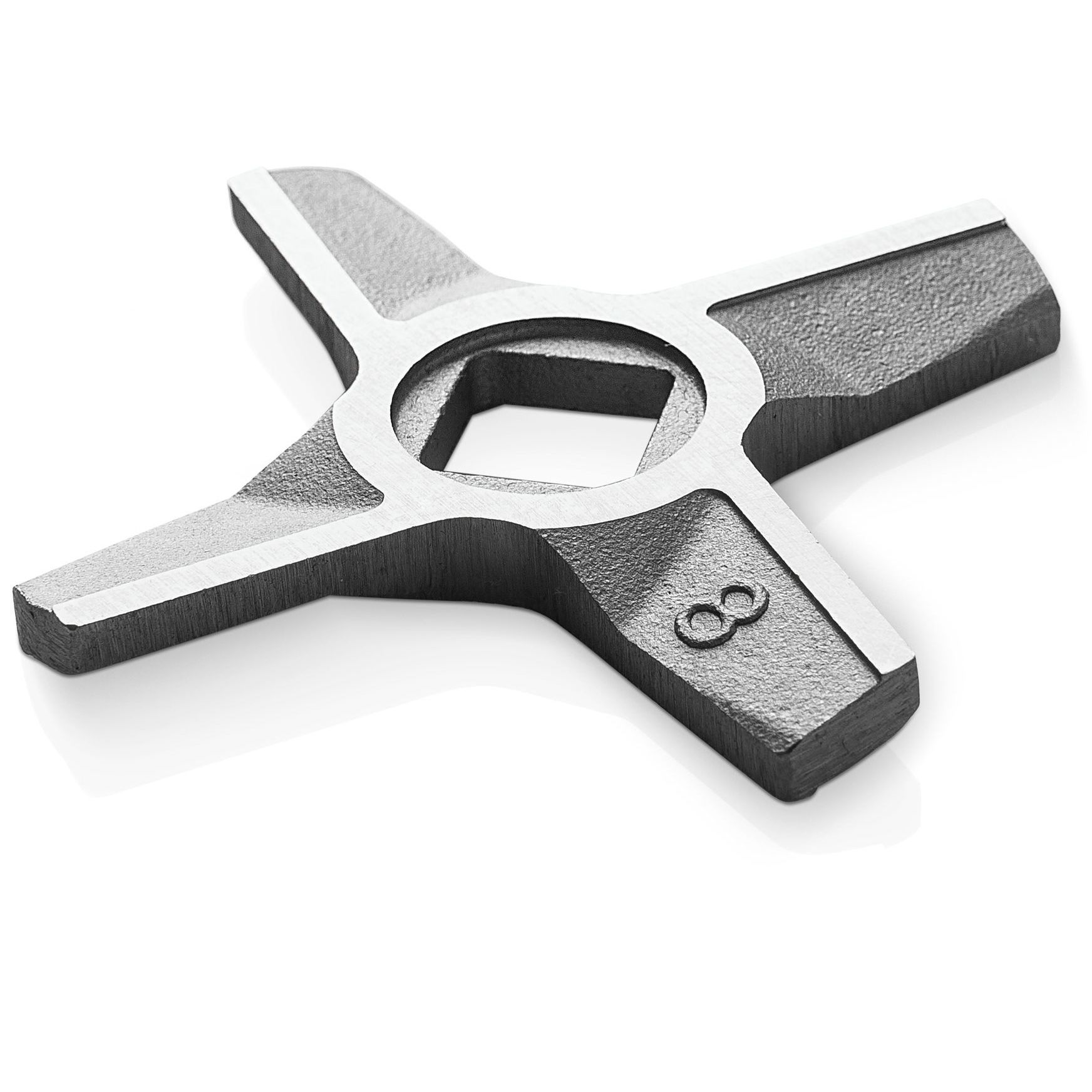 Cuțit cu două tăișuri pentru o tocare temeinică. De obicei, mașinile de tocat carne au un cuțit cu un singur tăiș. Cuțitul din oțel inoxidabil, cu două tăișuri, garantează întotdeauna o utlizare ușoară și tocare temeinică. Cuțitul se potrvește perfect: mărunțește carnea și legumele și este ușor de montat și de curățat.