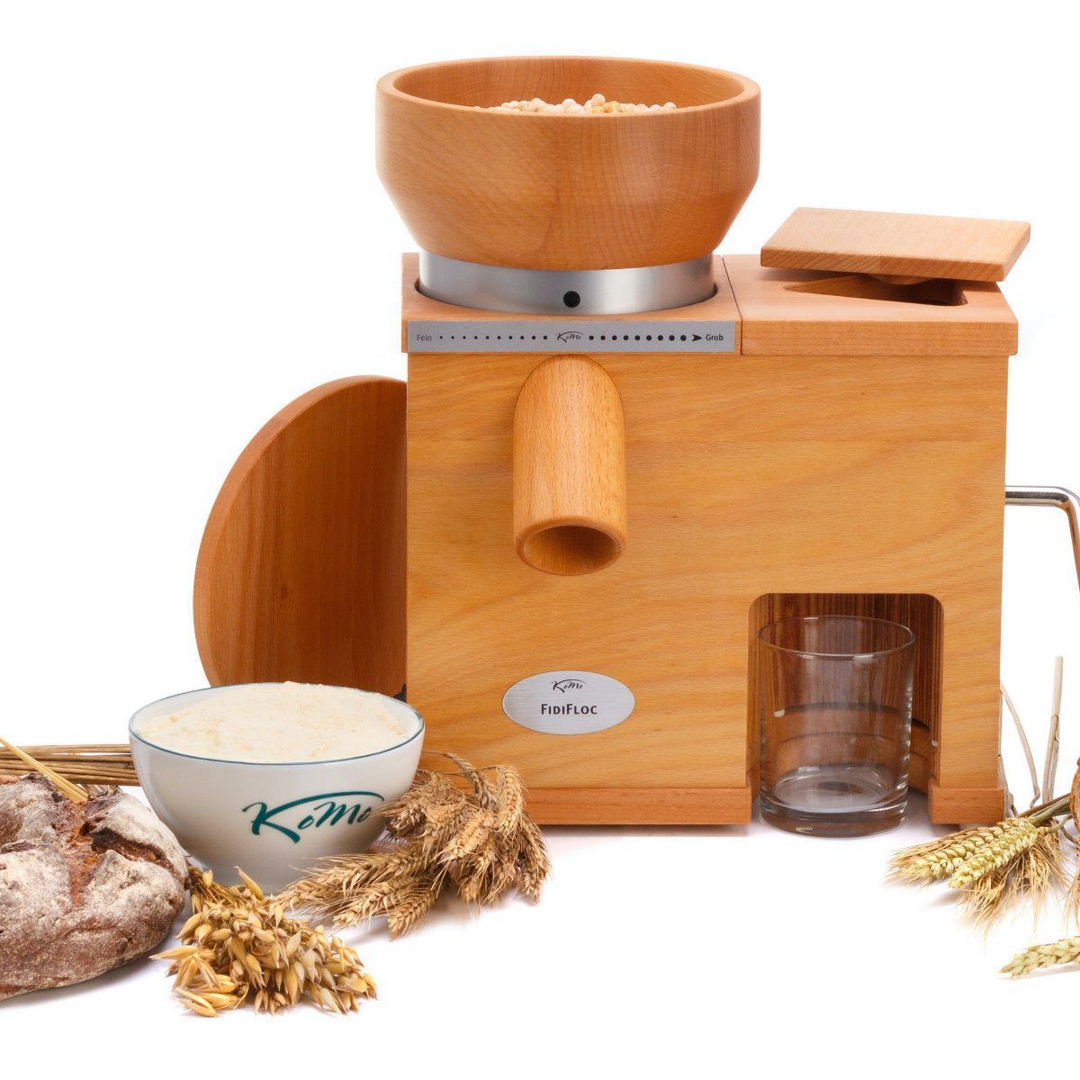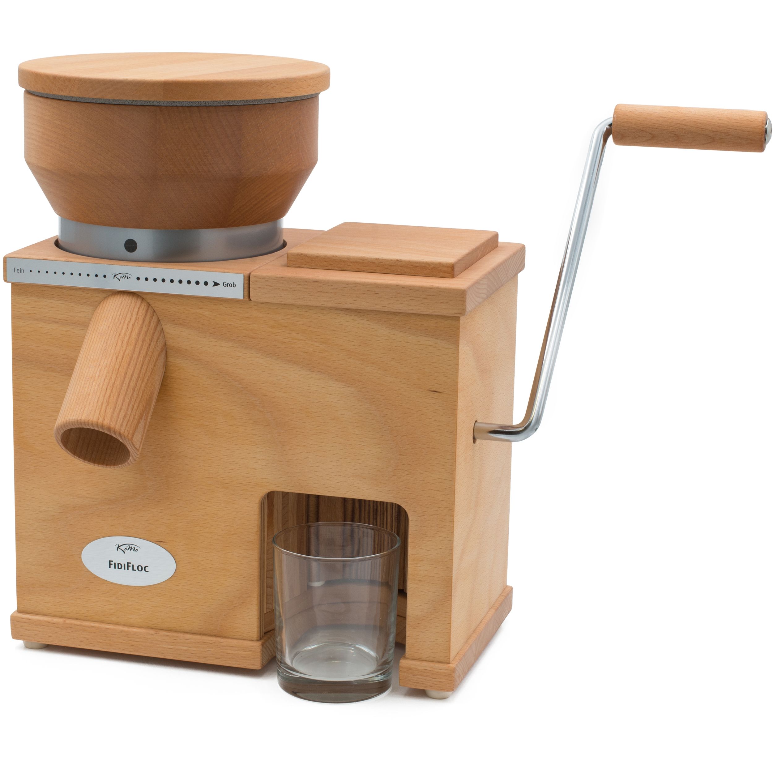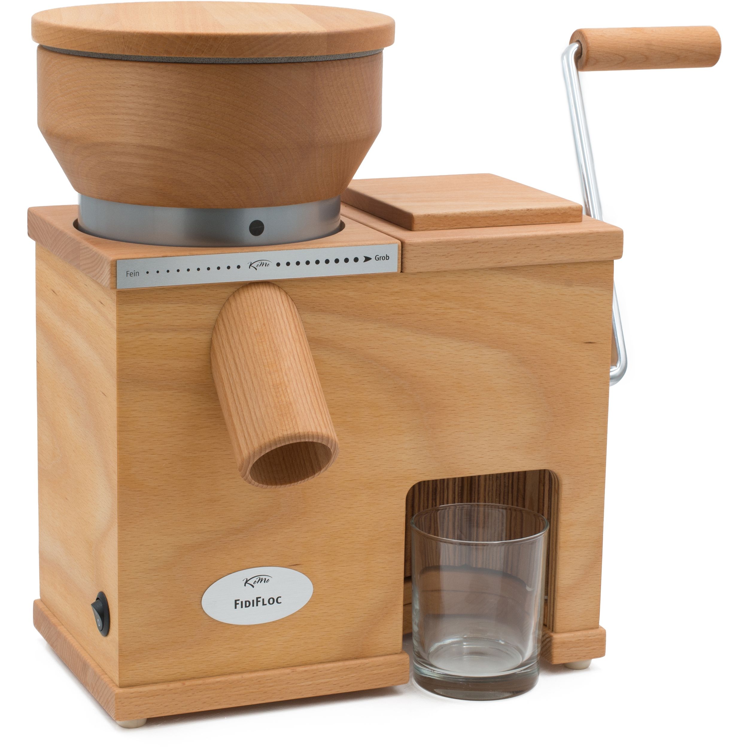 Combinație de moară de făină și mâner de mână. Cele două versiuni clasice FIDIBUS 21 și FLICFLOC sunt integrate în dispozitivul combinat . În flaconul FLICFLOC, două role conice și fără nichel natural din oțel inoxidabil se rotesc în rulmenți cu bile de înaltă calitate - și aproape singuri. Moara de cereale are un motor industrial de 250 de wați și pietre de moară auto-ascuțite din ceramică de corindon care macină 100 g făină fină pe minut. Indiferent dacă este vopsit verde, orz sau speltar - 850 g bob moale se potrivește în pâlnie. Suficient pentru a face 1 kg de pâine integrală. Pâlnia fulgerului ia până la 190 g de ovăz și evocă fulgi pentru muesli-ul de dimineață în cel mai scurt timp.
