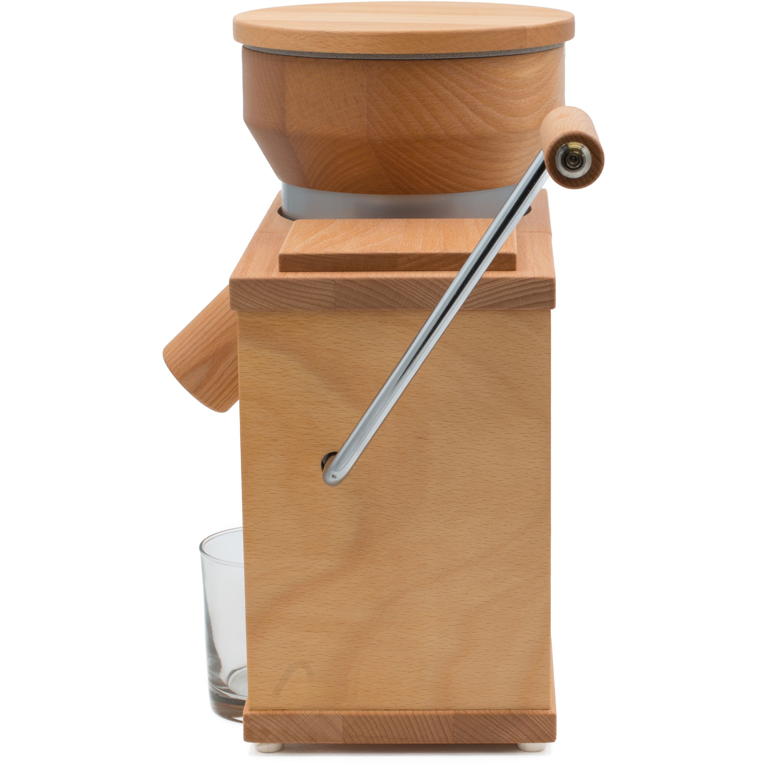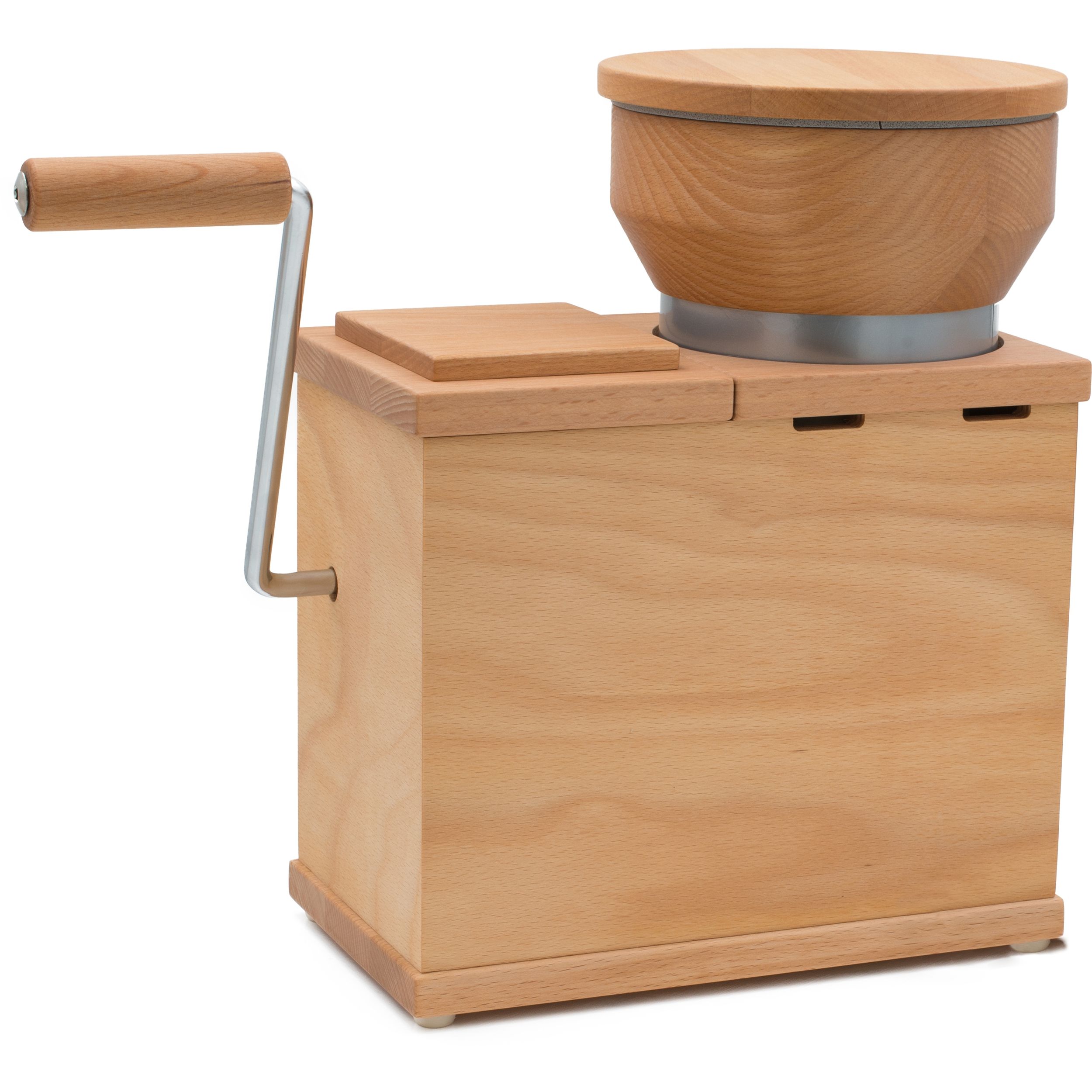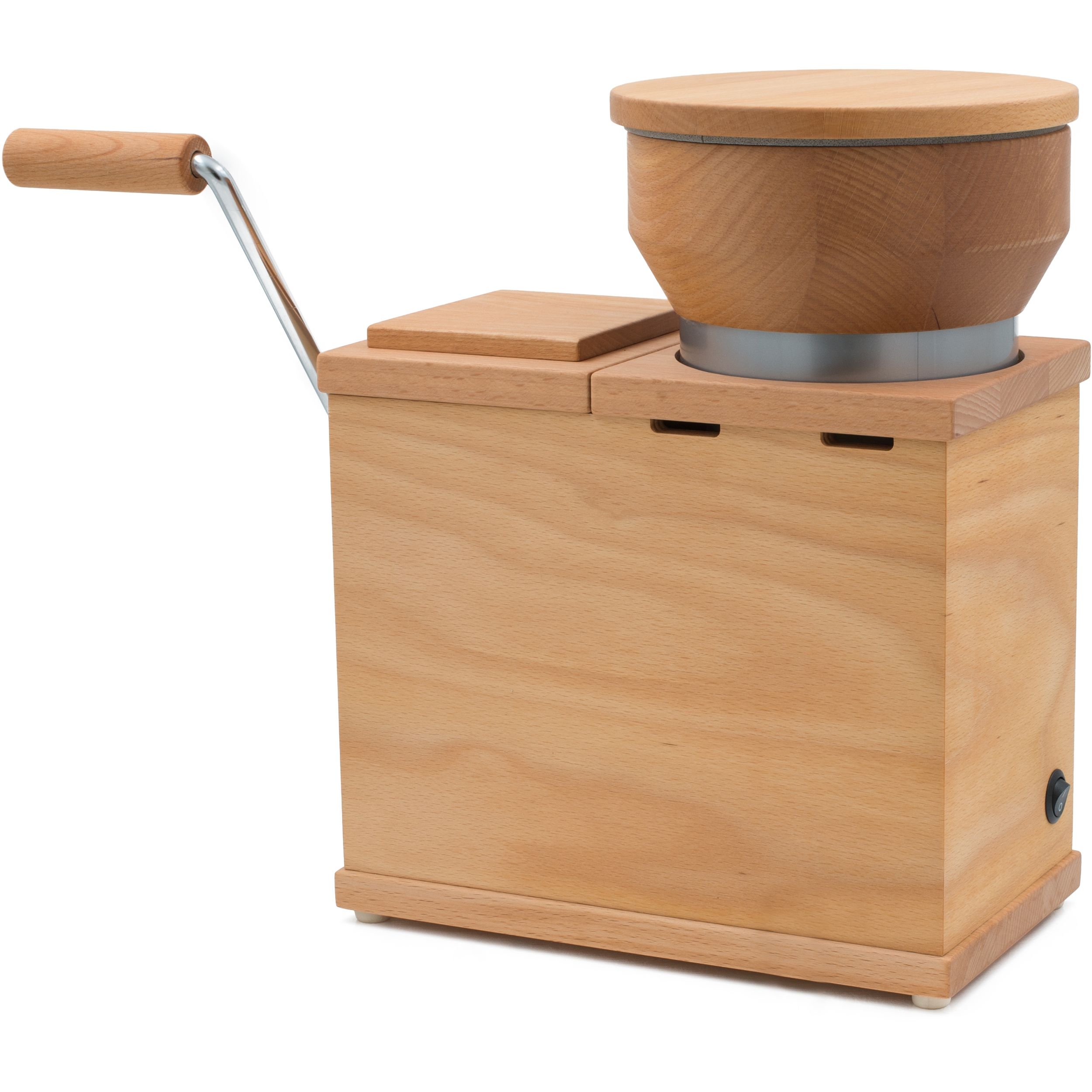 Combinație de moară de făină și mâner de mână. Cele două versiuni clasice FIDIBUS 21 și FLICFLOC sunt integrate în dispozitivul combinat . În flaconul FLICFLOC, două role conice și fără nichel natural din oțel inoxidabil se rotesc în rulmenți cu bile de înaltă calitate - și aproape singuri. Moara de cereale are un motor industrial de 250 de wați și pietre de moară auto-ascuțite din ceramică de corindon care macină 100 g făină fină pe minut. Indiferent dacă este vopsit verde, orz sau speltar - 850 g bob moale se potrivește în pâlnie. Suficient pentru a face 1 kg de pâine integrală. Pâlnia fulgerului ia până la 190 g de ovăz și evocă fulgi pentru muesli-ul de dimineață în cel mai scurt timp.