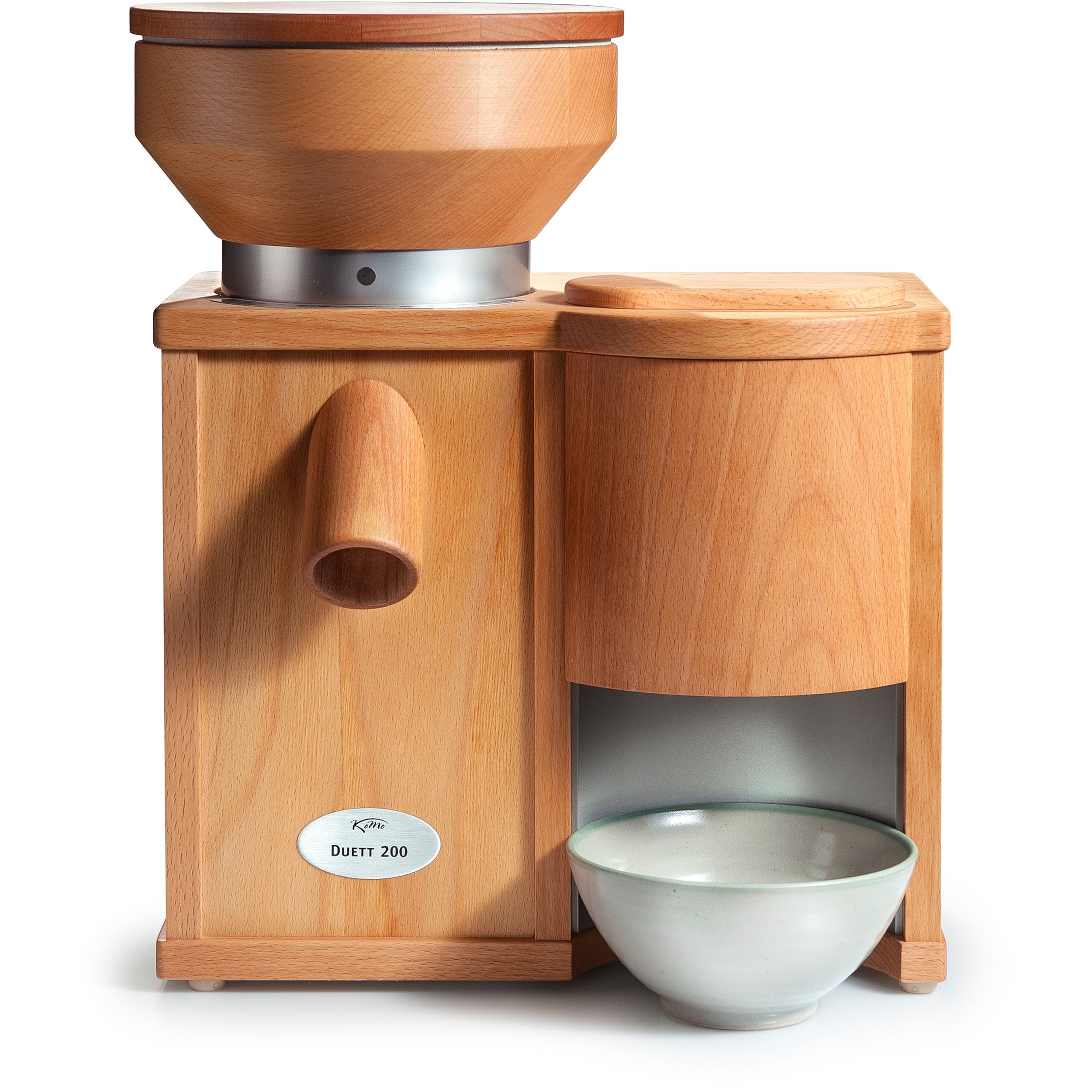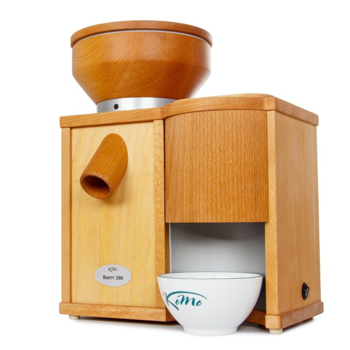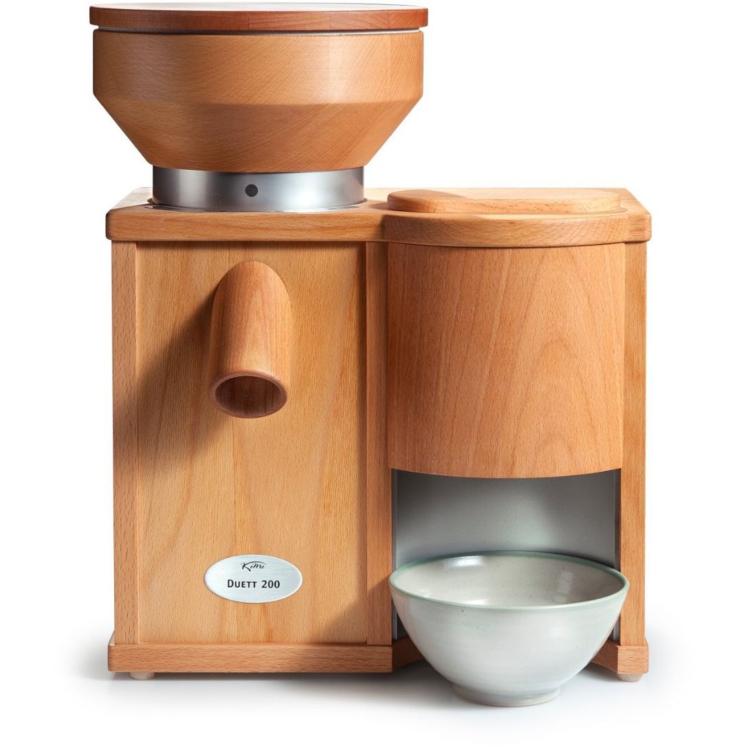 Combo Komo Duett 200, Putere motor 600W, Capacitate pâlnie moară: 1200g / presă: 200g, Capacitate de procesare moară: 200g/min / presă: 90g/min, 2 role din Corindon-Ceramică de 8.5cm, Carcasa este din lemn de fag