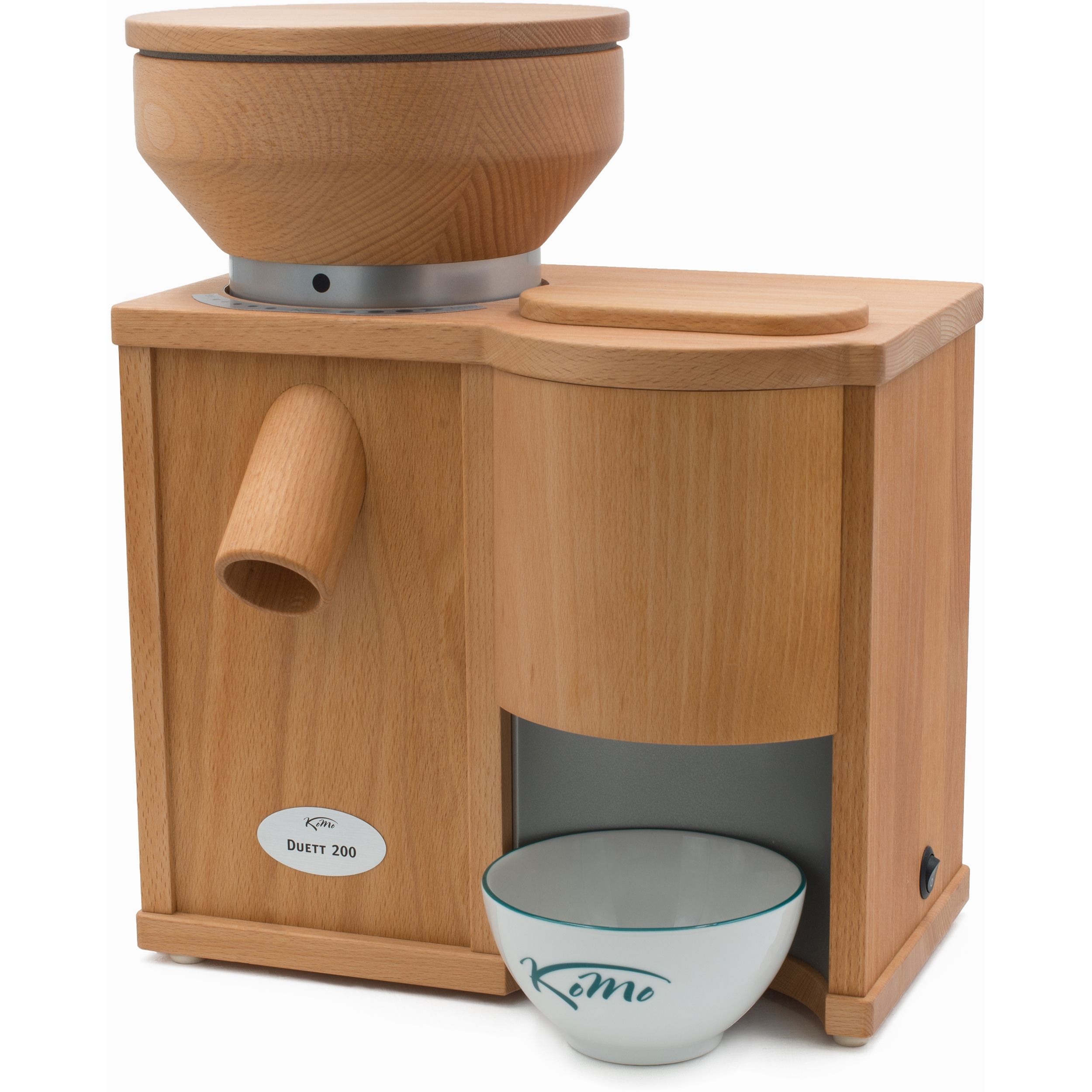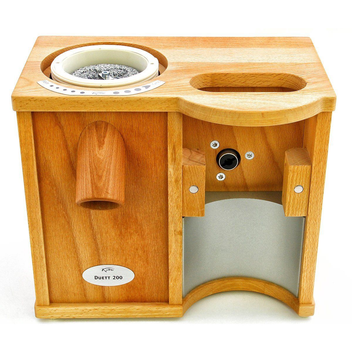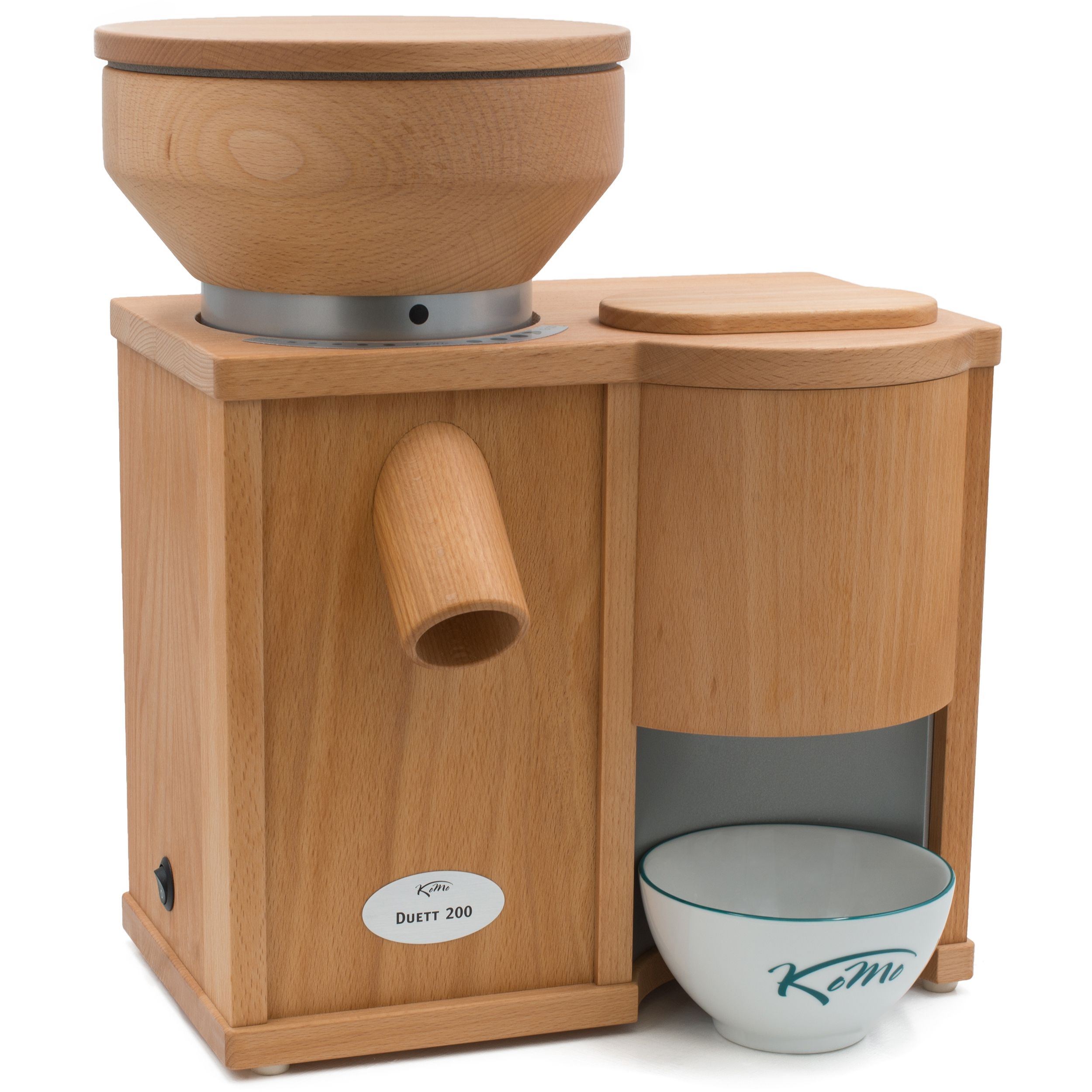 Combo Komo Duett 200, Putere motor 600W, Capacitate pâlnie moară: 1200g / presă: 200g, Capacitate de procesare moară: 200g/min / presă: 90g/min, 2 role din Corindon-Ceramică de 8.5cm, Carcasa este din lemn de fag