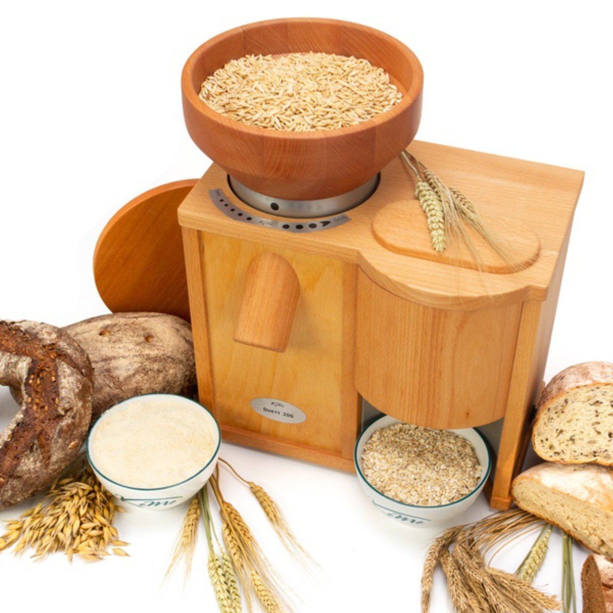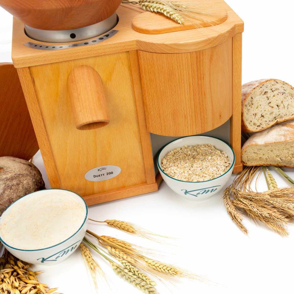 Un dublu puternic sau „2 în 1”. Proaspăt măcinat și fulgi cu o capodoperă! Sistemul multifuncțional simplu funcționează cu două unități independente și ajustate optim (de asemenea, în același timp). DUETT 200 conține tehnologia rezistentă a FIDIBUS XL și FLOCMAN cu zgomot redus. Livrarea are loc cu un bol potrivit. Întregul lucru este imbatabil în preț și costă mai puțin decât suma părților sale. Pentru toți cei care doresc nu numai făină proaspătă, ci și cereale proaspăt presate, cum ar fi ovăzul, pentru un muesli delicios sau terci.