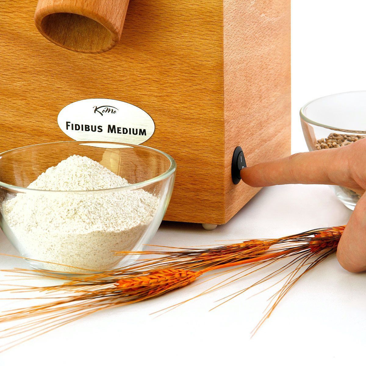 Cu această moară puteți experimenta: Noi tipuri de făină pentru rețete delicioase, astăzi îngroșați supa cu făină de linte și mâine pâine plată din făină de teff, imaginația dvs. nu cunoaște limite. O întoarcere a pâlniei este suficientă pentru a seta finețea dorită. Puteți deschide râșnița în cel mai scurt timp și fără niciun instrument. Ca la toate fabricile KoMo. Pur și simplu minunat! Datorită motorului mai puternic și mai mare, Komo Fidibus Medium este puțin mai mare decât Fidibus 21.
