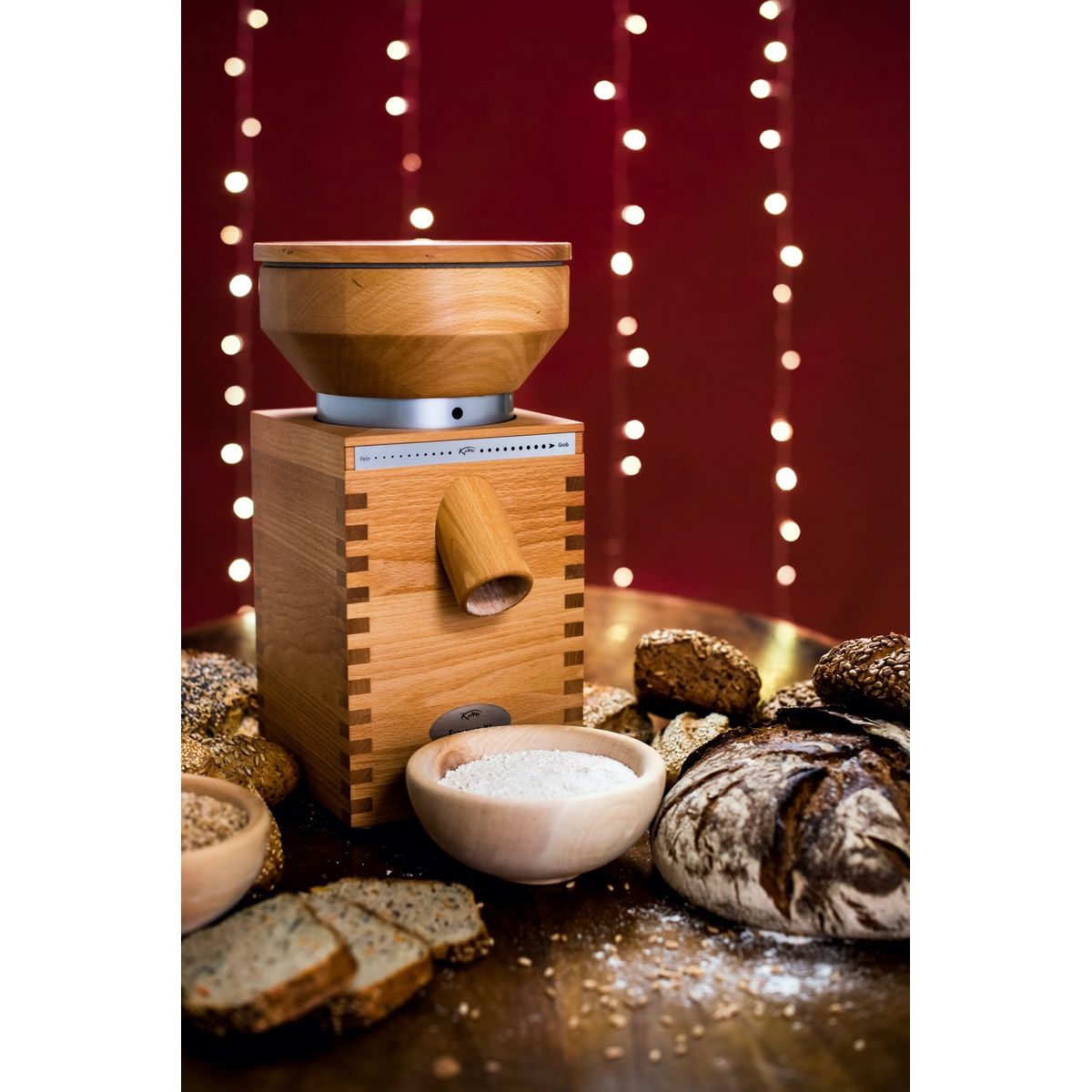 Cu această moară puteți experimenta. Noi tipuri de făină pentru rețete delicioase - astăzi coaceți cu făină de lupin și mâine descoperiți bucătăria mexicană cu făină de porumb - nu există limite în imaginația voastră. Doar rotiți pâlnia pentru a seta finețea dorită. Puteți deschide râșnița în cel mai scurt timp și fără niciun instrument. Ca la toate fabricile KoMo. Pur și simplu minunat!
