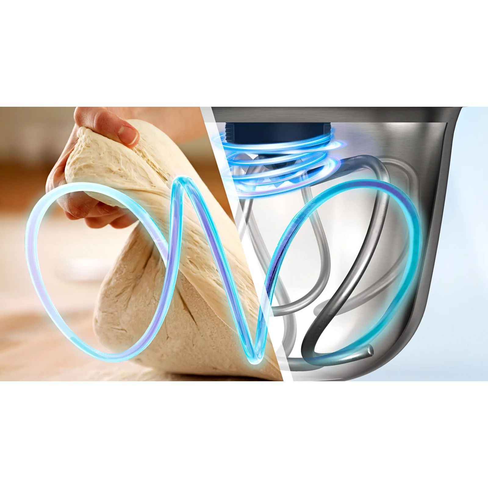 Nu lăsa aluaturile dificile să îți strice buna dispoziție, dimensiunile mici și compacte ale robotului îți asigură mai mult spațiu în bucătărie. Înclinarea accesoriilor de mixare a aluatului către partea din spate a bolului permite adăugarea ușoară a ingredientelor. Poziția de repaus este utilă pentru umplerea ușoară a bolului prin partea din față.