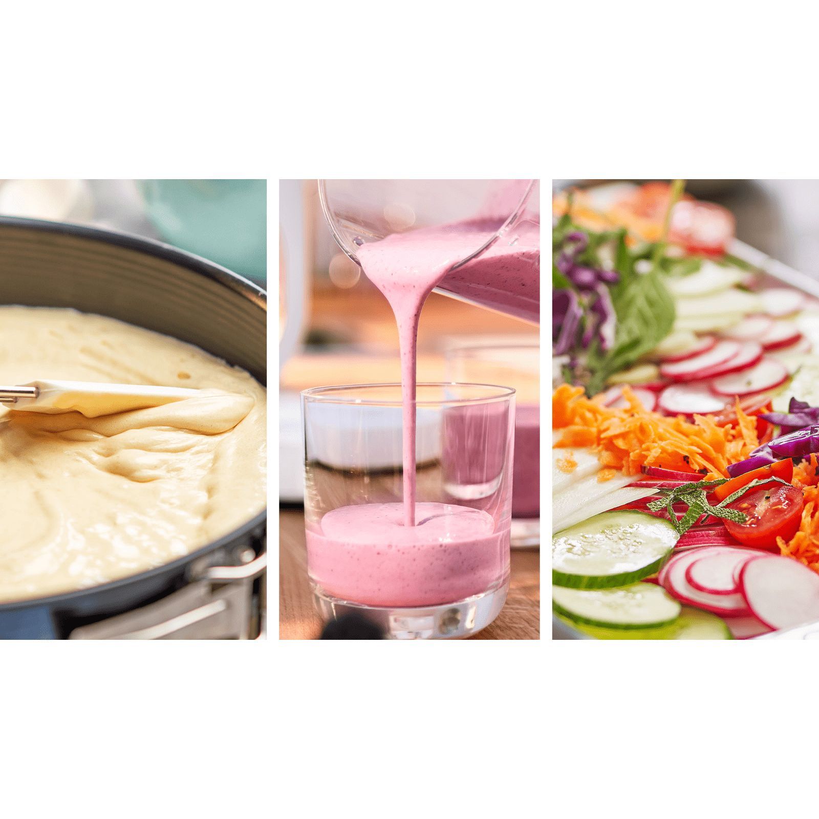 De obicei, ai nevoie de diferite dispozitive atunci prepari diferite compoziții. Indiferent că toci ceapă sau fructe, răzuiești legume sau amesteci smoothie-uri, datorită accesoriilor incluse compoziția ta va fi pregătită rapid.