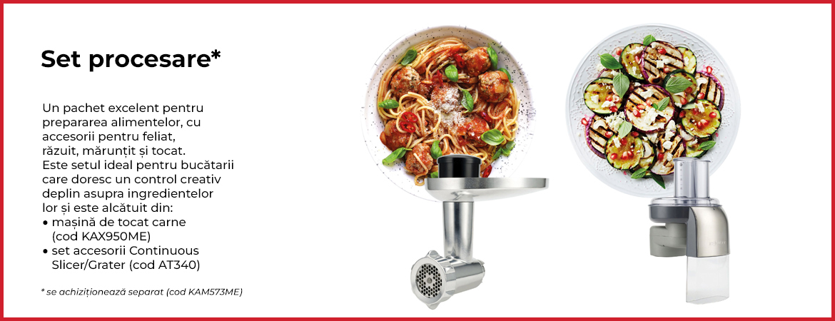 Extindeți-vă creativitatea cu gama noastră imensă de 25 de accesorii opționale. Conectându-se la butucul cu viteză mare sau mică, se vor amesteca, se vor felia, se vor în spirala, se vor toca, se vor răzui, se vor transforma în suc lent... toate la perfecţiune.