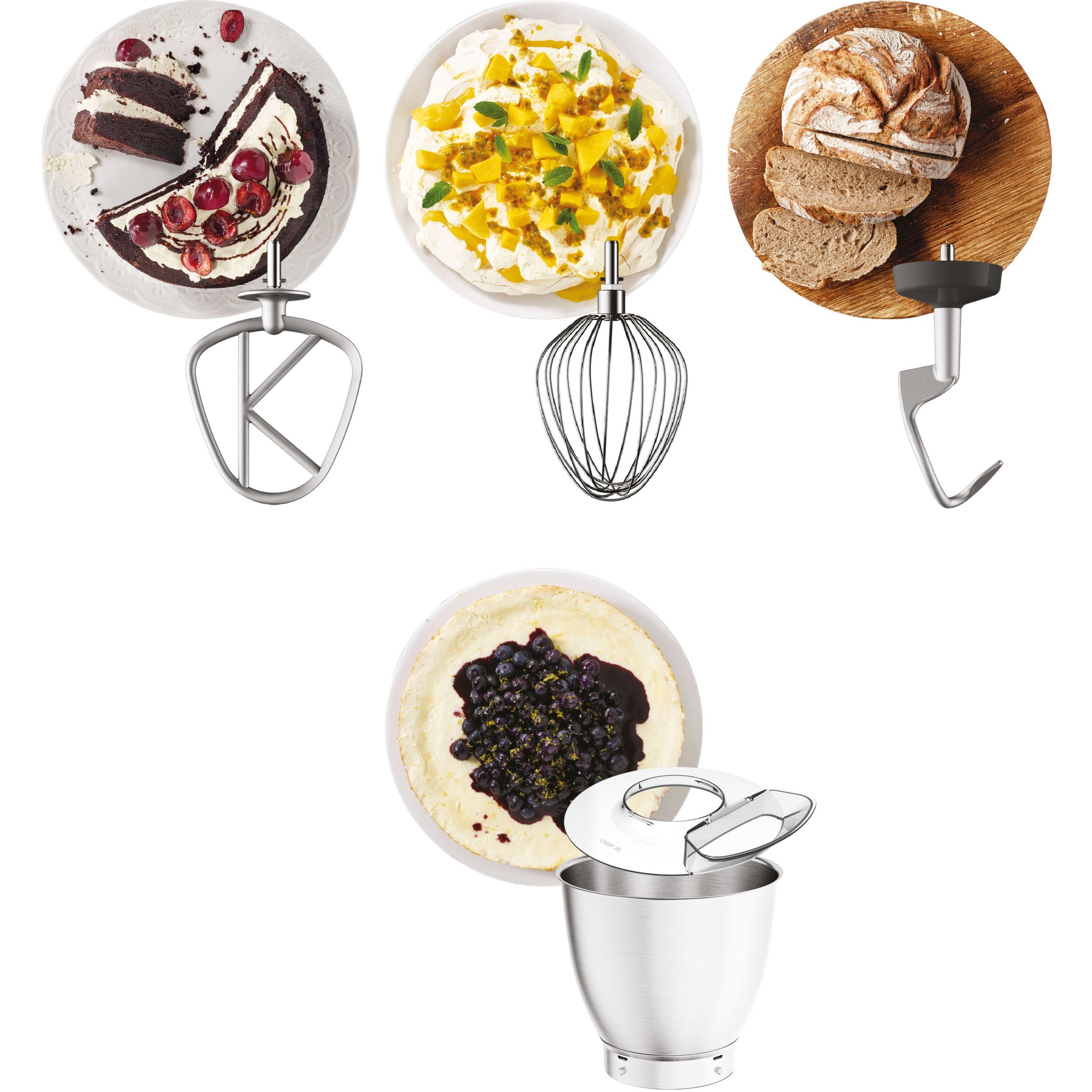 Extindeți-vă creativitatea cu gama noastră imensă de 25 de accesorii opționale. Conectându-se la butucul cu viteză mare sau mică, se vor amesteca, se vor felia, se vor în spirala, se vor toca, se vor răzui, se vor transforma în suc lent... toate la perfecţiune.