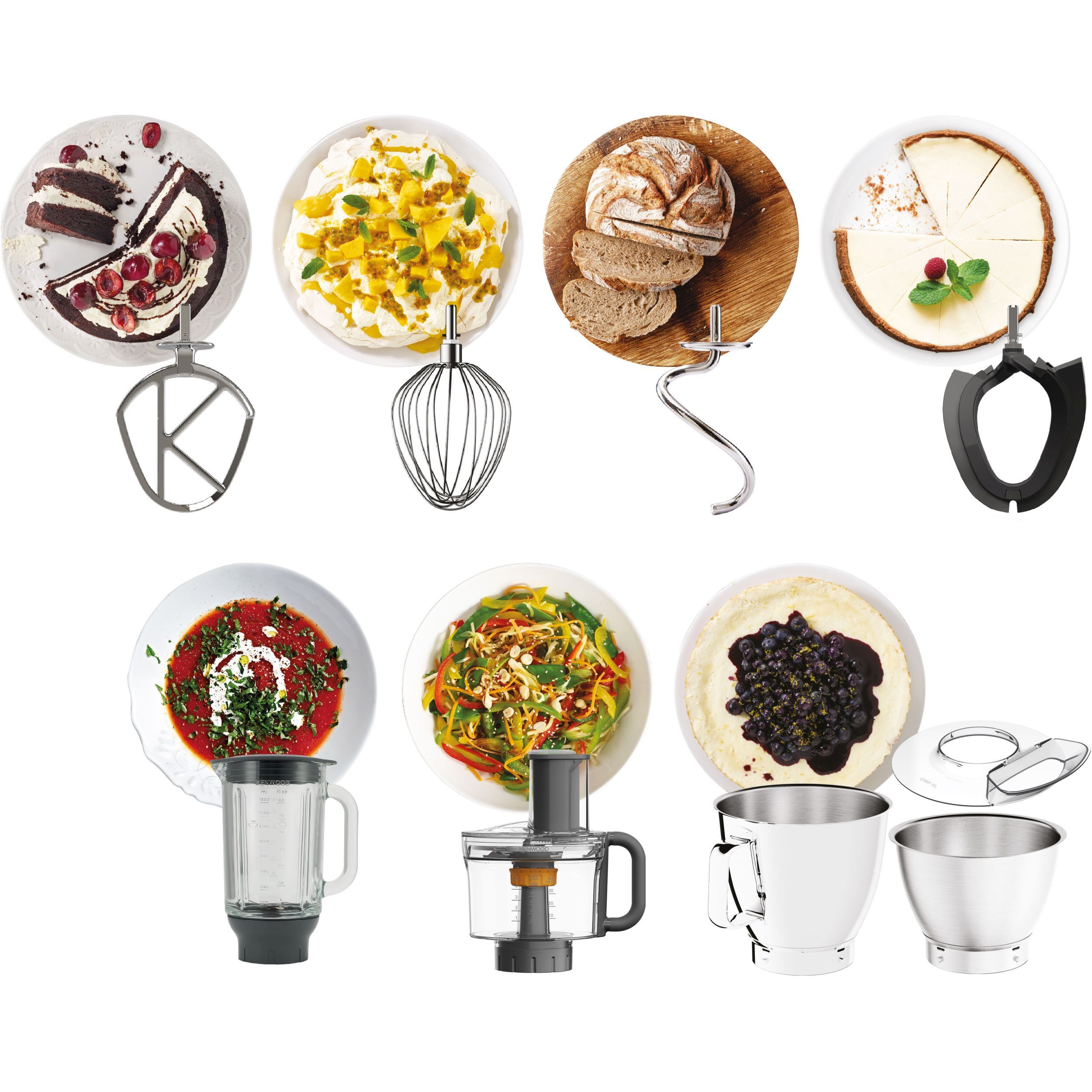 K-Beater semnătura noastră, însoțește încă două unelte de gătit din oțel inoxidabil, un instrument pentru aluat și tel. În plus, un bătător cremos. Abordați cu încredere orice sarcină. Toate pot fi spălate în maşina de spălat vase pentru o curăţare uşoară.
