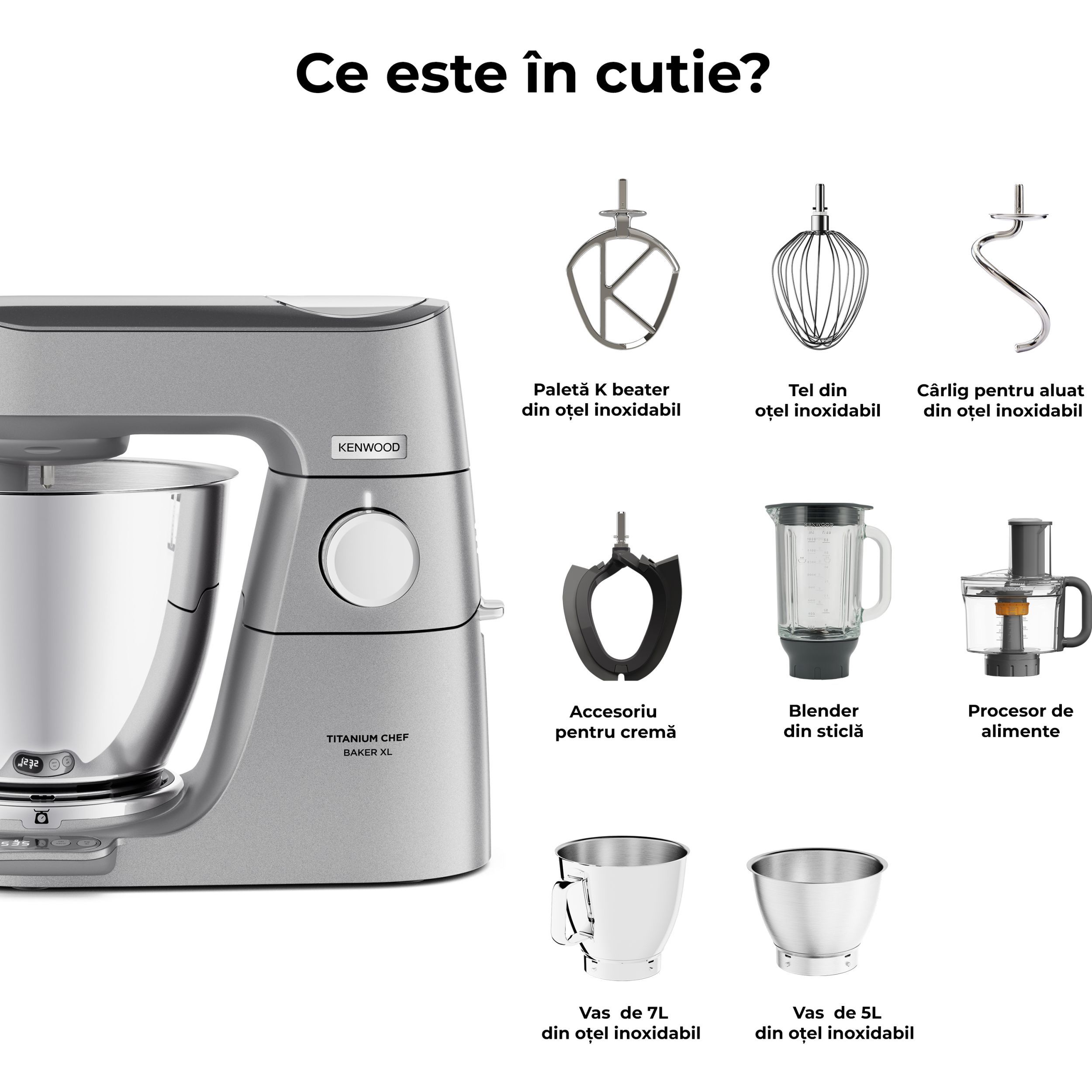 Robot de bucătărie KENWOOD Titanium Chef Baker XL KVL85.424SI - 0W20011478, 1200W, 2 vase (7l/5l), Cântar integrat, Blender, Procesor alimente, Silver