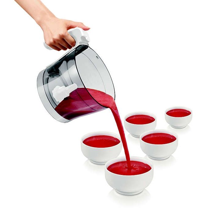 Până la 5 porţii dintr-o dată. Bolul generos de 2,1 l (capacitate de lucru 1,5 l) îţi permite să amesteci până la 5 porţii de supă dintr-o singură mişcare.
