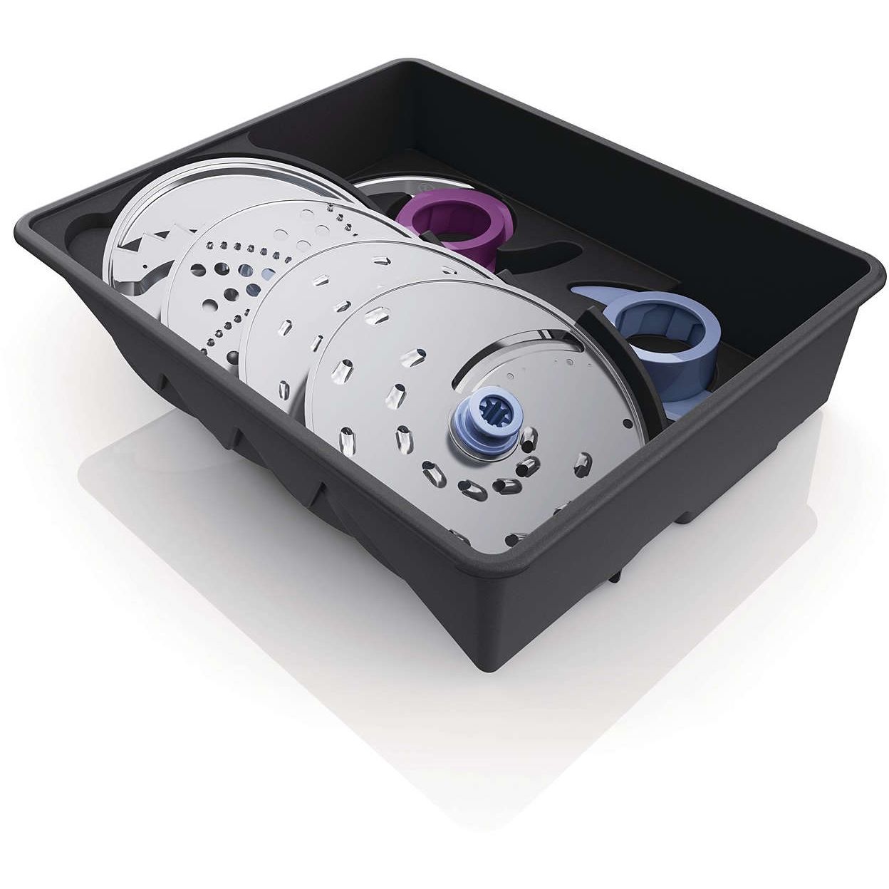 Depozit practic pentru accesorii inclus. Cutia pentru depozitarea accesoriilor îţi păstrează accesoriile robotului de bucătărie Philips la îndemână. Totodată, te ajută să păstrezi la loc sigur toate accesoriile ascuţite din oţel inoxidabil!