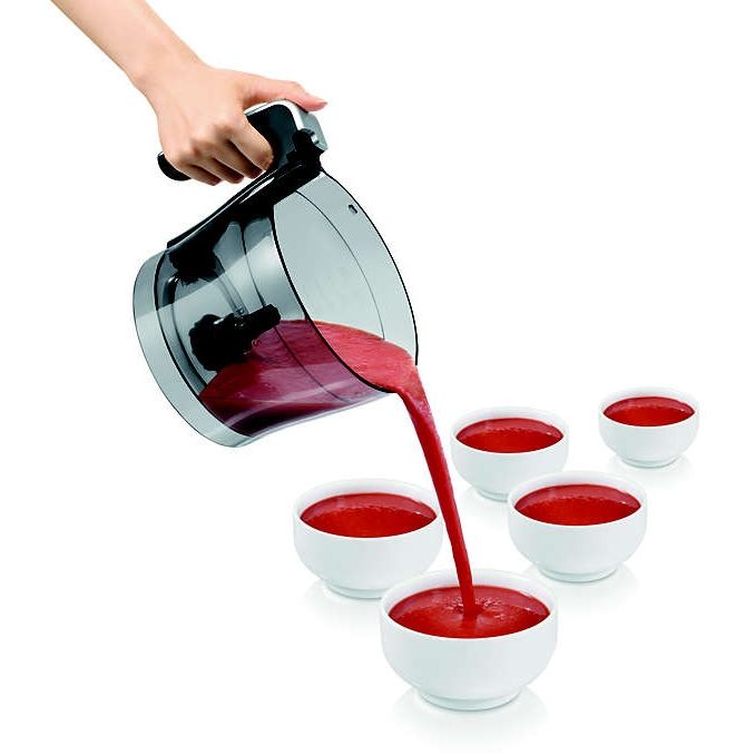 Până la 5 porţii dintr-o dată. Bolul generos de 2,1 l (capacitate de lucru 1,5 l) îţi permite să amesteci până la 5 porţii de supă dintr-o singură mişcare.