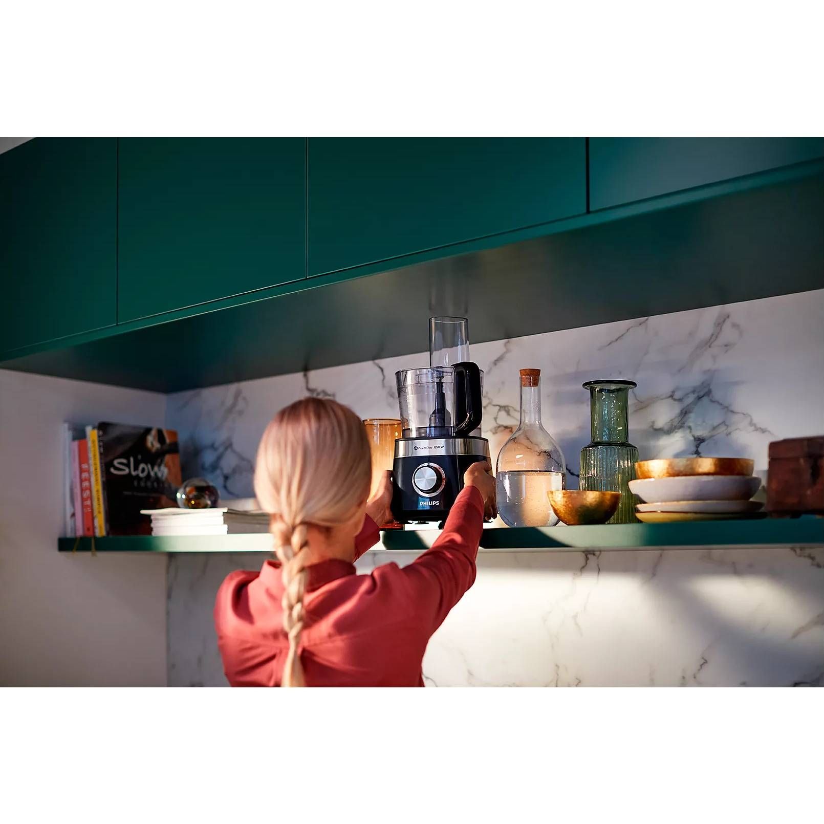 Amprentă mai mică şi depozitarea tuturor accesoriilor în bol. Robotul de bucătărie compact Viva Food ocupă mai puţin spaţiu pe blatul de bucătărie, însă este complet echipat cu toate accesoriile de bucătărie esenţiale, care pot fi păstrate uşor în cutia de depozitare.
