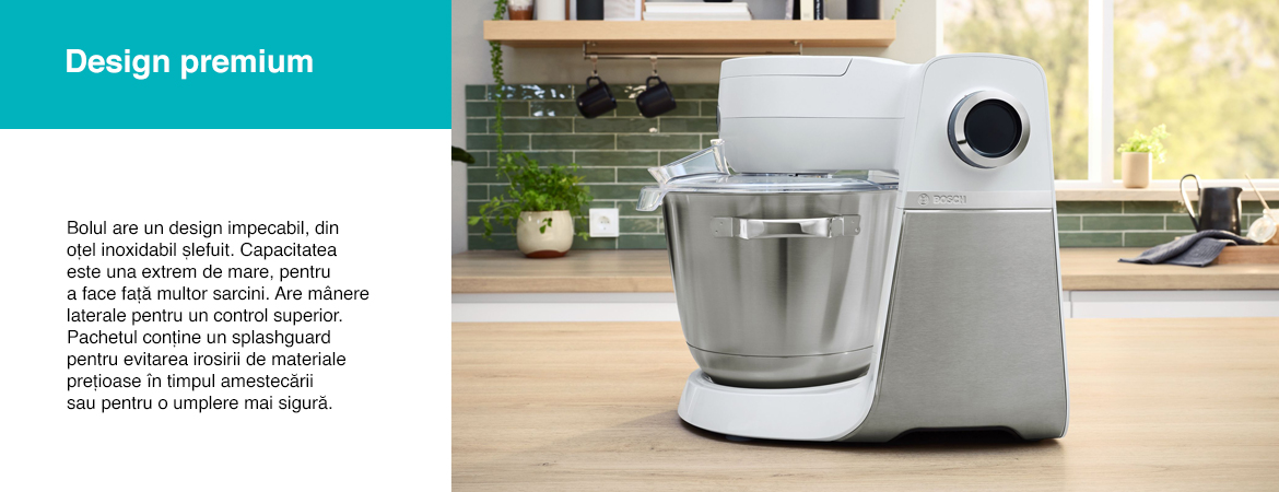 Robot de bucătărie Serie 6 cu motor de 1600W pentru o procesare ușoară a ingredientelor. Mixare planetară 3D și design modern.