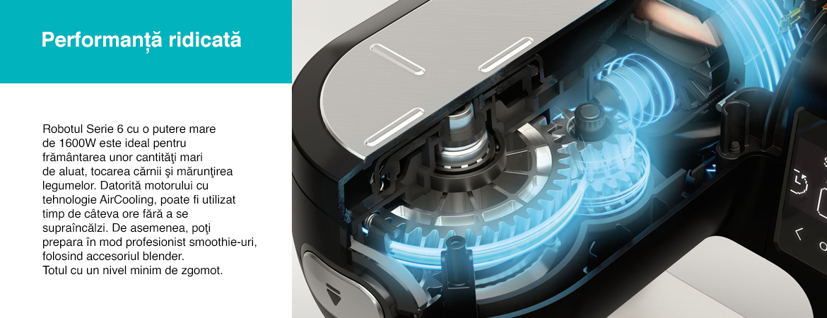 - Motor puternic de 1600W pentru procesarea aluaturilor grele și a cantităților mari;