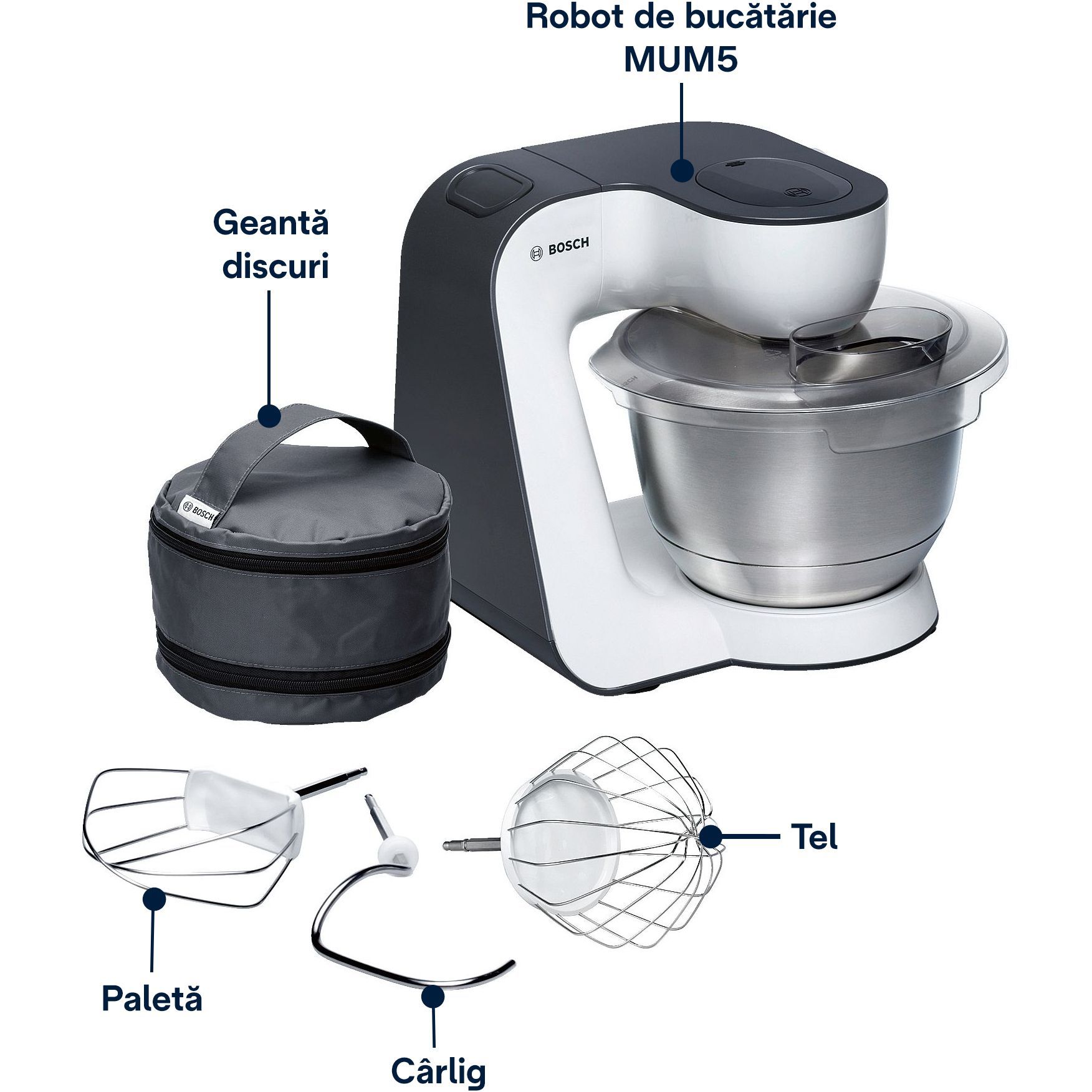 Ai accesoriile mereu la îndemână. Setul de patiserie poate fi depozitat după utilizare în geanta pentru accesorii, împreună cu discurile. Geanta cu accesorii poate fi depozitată direct în bol, fiind astfel mereu la îndemână.