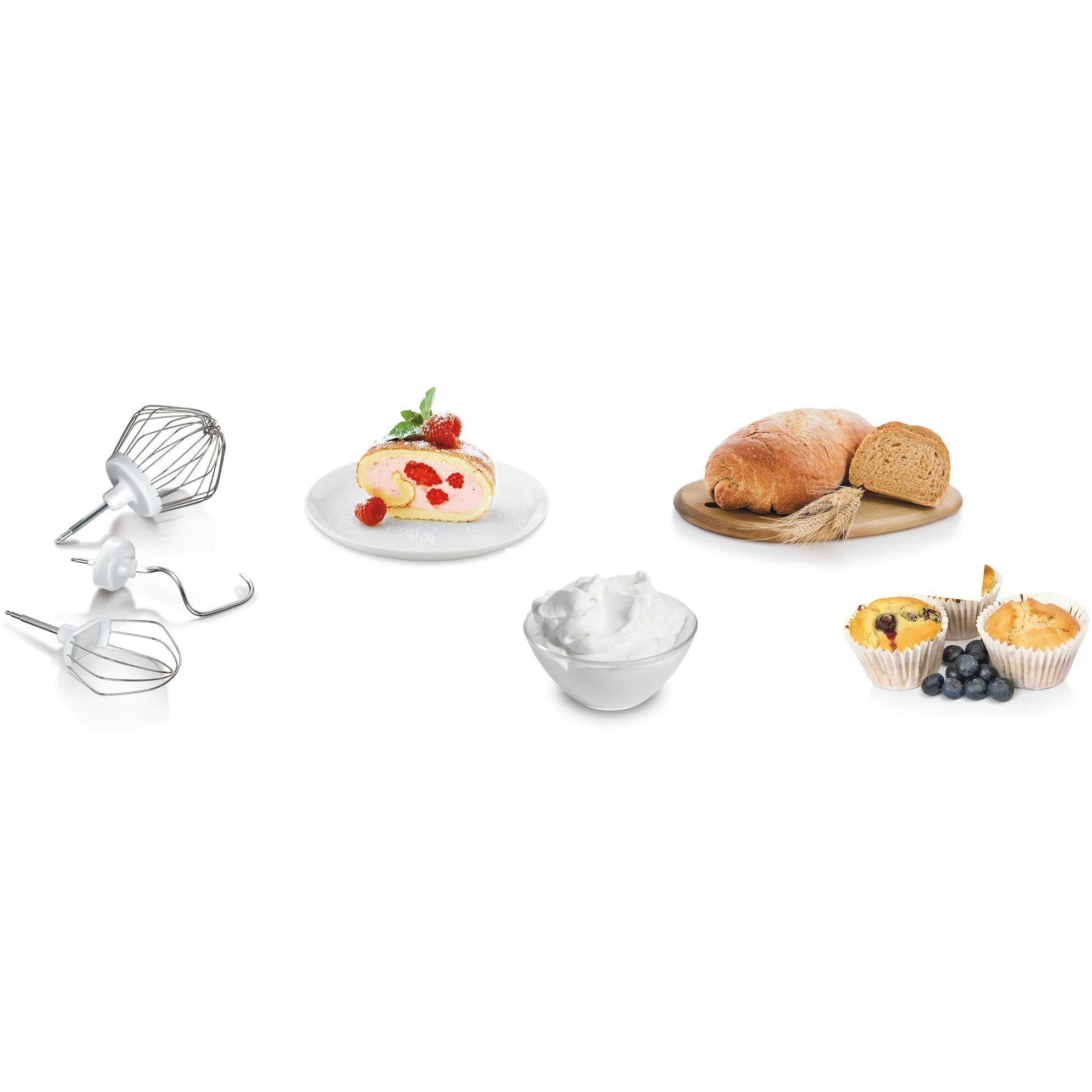 Ai accesoriile potrivite pentru o multitudine de preparate. Telul, paleta pentru amestecat și cârligul pentru frământat sunt potrivite pentru o gamă largă de utilizări asigurându-ți rezultate perfecte. Cu aceste accesorii poți să prepari cu ușurință meringue, amestec pentru prăjituri șau aluaturi grele. Aceste accesorii pot fi spălate în mașina de spălat vase.