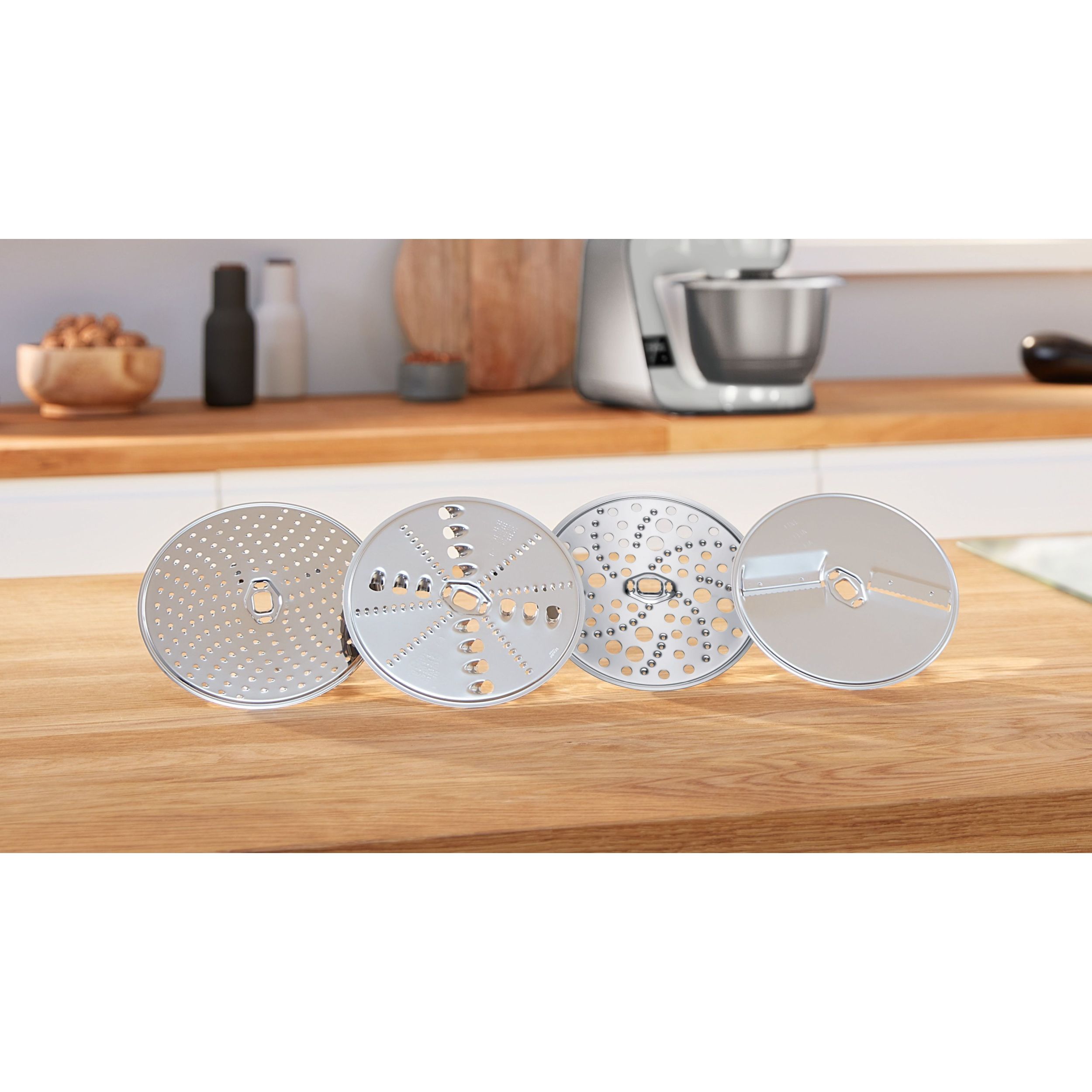 4 discuri de feliere/răzuire din oțel inoxidabil (disc de răzuire mediu-fin, disc reversibil de feliere și mărunțire/ tocare, disc reversibil de răzuire, disc reversibil de feliere mare)