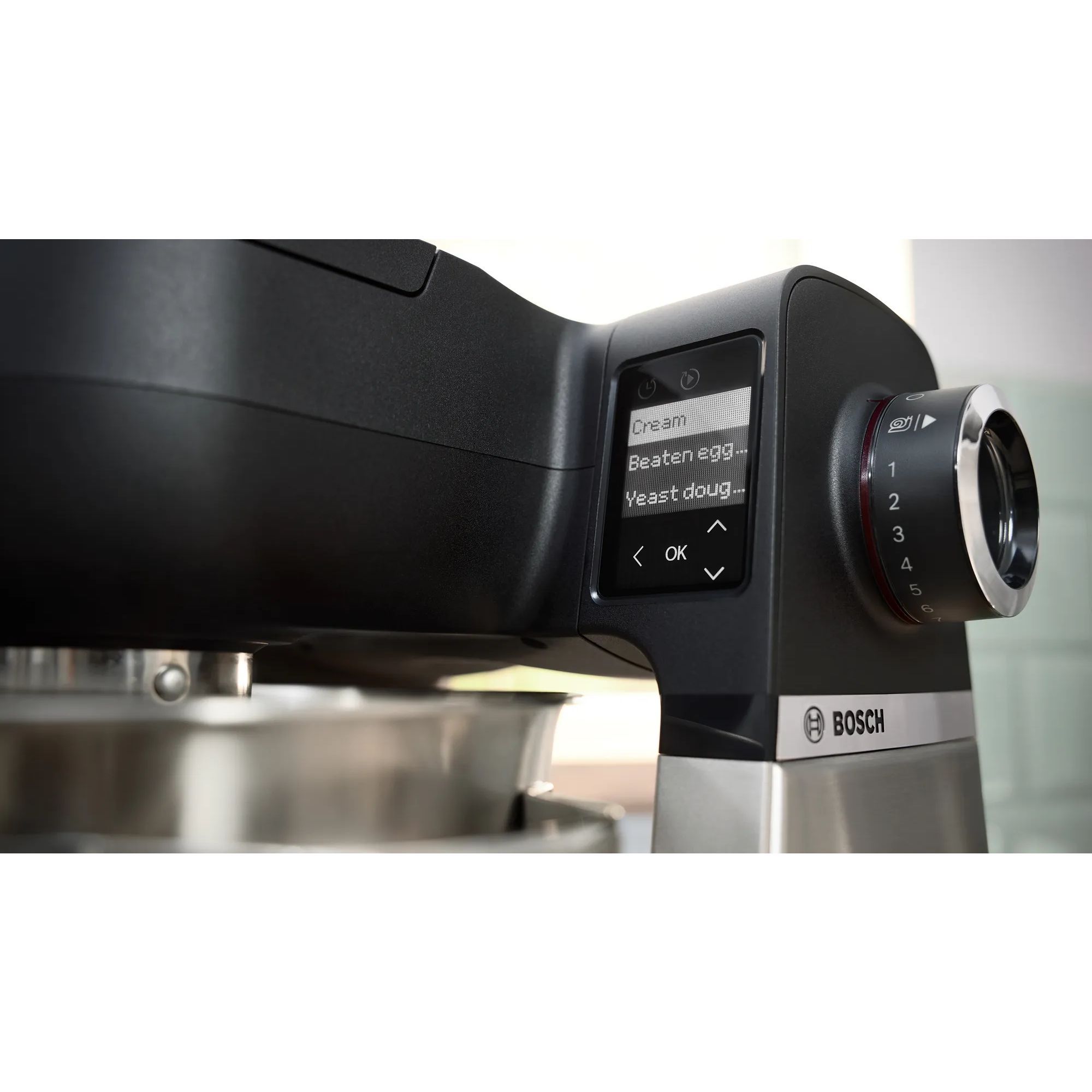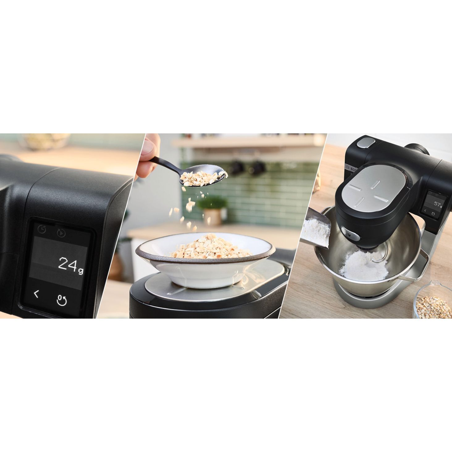 Cântar integrat - Cântărești cantitatea exactă și obții rezultate perfecte. Urmărește cu atenție pașii din rețetă și folosește doar cantitățile de care ai nevoie. Robotul de bucătărie Serie 6 cântărește cu precizie, în trepte de 1 gram. Poți și alte ingrediente, folosind unități de măsură precum ml de ulei, lapte. Poți să cântărești direct în bol sau acesoriile robotului. Cantitățile mici pot fi cântărite pe bratul de mixare, în partea de sus a robotului.