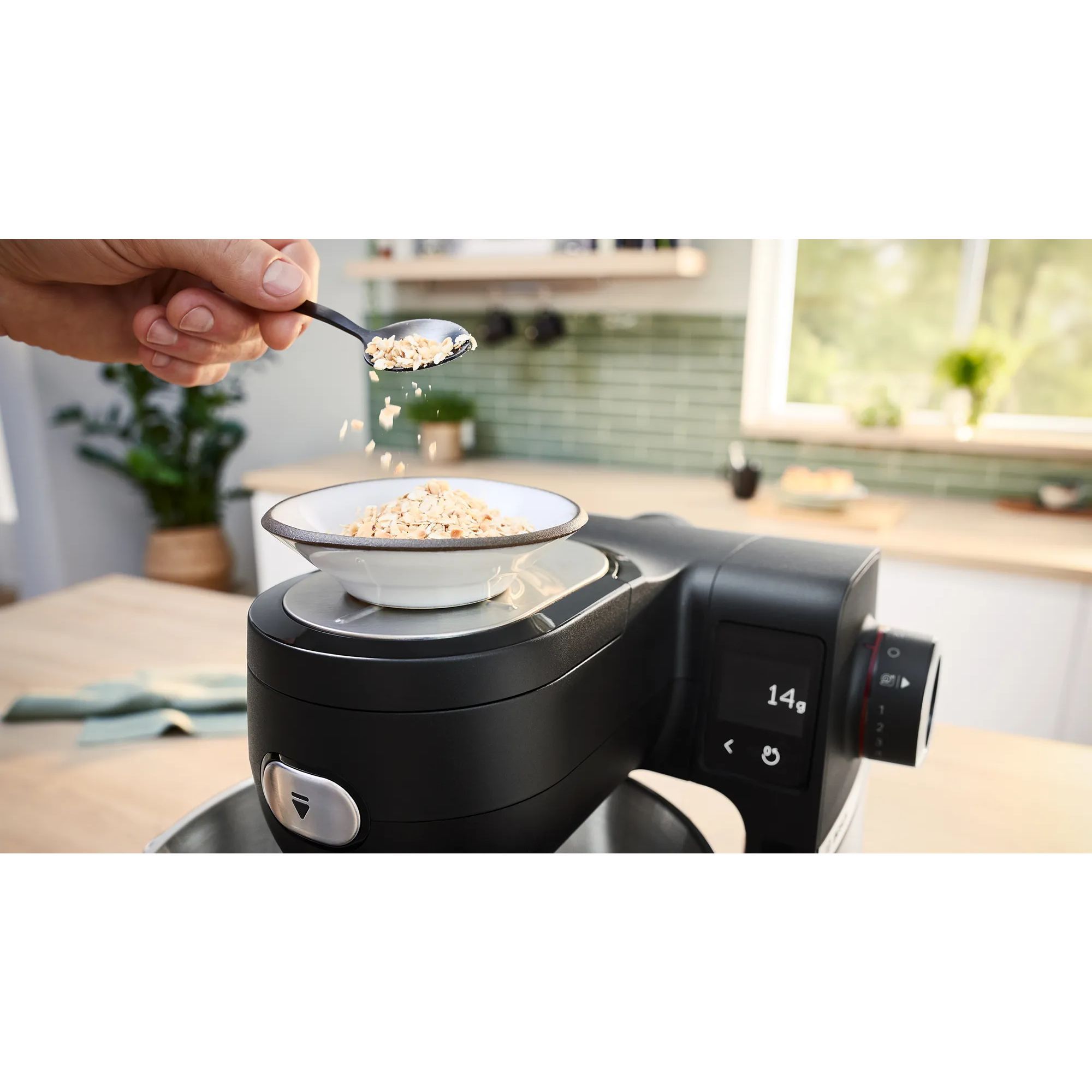 Cântar integrat: afișare de mare precizie, în trepte de 1 gram. Cântărește suplimentar ml, ml lapte, ml ulei, g, oz & lbs. Poți cântări ingredientele direct în bol sau accesorii sau direct pe robot.