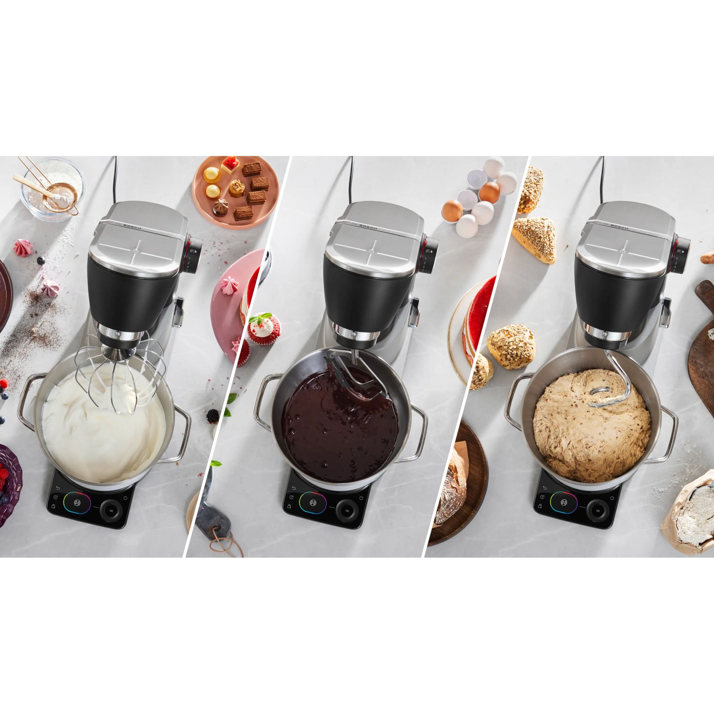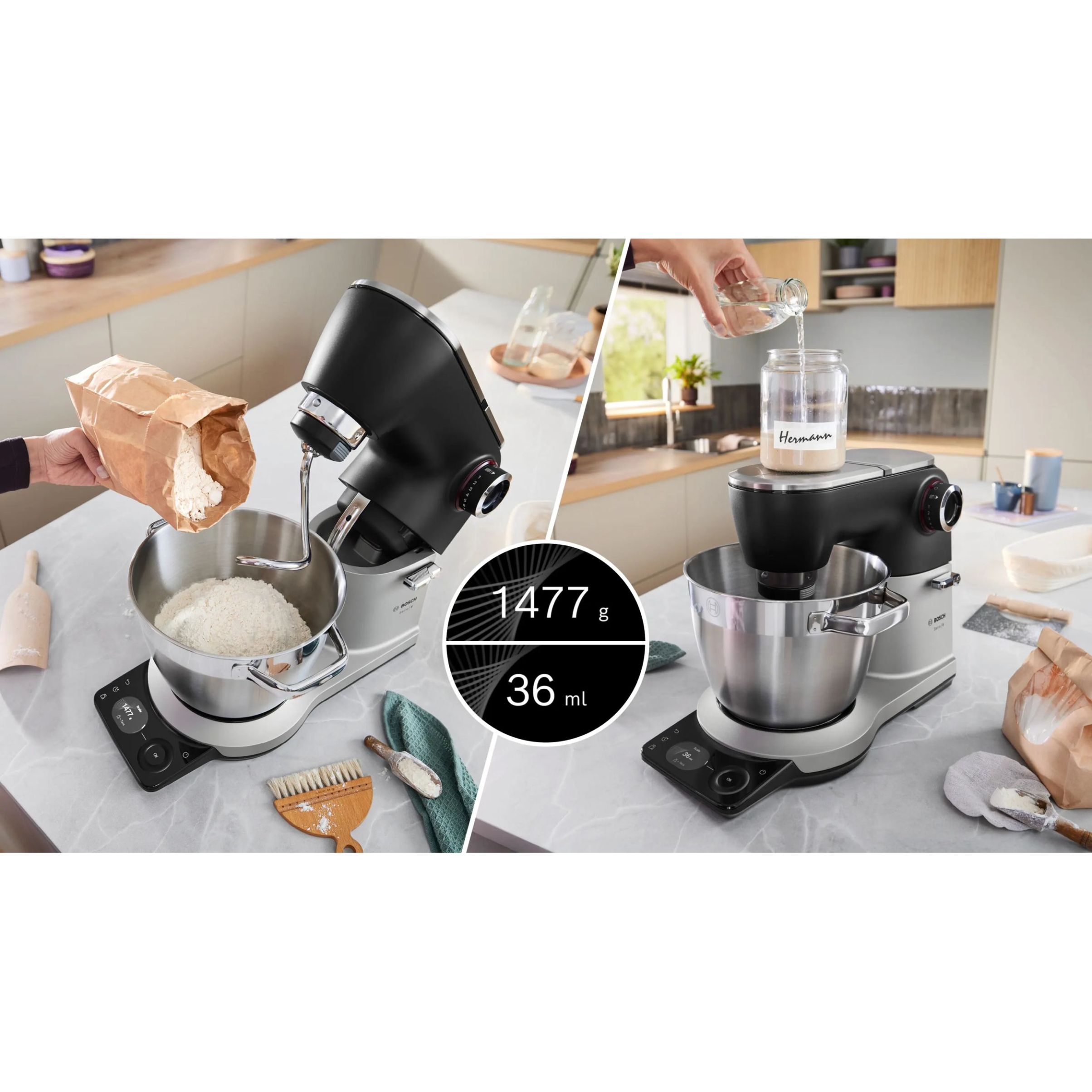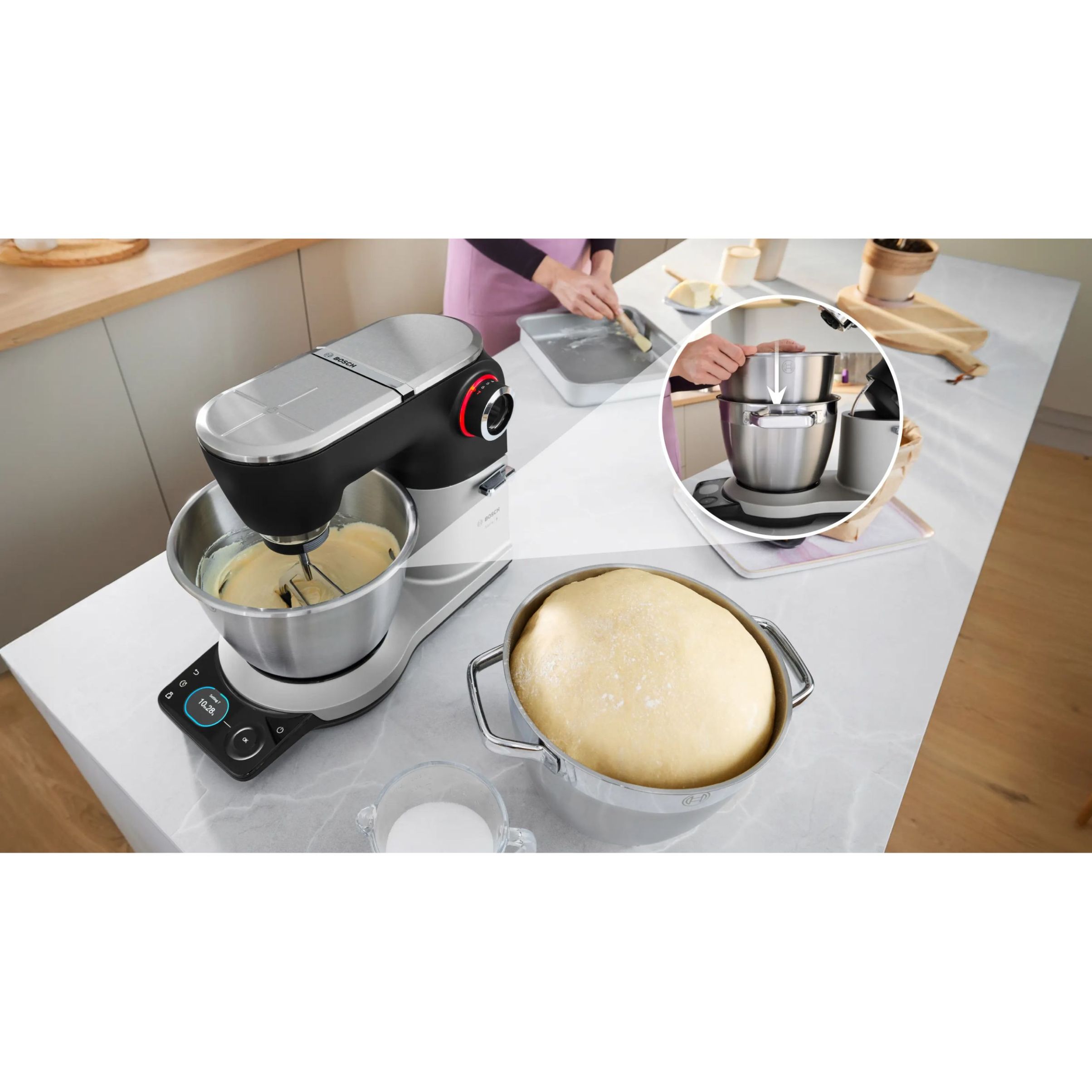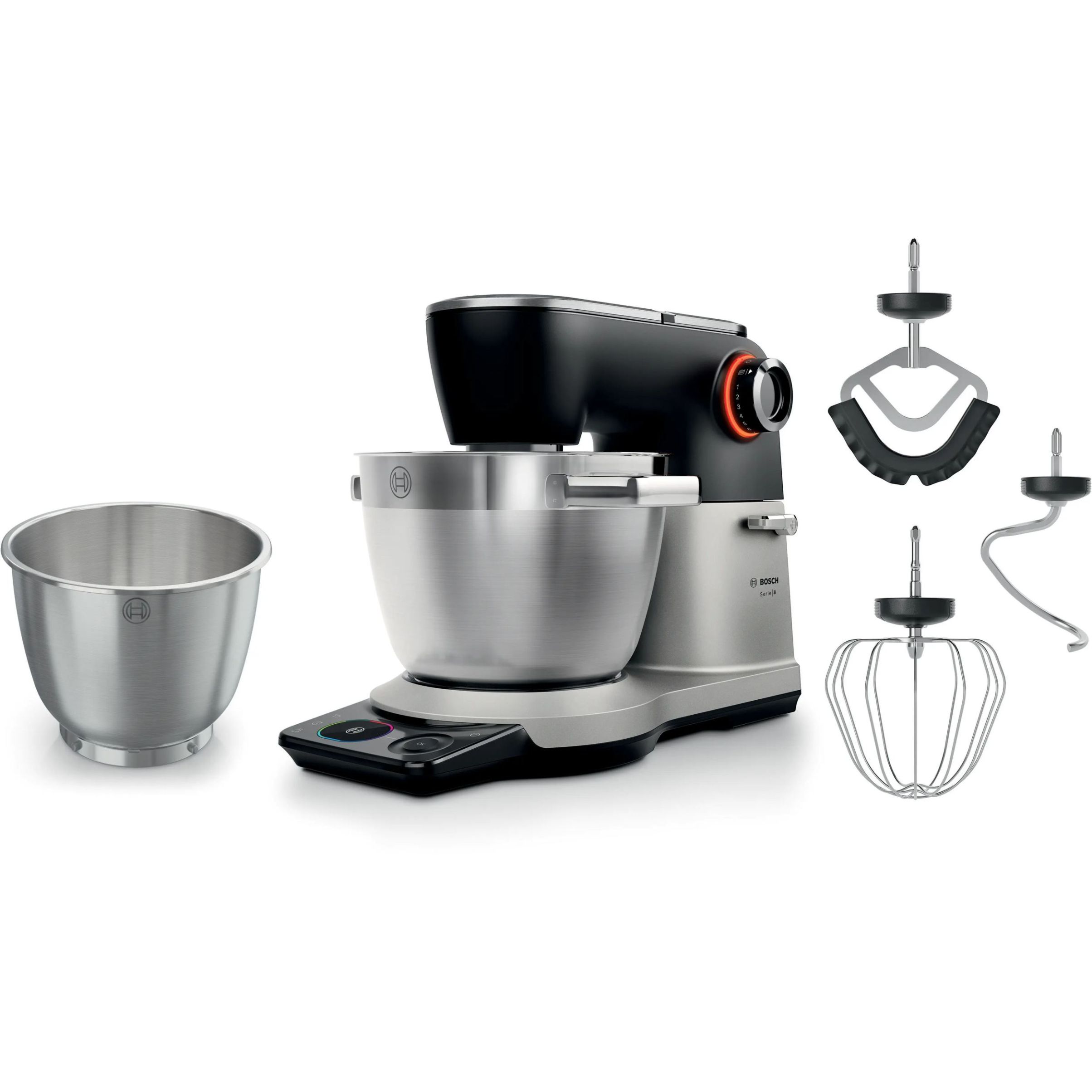Robot de bucătărie planetar BOSCH Serie 8 MUMS8 Scale MUMS8ZS18, 1800W (7 trepte), Bol inox șlefuit 6l cu mânere, Set patiserie, Cântar, Cronometru, SoftStart, AirCooling, Carcasă metalică, Pearl Silver