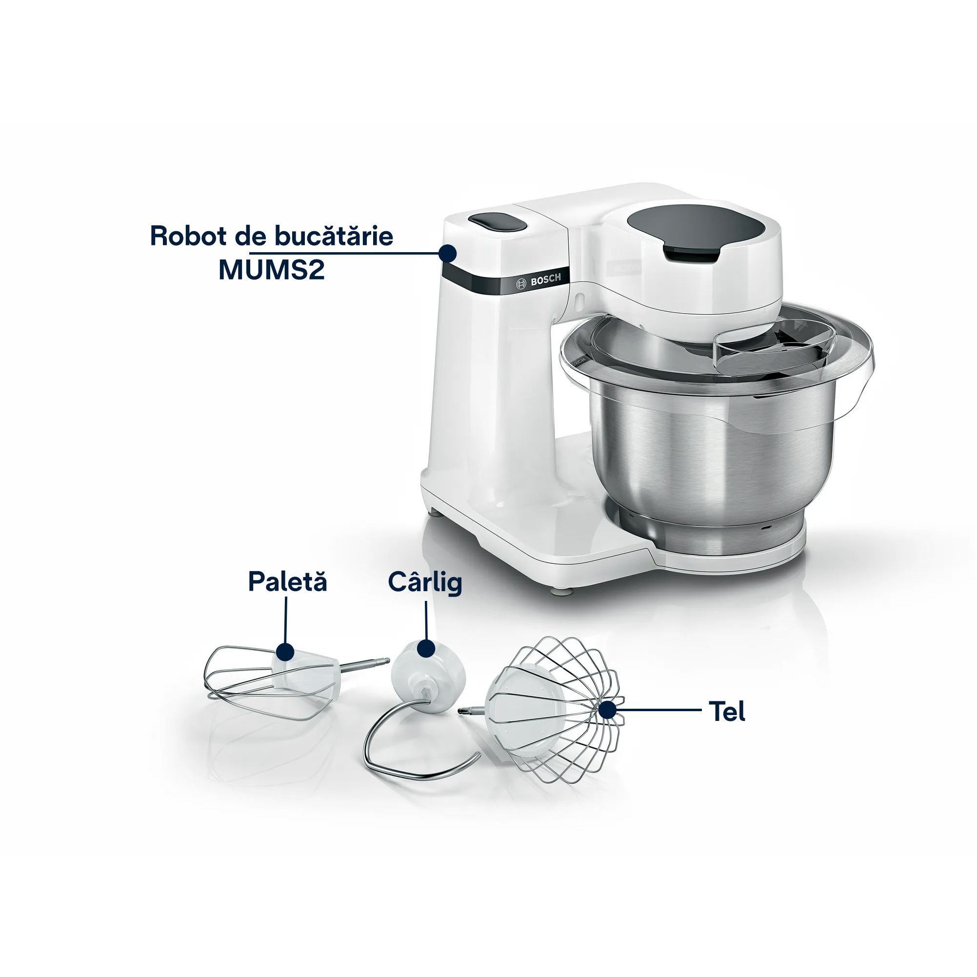 Ai accesoriile potrivite pentru o multitudine de preparate. Telul, paleta pentru amestecat și cârligul pentru frământat sunt potrivite pentru o gamă largă de utilizări asigurându-ți rezultate perfecte. Cu aceste accesorii poți să prepari cu ușurință meringue, amestec pentru prăjituri șau aluaturi grele. Aceste accesorii pot fi spălate în mașina de spălat vase.