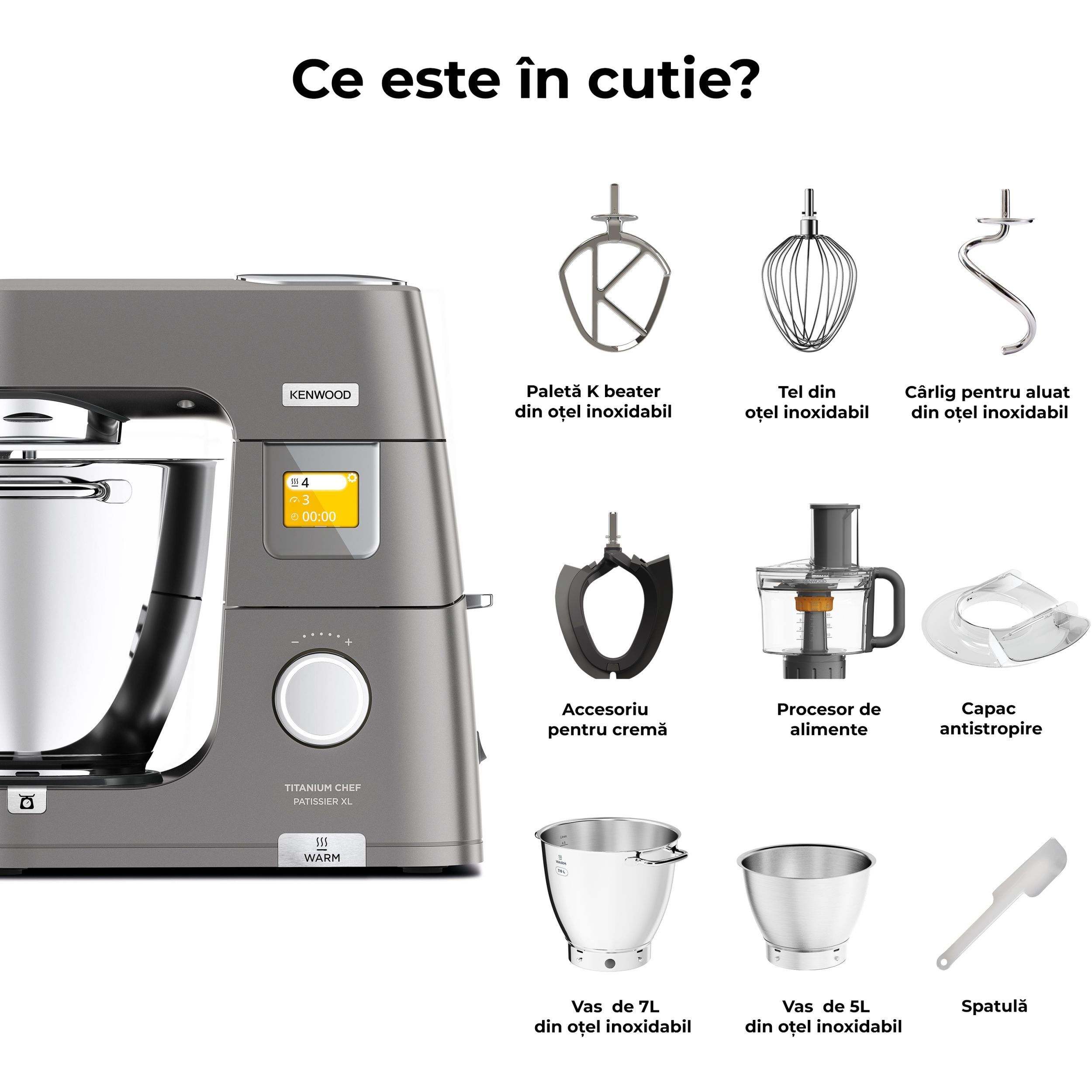 Robot de bucătărie planetar KENWOOD Titanium Chef Patissier XL KWL90.244SI - 0W20011485, 1400W, 6 funcții presetate, 2 vase 7 l/ 5 l, Procesor alimente, Cântar integrat, Sistem de încălzire, Touch screen