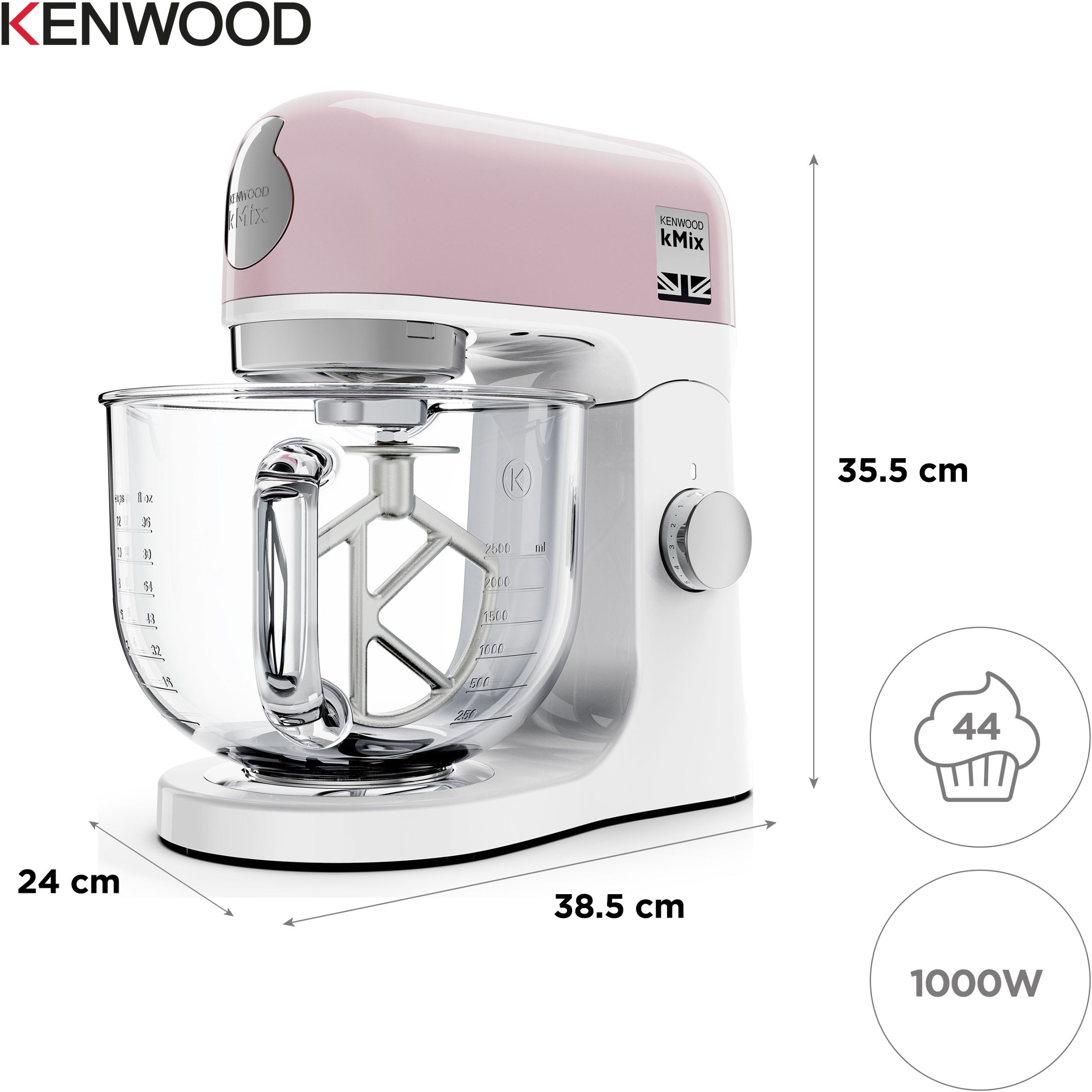 Robot de bucătărie planetar KENWOOD kMix KMX754APP - 0W20011489, 1000W (6 trepte și Turbo), Vas sticlă 5l, Set patiserie (tel 16 brațe, cârlig, paletă K), Soft Start, G11.19kg, Pastel Pink