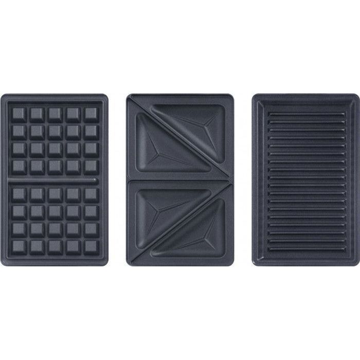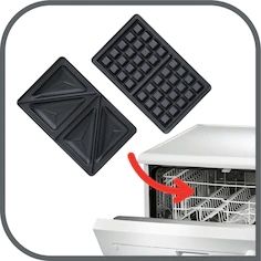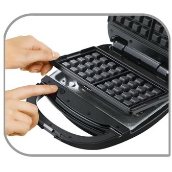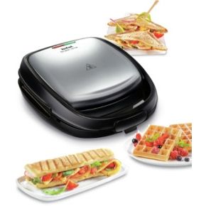 Combinând două tipuri de plăci, una pentru gofre și alta pentru sandwich-uri triunghiulare, acest produs face momentul servirii unei gustări o plăcere.