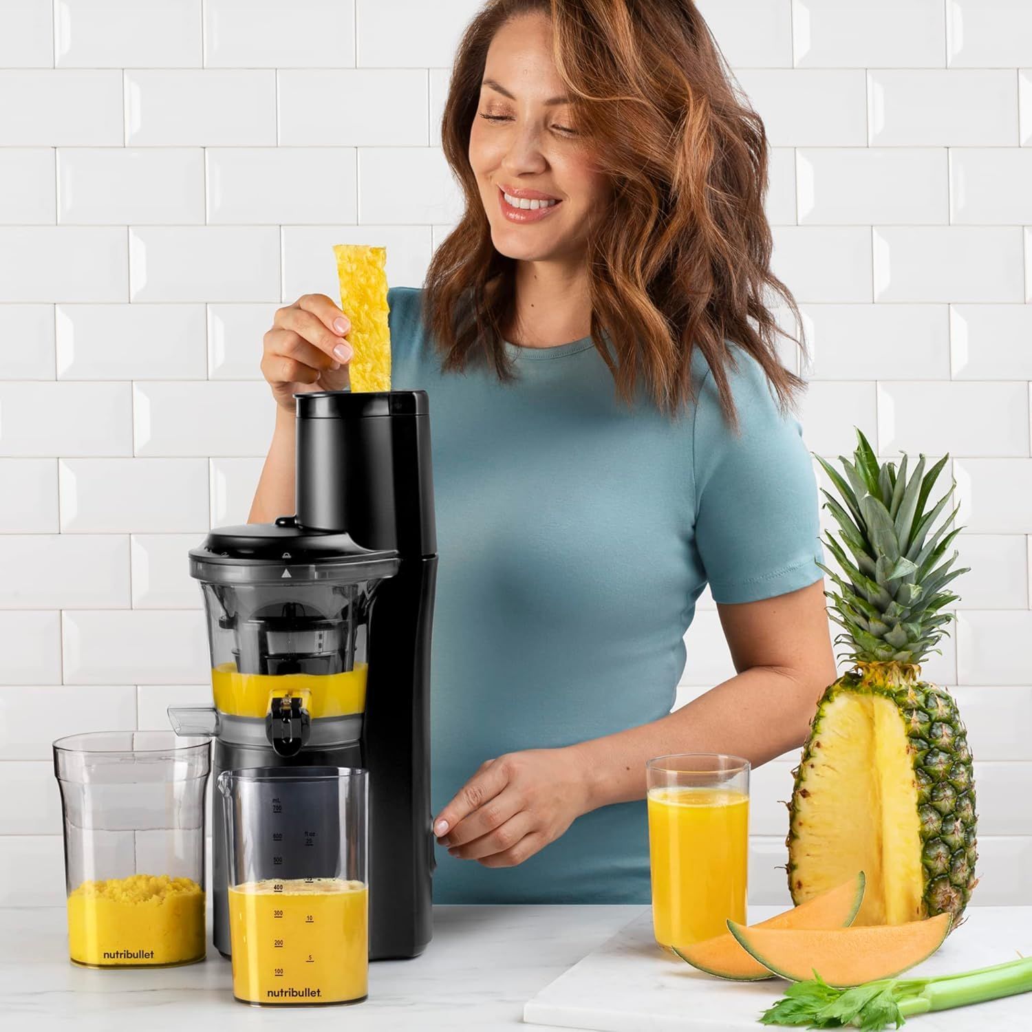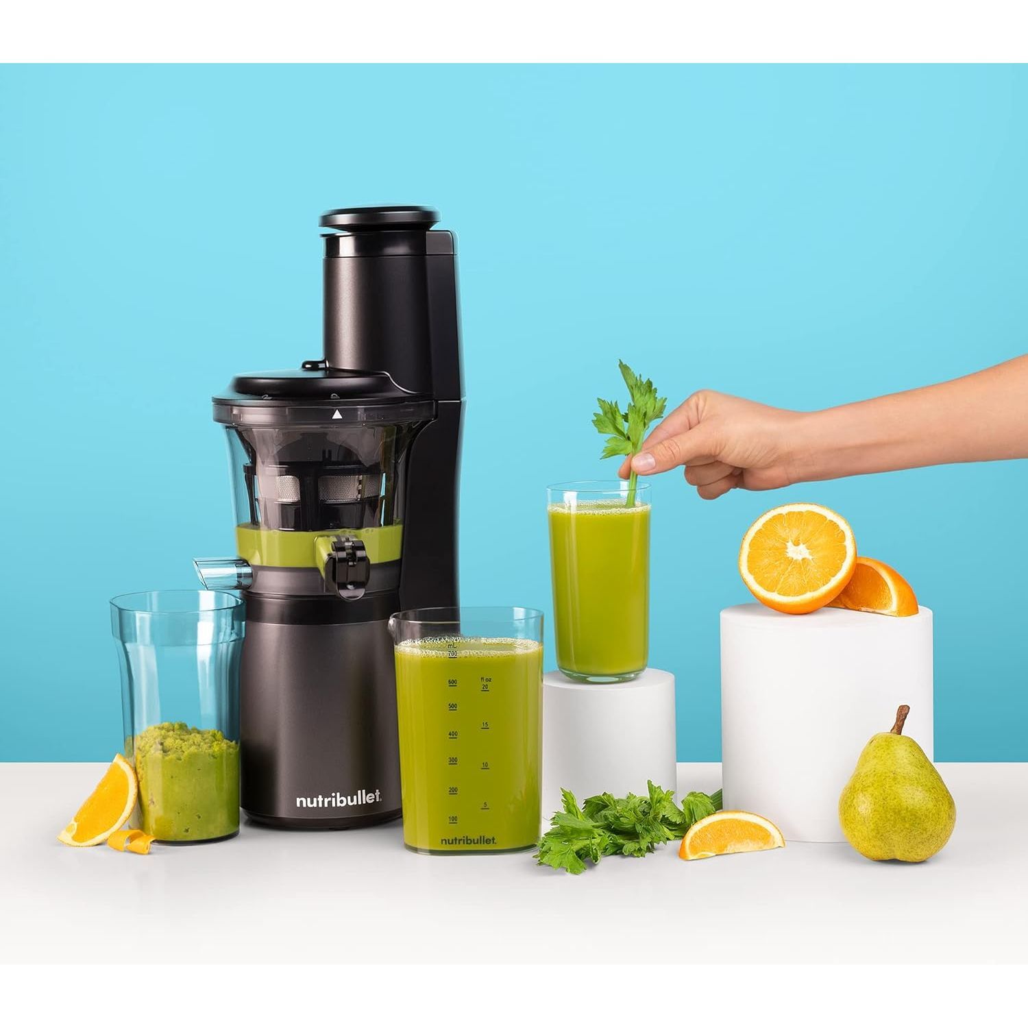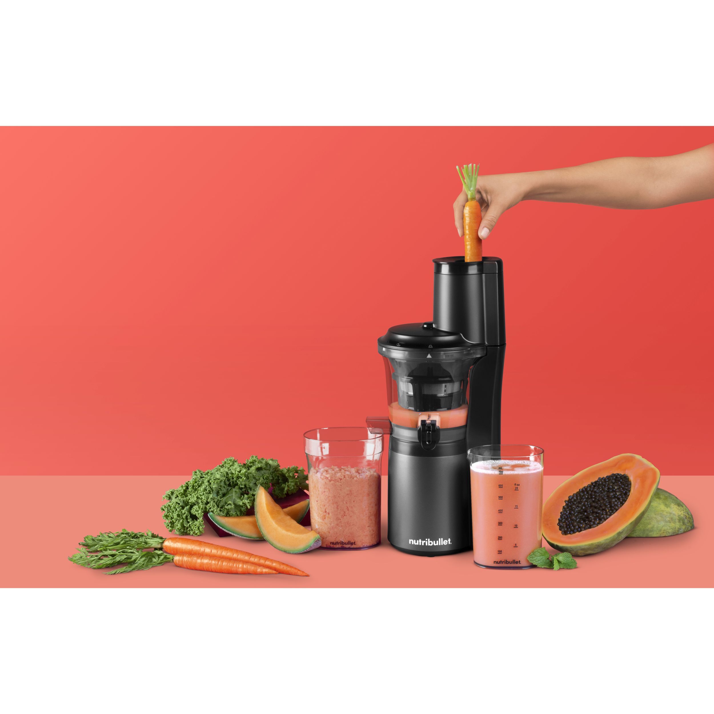 Storcătorul nutribullet cu presare la rece este gândit pentru o utilizare intensă, așa că nu te lăsa păcălit de dimensiunea compactă a produsului. Tubul de alimentare de 7.6cm procesează bucăți mari de fructe și legume. Motorul puternic, cu cuplu mare și viteză redusă activează axul tip melc cu vârf din oțel inoxidabil, pentru ca tu să te bucuri de toți nutrienții din alimente. Produsul dispune de o gură anti-picurare care păstrează sucul proaspăt până când îl torni în pahar. În plus, stoarcerea lentă este și silențioasă, un aspect pe care ceilalți membri ai familiei cu siguranță îl vor aprecia. Include: