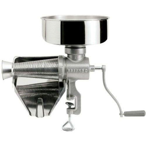 Storcătorul pentru rosii cu acționare manuală, model nr. 5 Reber 8502 N. Este realizat din fontă tratată pentru uz alimentar și echipat cu manivelă pentru acționare manuală, iar conul filtrului,pâlnia și picuratorul sunt realizate din inox alimentar AISI 304. Manivelă din oțel cu mâner de plastic. Clema de fixare de masa cu protecție din cauciuc. Este potrivit pentru prepararea sosului de tomate, gemuri, sucuri de fructe.