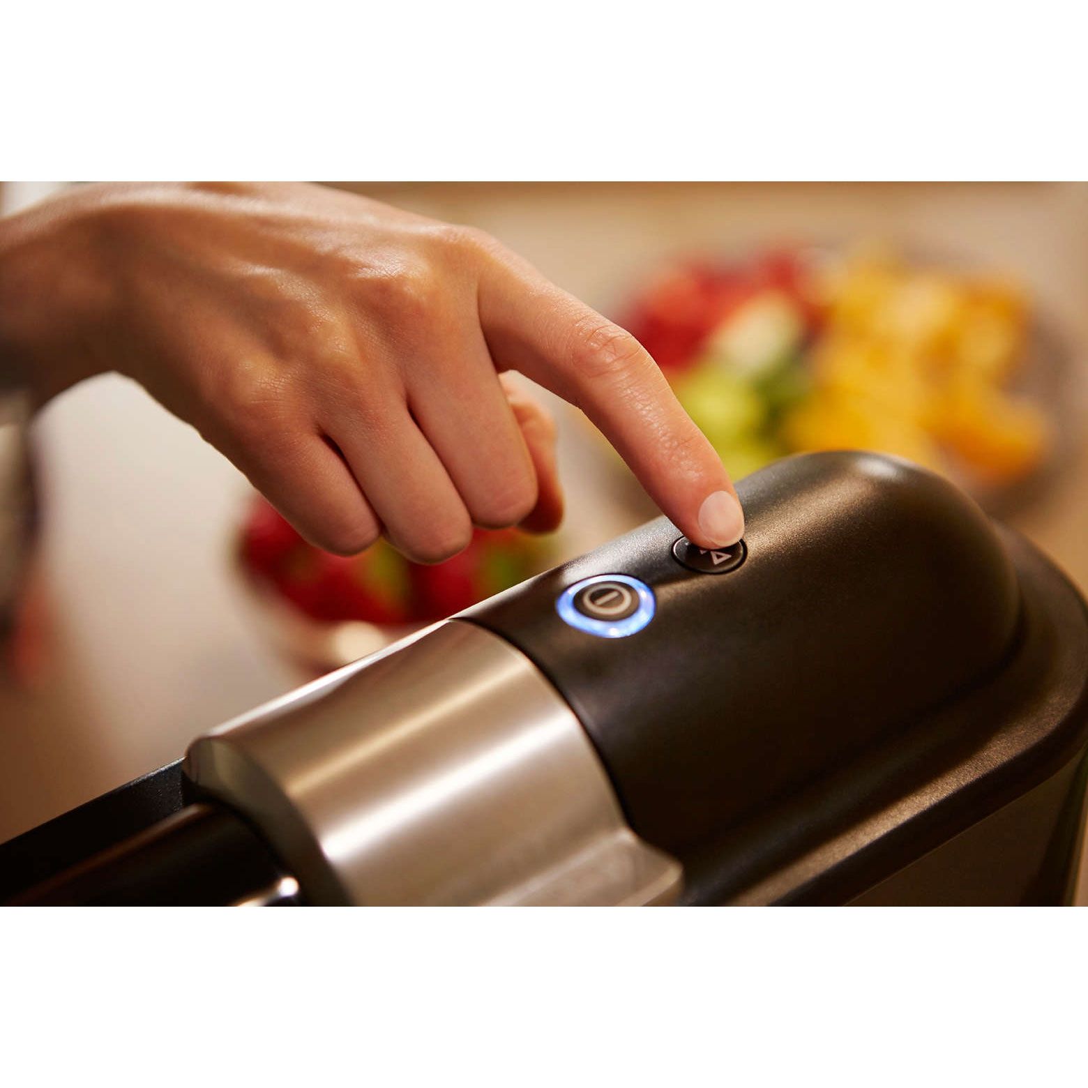 Storcător subţire cu toate piesele integrate. Designul optimizat cu lăţime de 11 cm îţi permite să ţii storcătorul pe blat tot timpul, fiind, astfel, pregătit pentru sucuri. Ocupă foarte puţin spaţiu atunci când este depozitat, dar şi când este folosit, pentru că este complet integrat, aşa că nu ai nevoie de compartimente externe atunci când prepari suc.