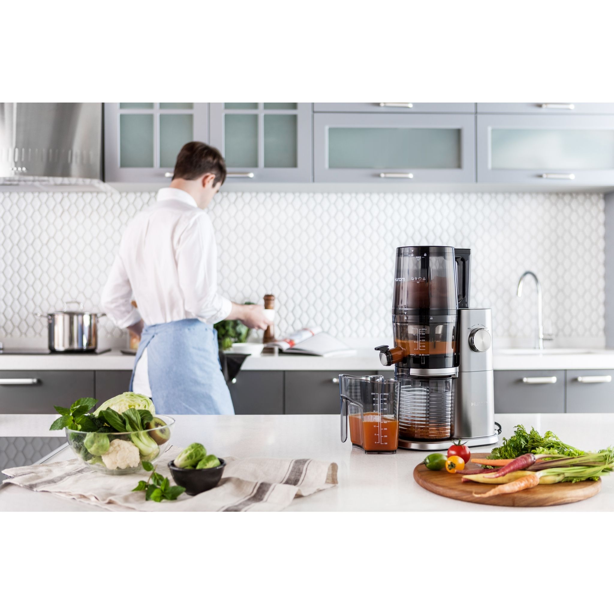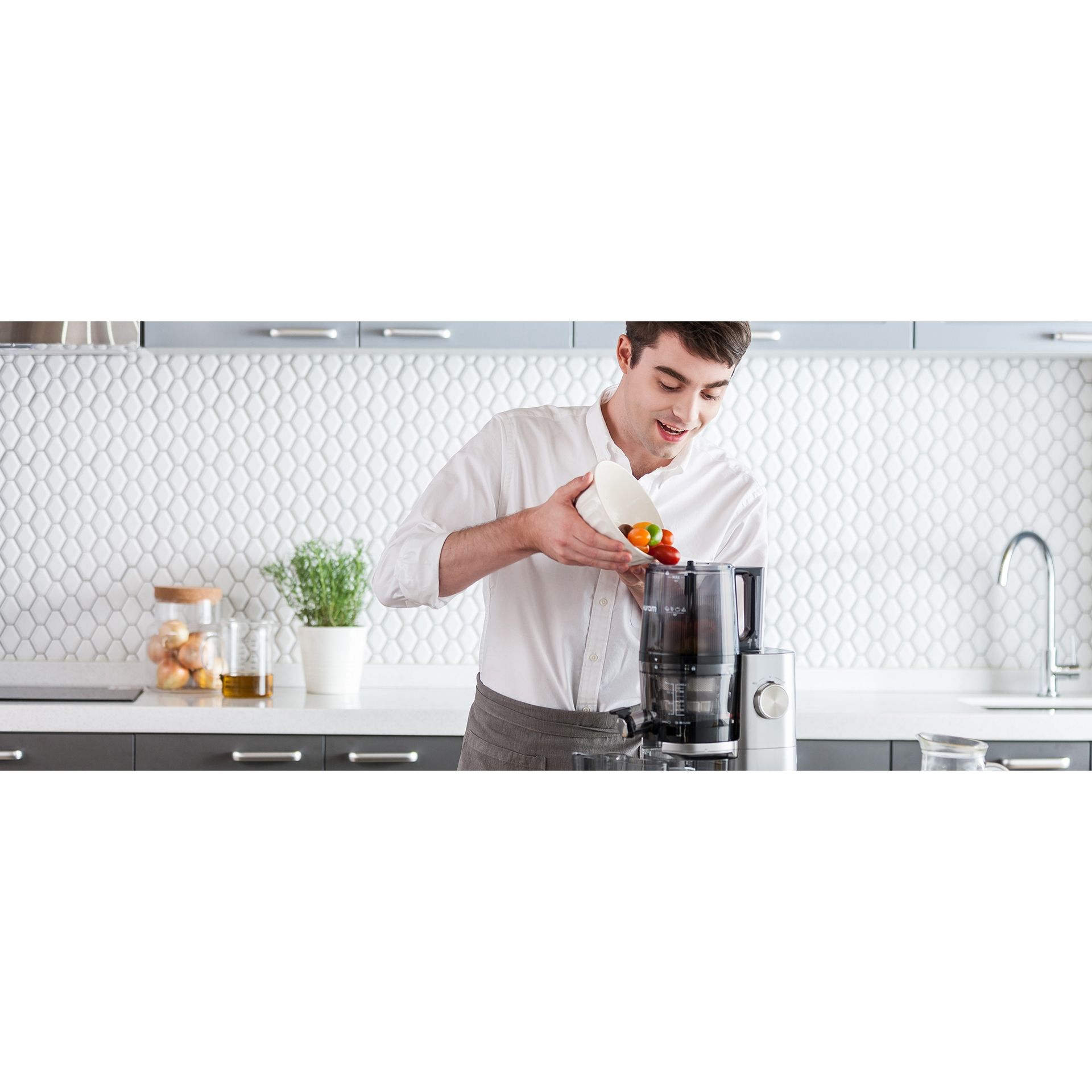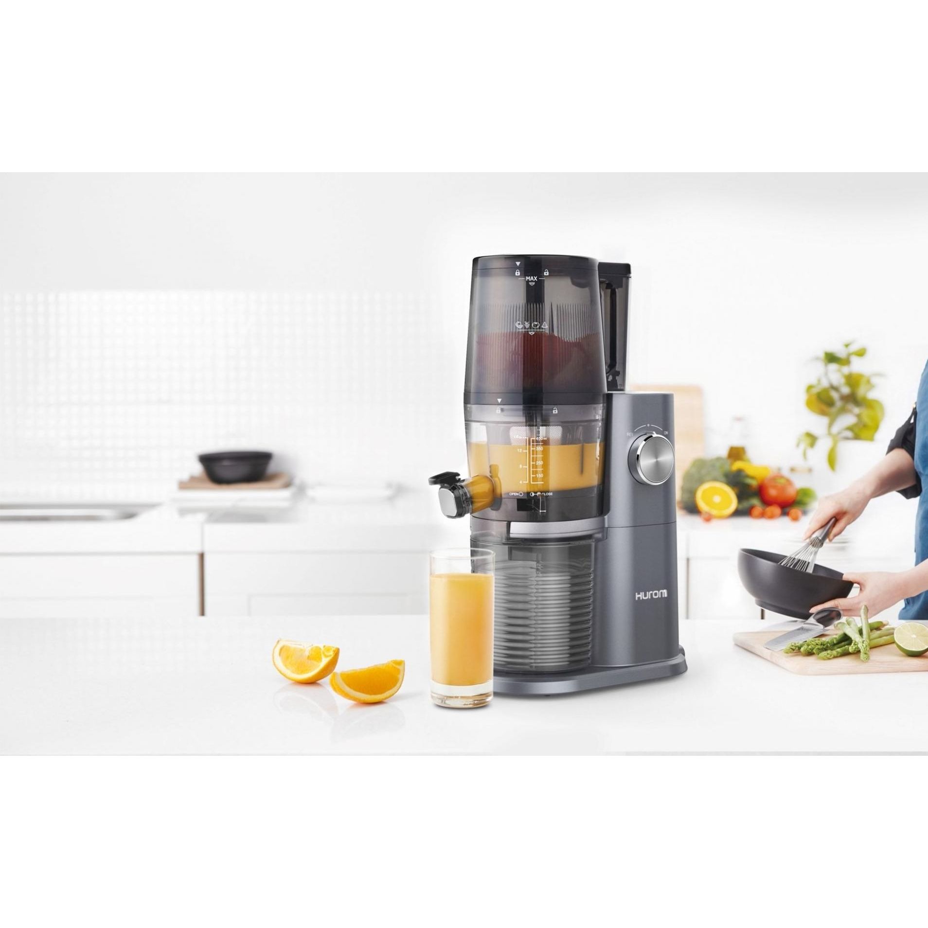 Brandul Hurom înseamnă excelență în domeniul storcătoarelor lente, prin presare la rece. Cu peste 40 de ani de experiență pe acest segment de piață și tehnologie patentată Slow Squeezing System care a revoluționat modul în care se obțin sucurile prin presare la rece, fără frecare și fără a trece ingredientele printr-un proces termic care afectează conținutul nutritiv, Cei de la Hurom au reușit să creeze o adevarată capodoperă a electrocasnicelor cu seria Hurom H-AI One Stop.