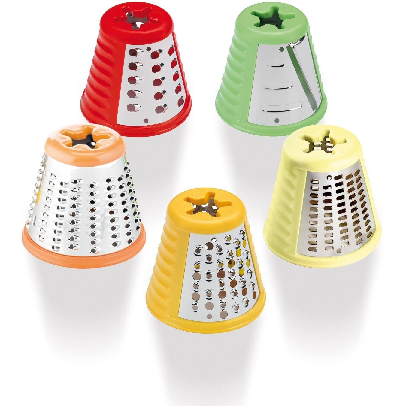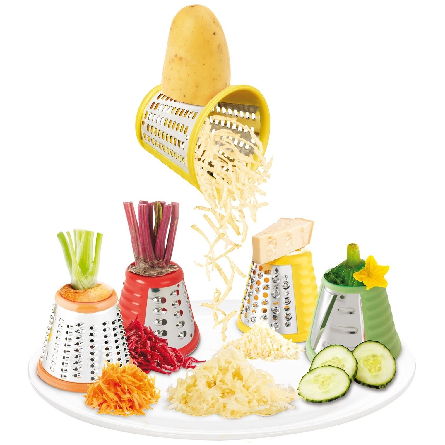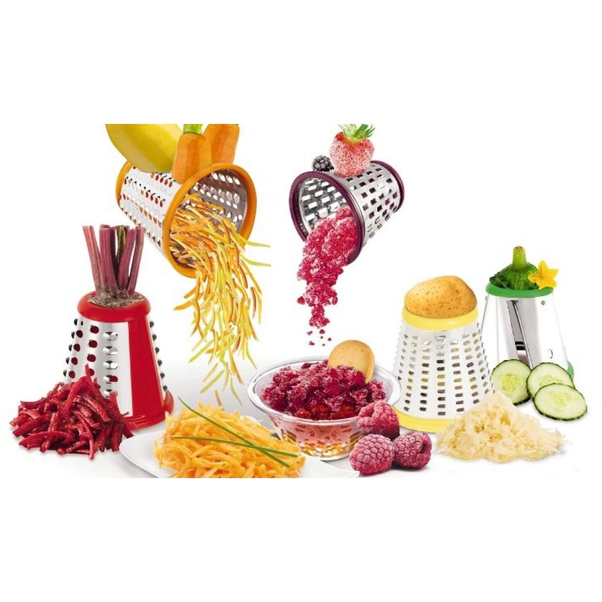 ●Datorită celor 5 conuri integrate, Fresh Express + vă permite să răzuiţi, să feliaţi, să tocaţi sau să tăiaţi în forme ondulate legumele, fructele, brânza sau ciocolata direct pe farfurie, gata pentru a fi servite! Conurile au culori diferite pentru a vă ajuta să îl alegeţi dintr-o privire exact pe cel pe care îl doriţi, adăugând în acelaşi timp o pată de culoare în bucătăria dumneavoastră. În plus, Fresh Express + are un tub de alimentare larg, ceea ce înseamnă că nu trebuie nici măcar să tăiaţi legumele în prealabil!