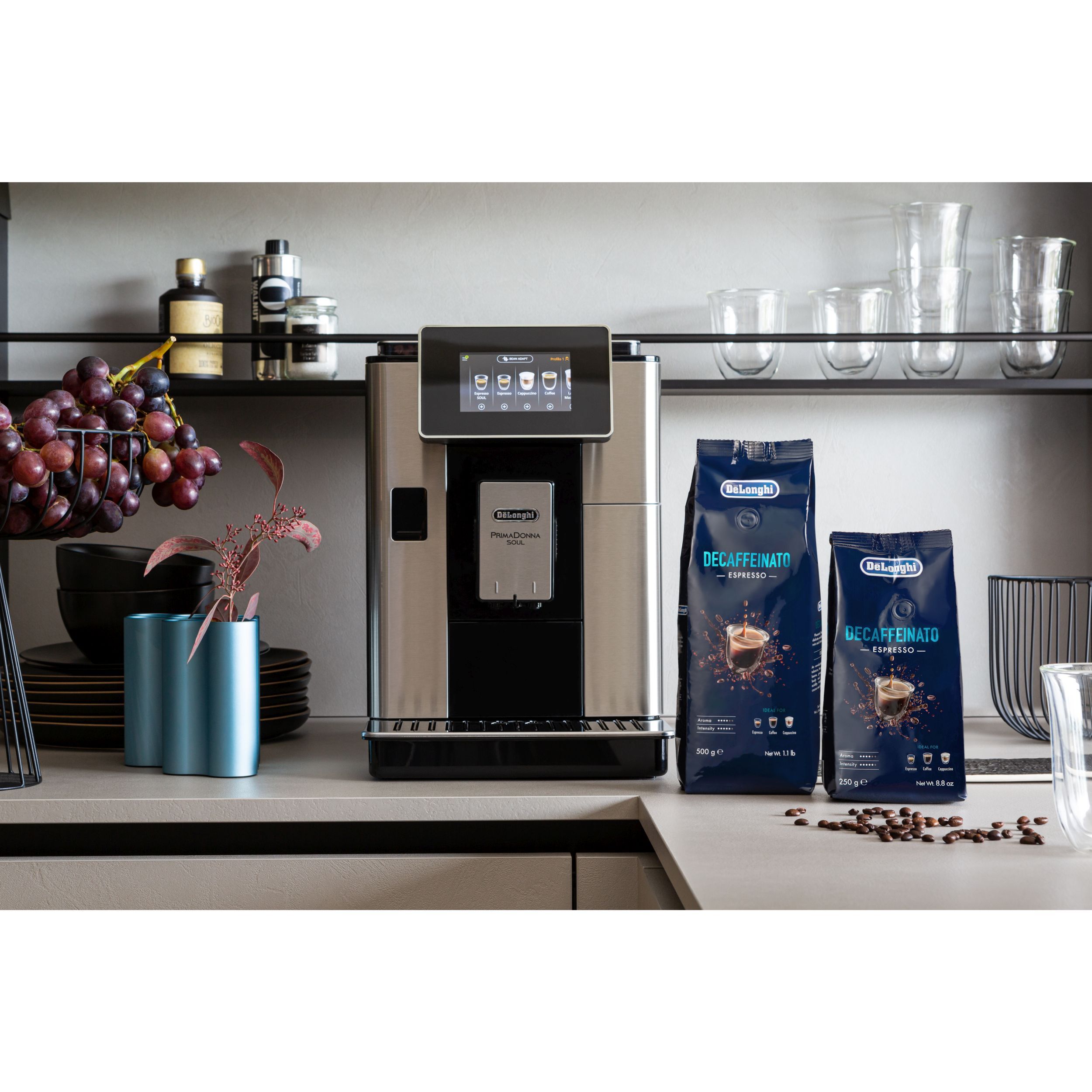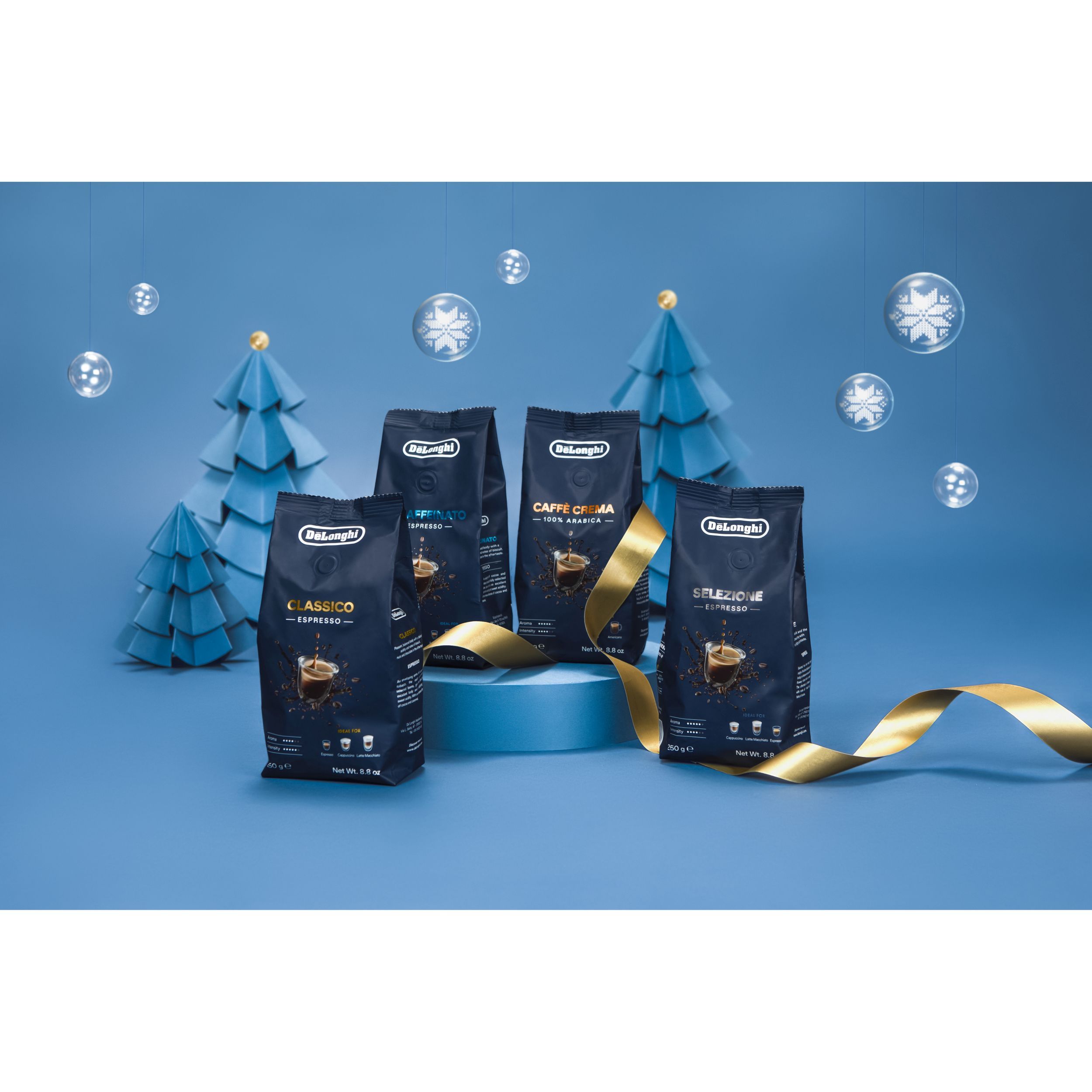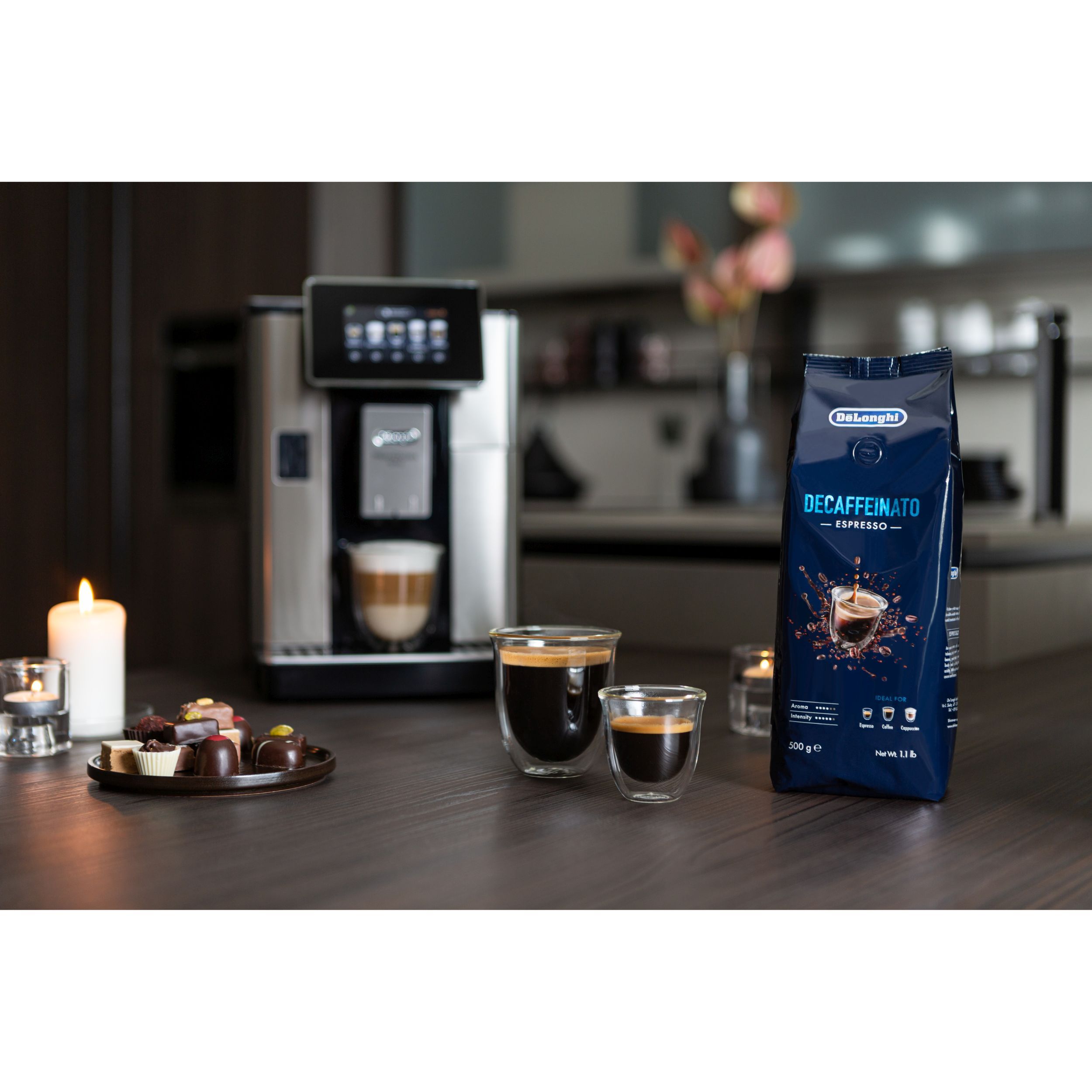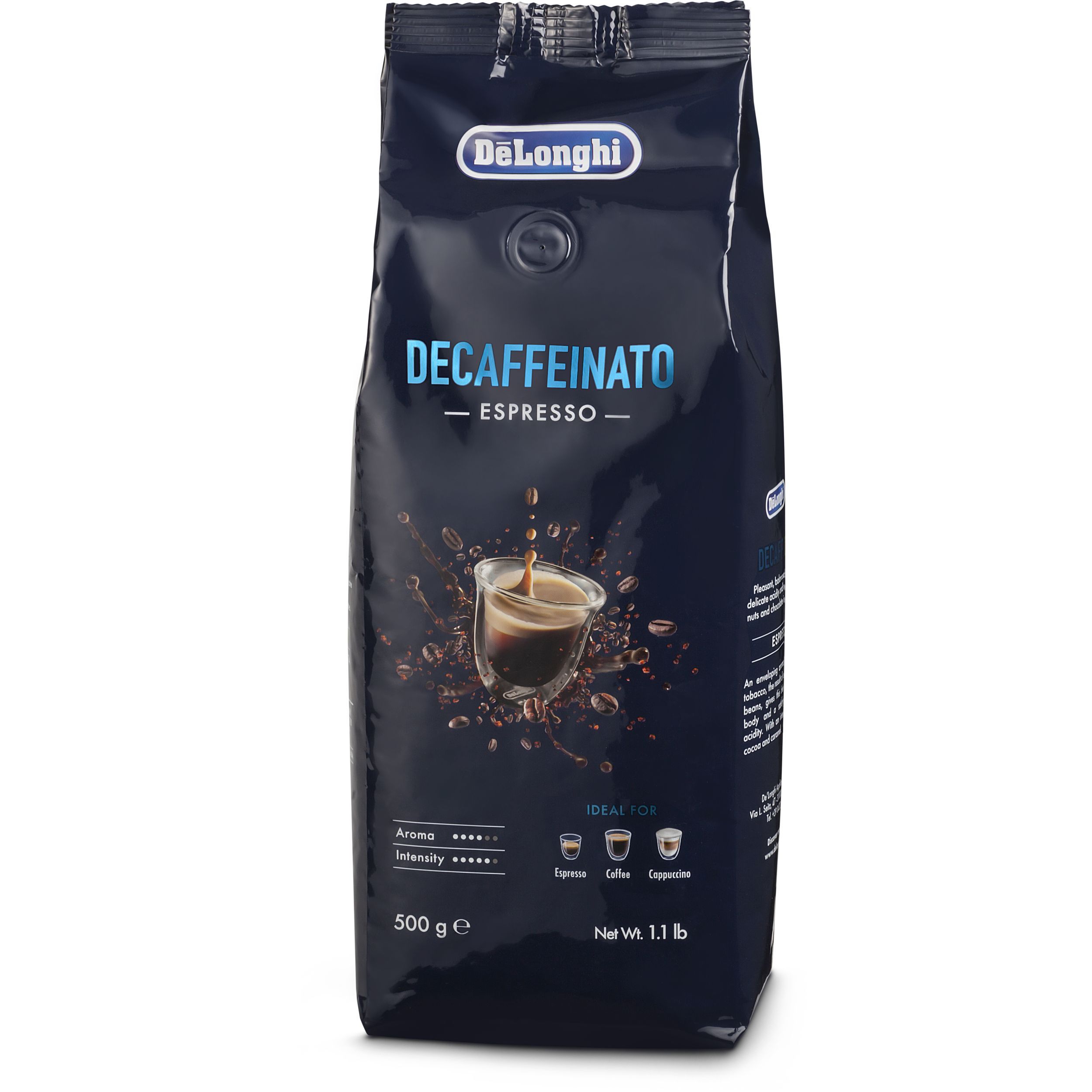 De'Longhi Decaffeinato este un amestec delicios de boabe 50% Arabica și 50% Robusta, decofeinizată printr-un proces natural folosind CO2. Această cafea cu prăjire medie, bogată, dulce are un corp echilibrat, plăcut cu aciditate delicată, cu un postgust intens de cacao și caramel. Selectată cu grijă pentru prepararea cafelei, espresso-ului sau cappuccino-ului perfect.