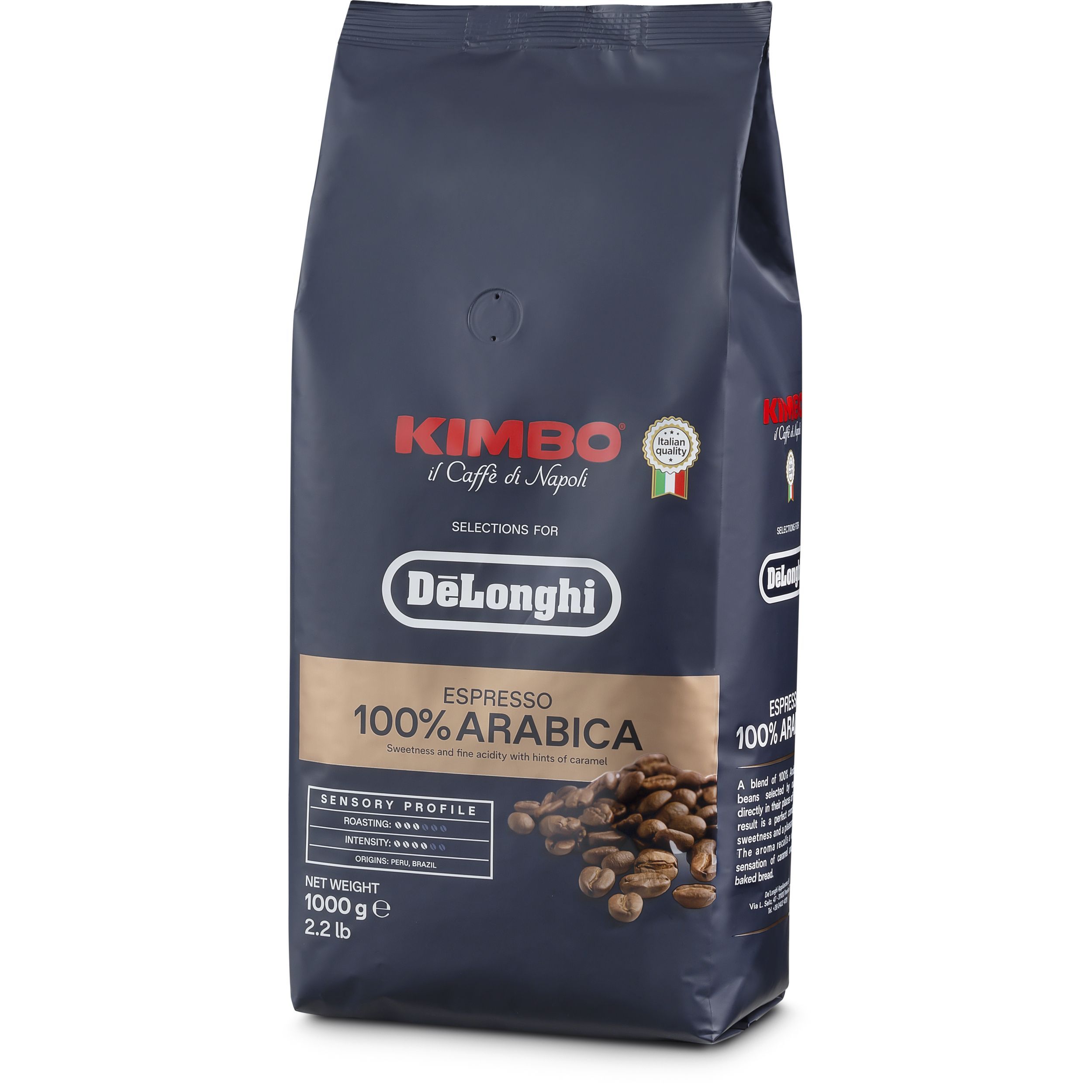 Kimbo 100% Arabica, selecție specială pentru De'Longhi, este o cafea cu un nivel de prăjire mediu, din America Centrală și de Sud. Savurează băutura preferată în timp ce ești învăluit într-o aromă plăcută, cu note de pâine proaspăt coaptă. Dulceața delicată și aciditatea fină sunt completate de notele de caramel, cu intensitate plăcută.