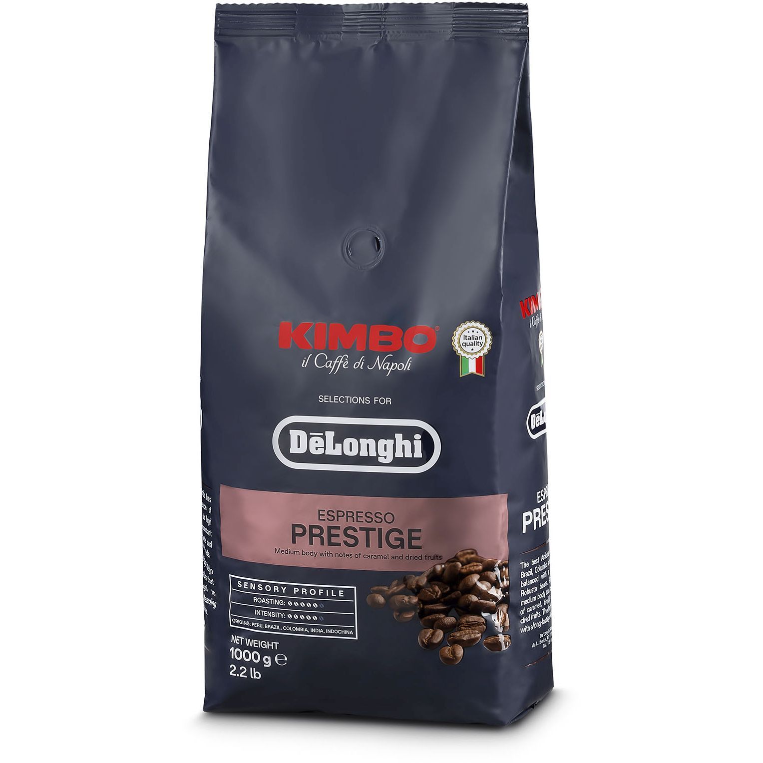 Kimbo pentru De'Longhi Prestige este un amestec fin de 65% Arabica și 35% Robusta, cu origini în America Centrală și de Sud și Asia. Această prăjire medie intensă oferă note de caramel și fructe uscate, cu o aromă puternică, învăluitoare și un postgust plăcut condimentat. Bucurați-vă de gustul proaspăt al unei cafele preparată acasă, din boabe întregi de cafea.