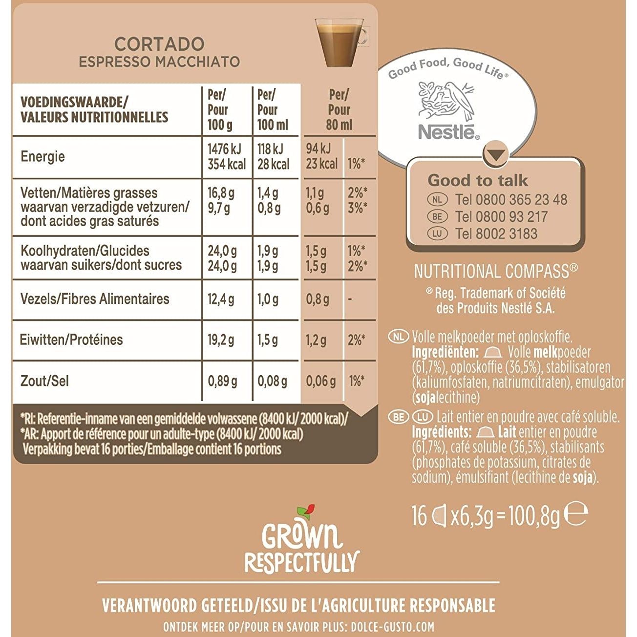 Consistență bogată, o specialitate de cafea absolut delicioasă ce își trage rădăcinile din Spania, NESCAFÉ Dolce Gusto  Cortado este un espresso macchiato ce conține un amestec distinct, bogat și intens de espresso classic și lapte ce îi adaugă extra savoare, fiind perfectă în orice moment al zilei și absolut necesară în orice colecție de specialități de cafea.