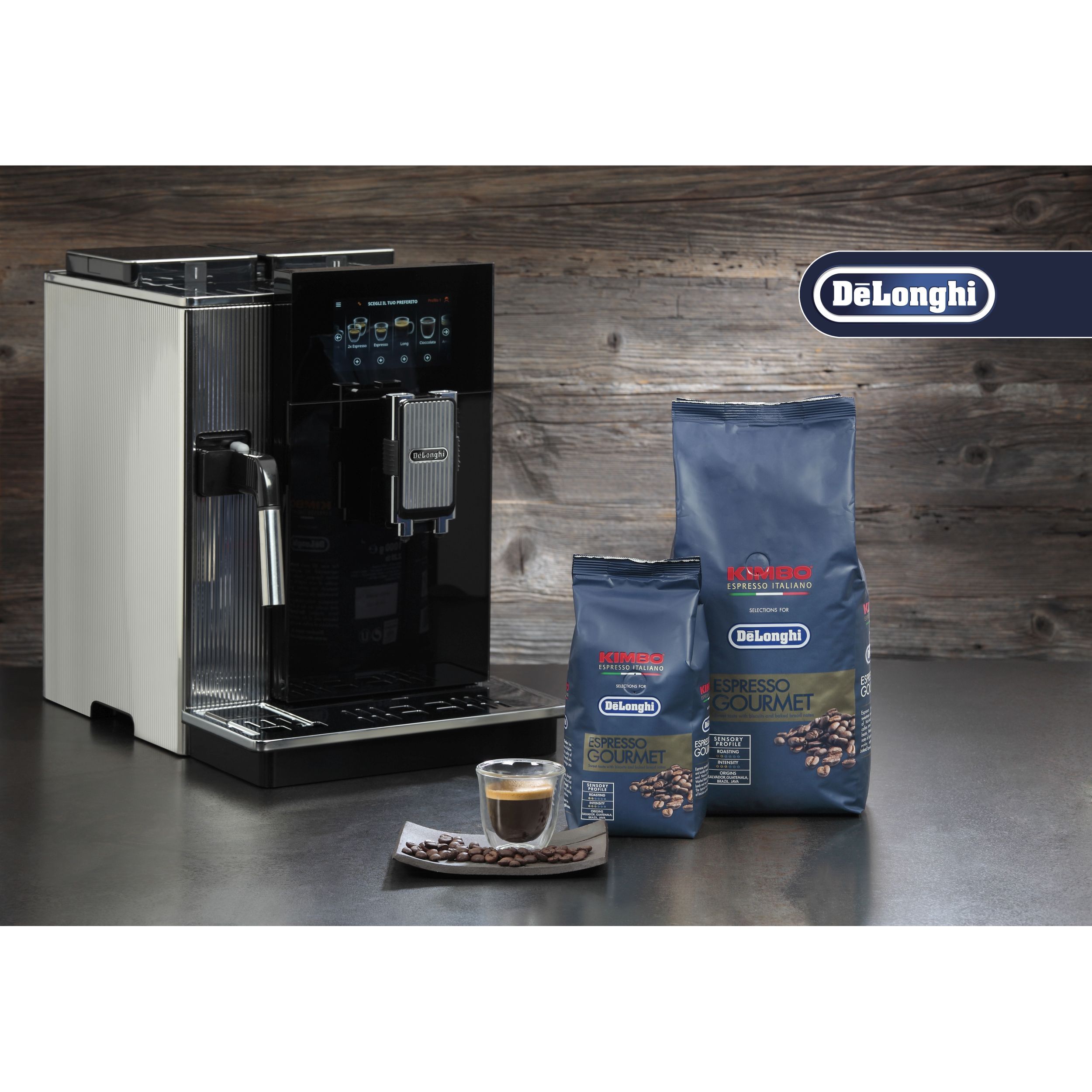 • Conține 4 sortimente de boabe de cafea KIMBO de 250 g și 2 pahare Espresso elegante.