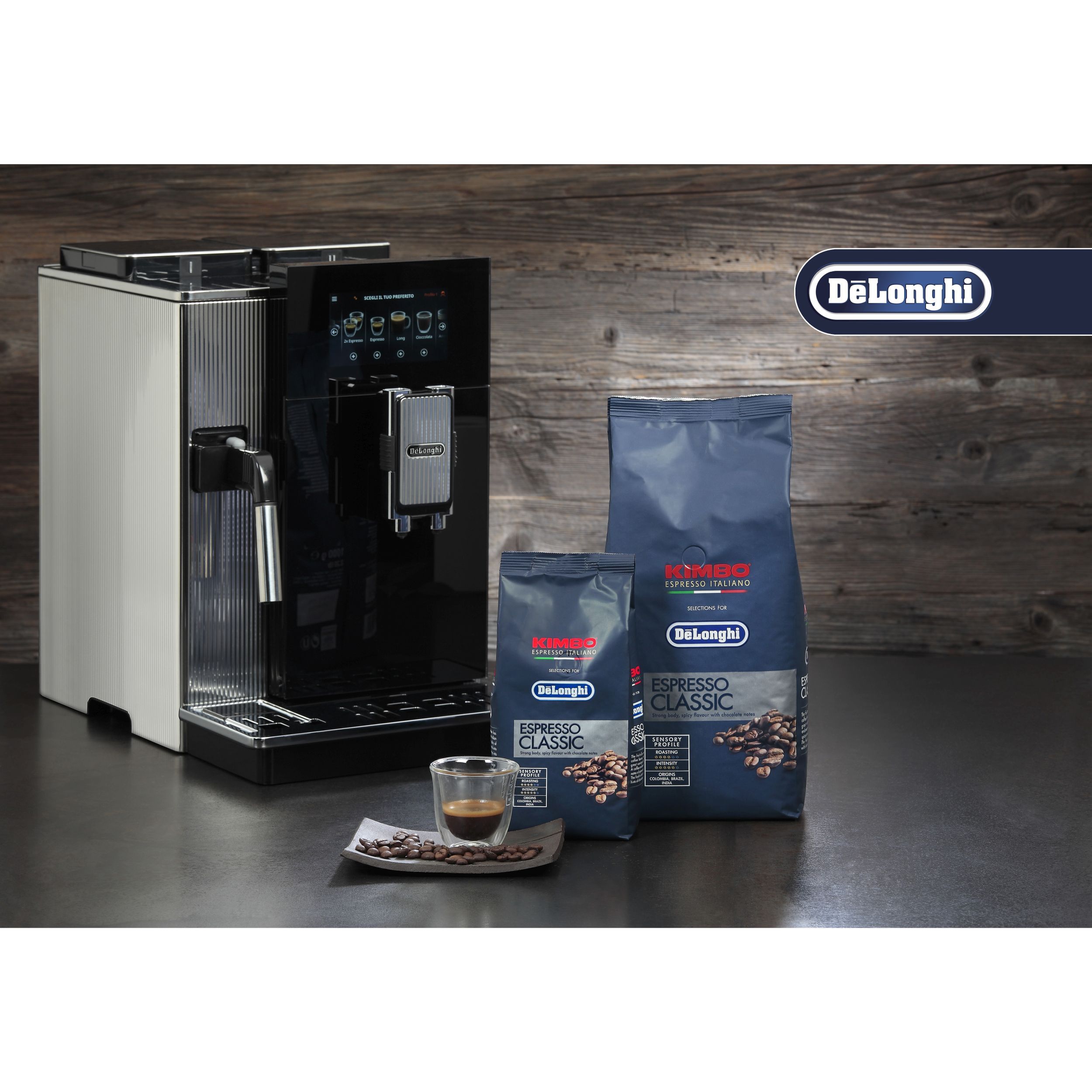 Setul de degustare a cafelei "KIMBO Selections for De'Longhi" conține soiuri de boabe atent alese din America Centrală, America de Sud și Asia. De la un mix 100% Arabica la amestecuri fine de Arabica și Robusta, există ceva care să se potrivească gusturilor fiecăruia. Și cu cele 2 pahare espresso incluse (echivalent DLSC310), poți servi cafea de la bob la ceașcă cu stil, din confortul casei tale.