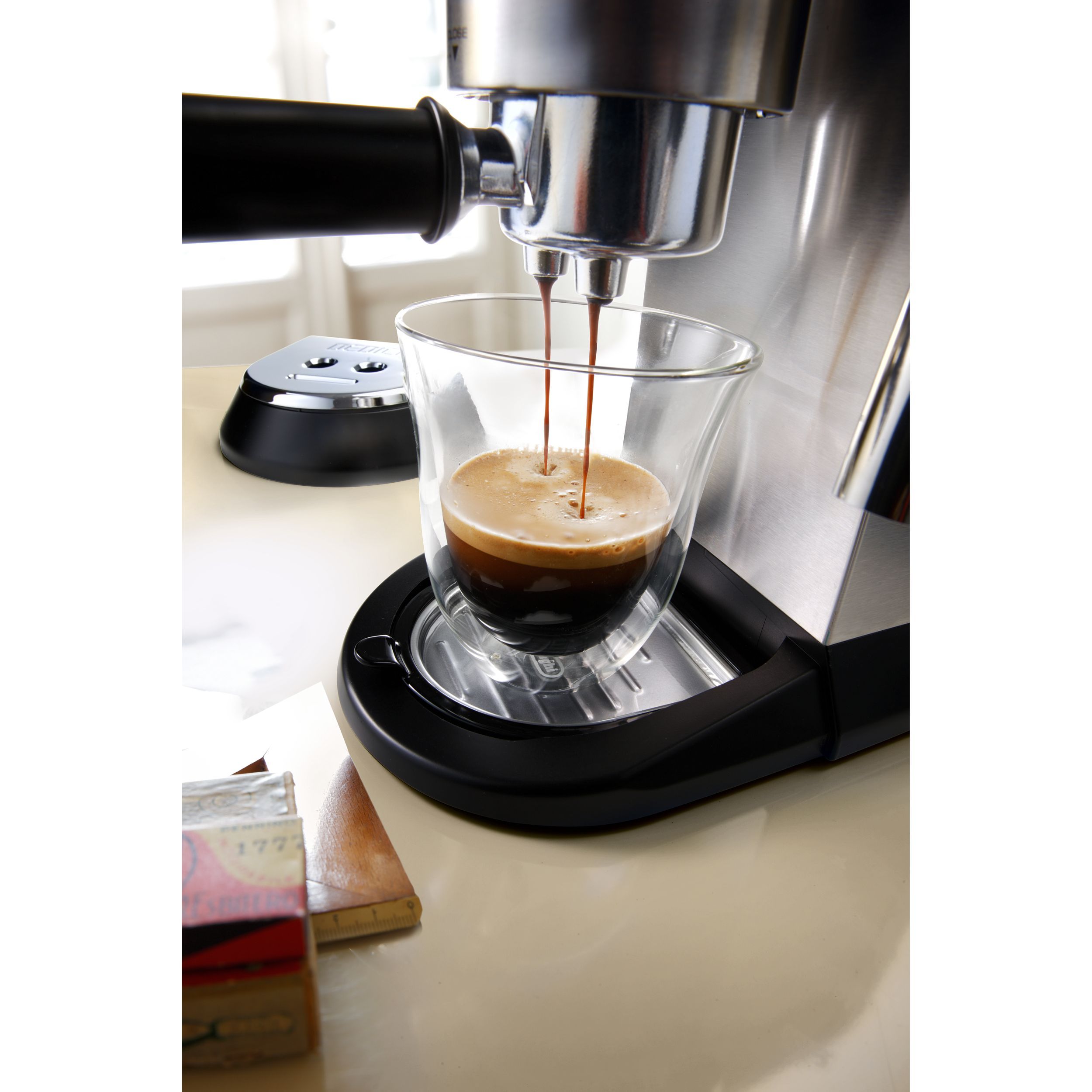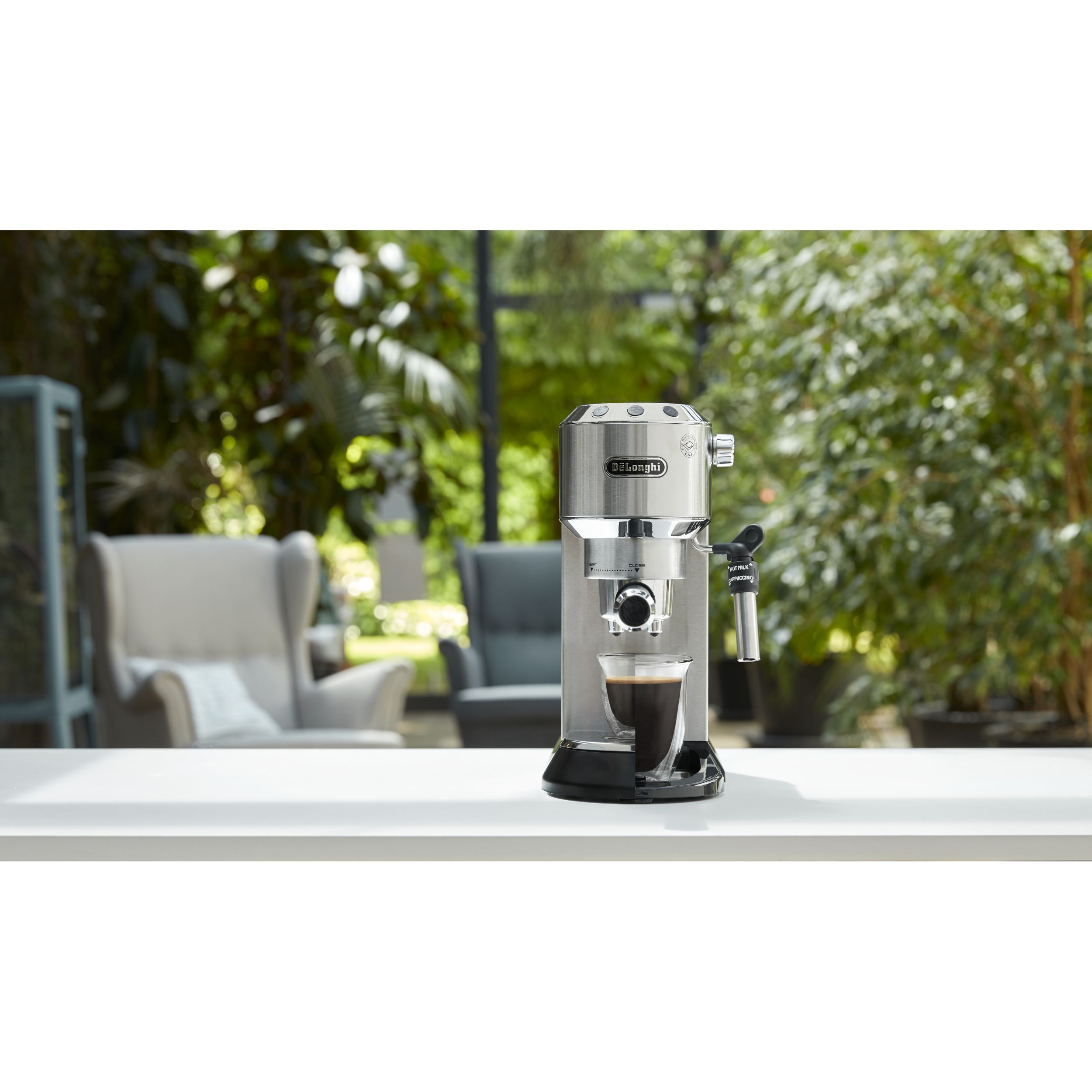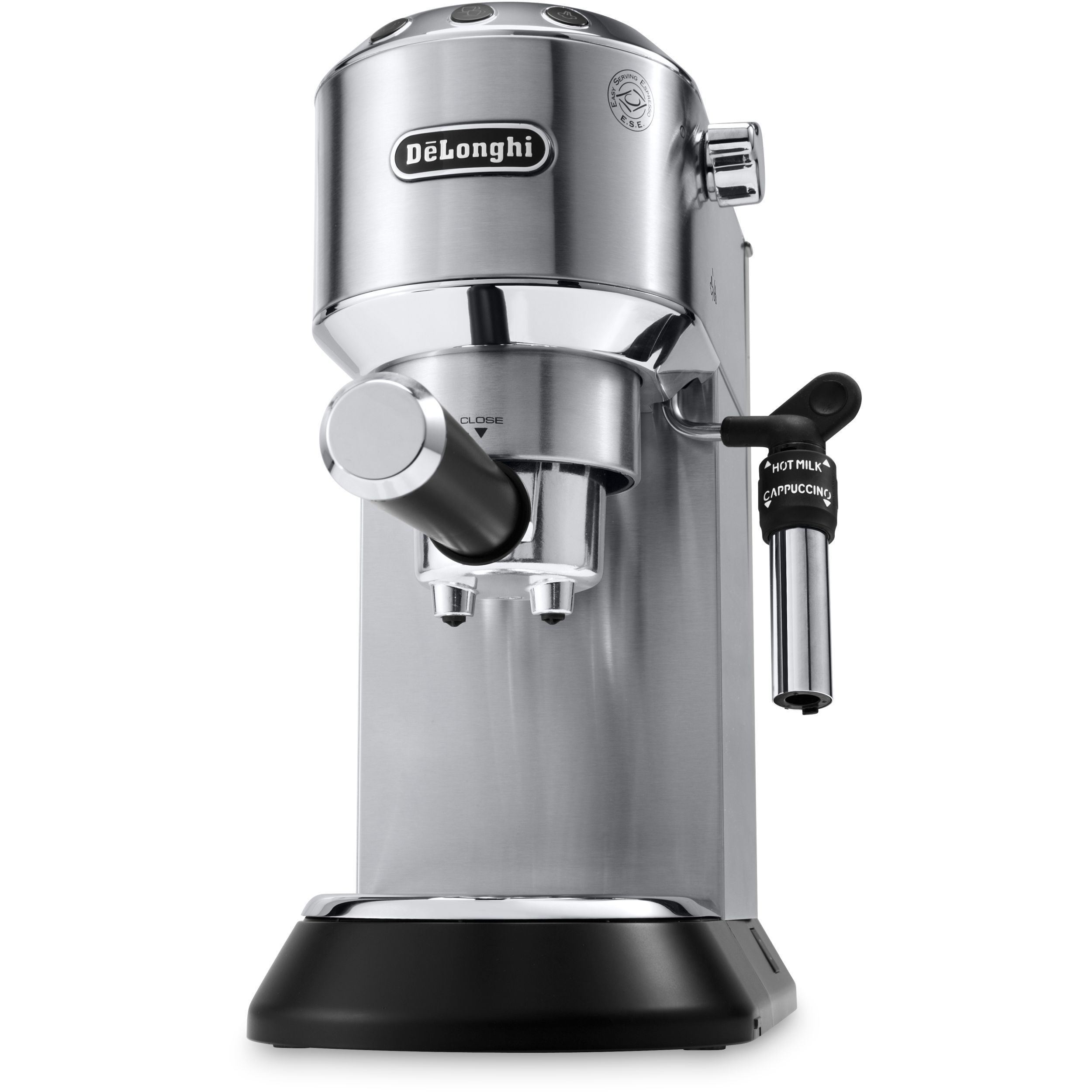 Espressor elegant și compact, conceput pentru a completa blatul de lucru din bucătărie. Datorită corpului său lucios din oțel inoxidabil și finisajului metalic lucios, espressorul Dedica adaugă oricărei bucătării o notă din designul italian autentic. Cu ajutorul espressorului manual Dedica, te poți bucura de un espresso dens și catifelat, precum și de o spumă de lapte cremoasă, datorită sistemului Cappuccino reglabil.