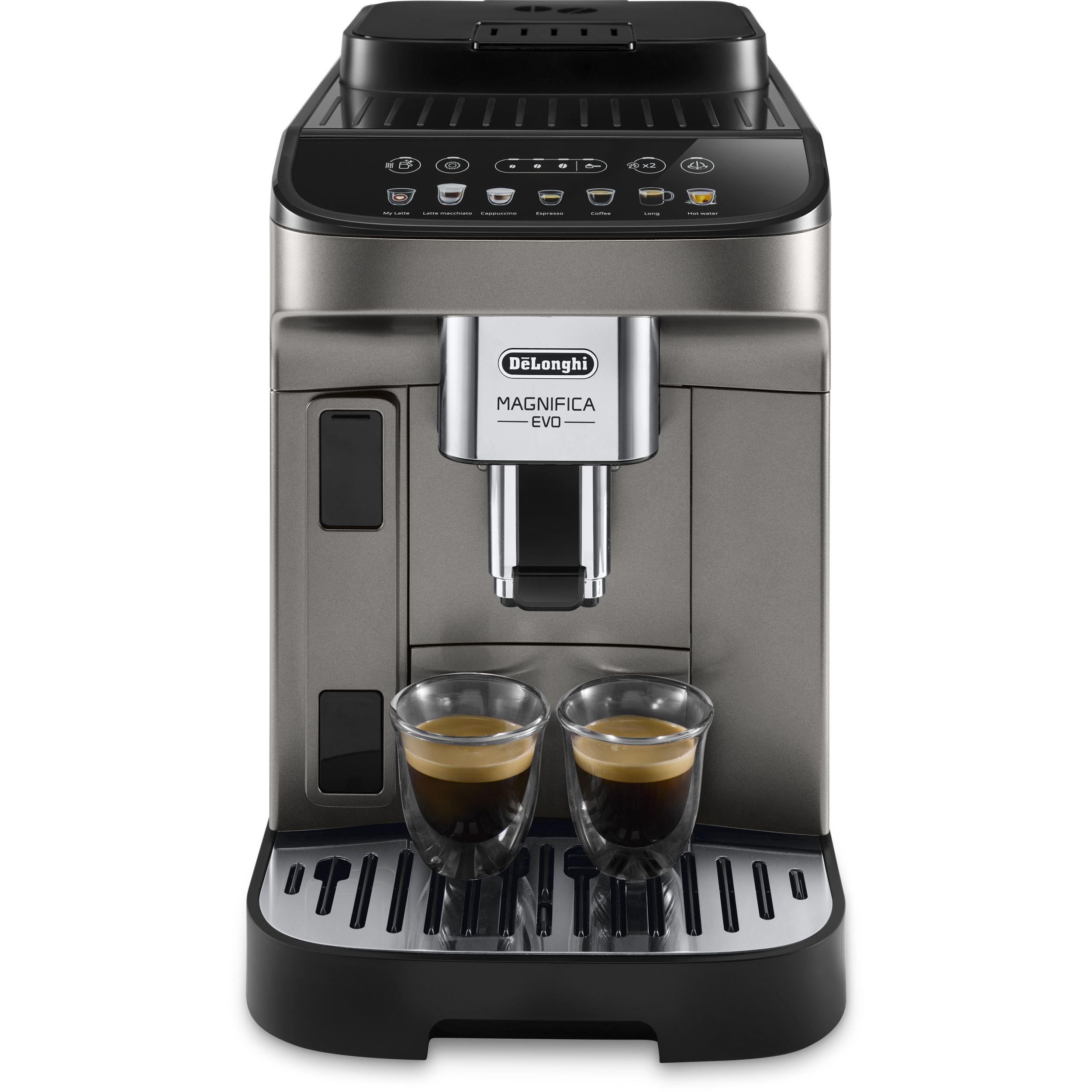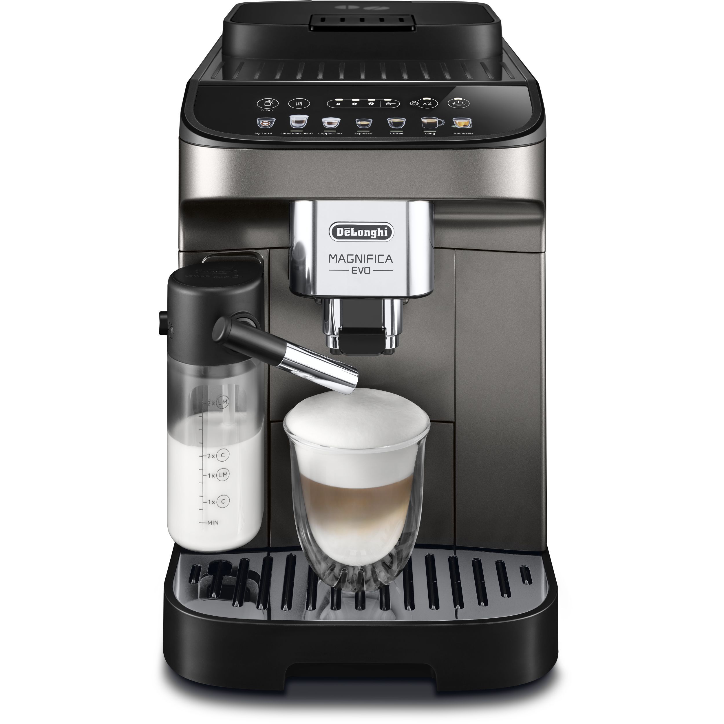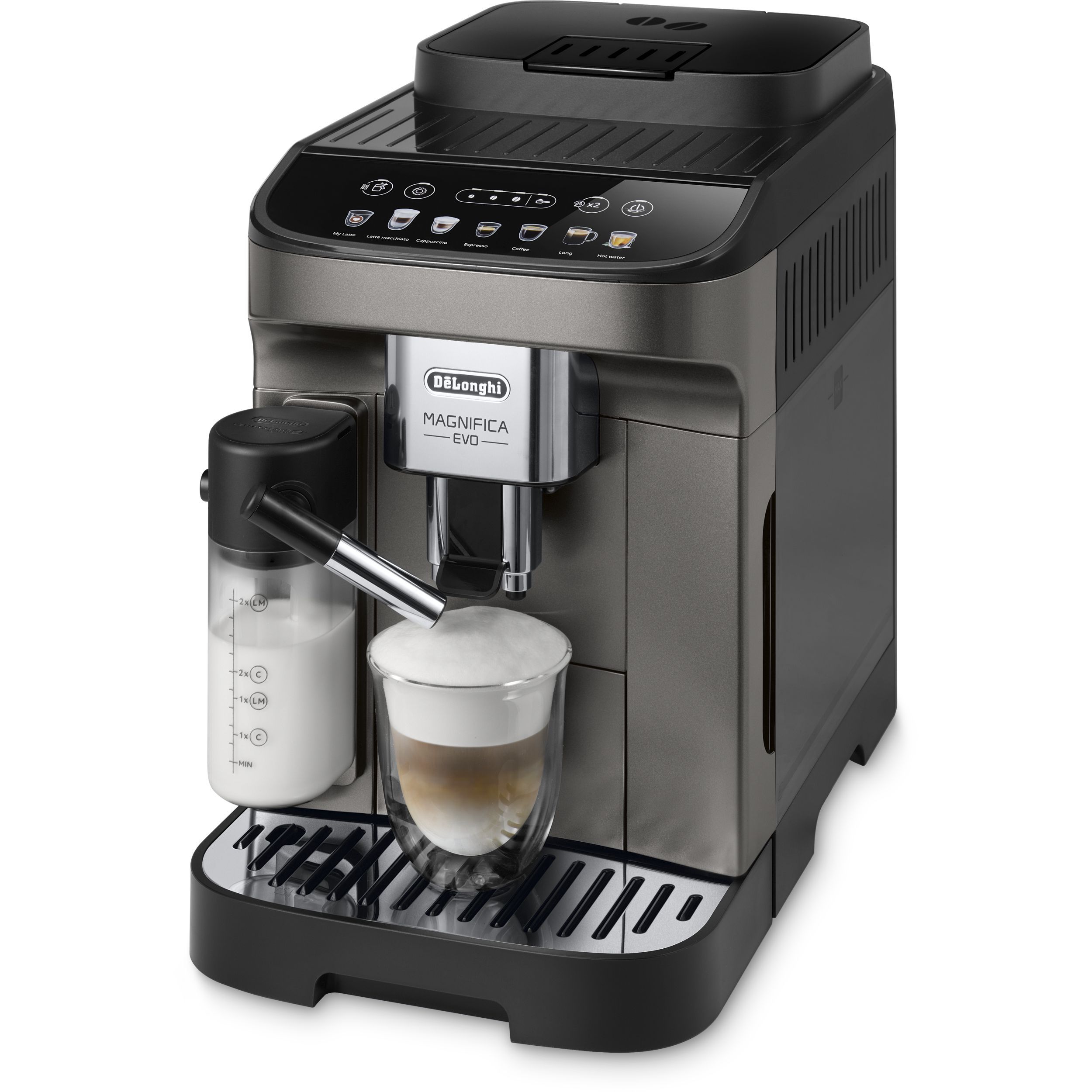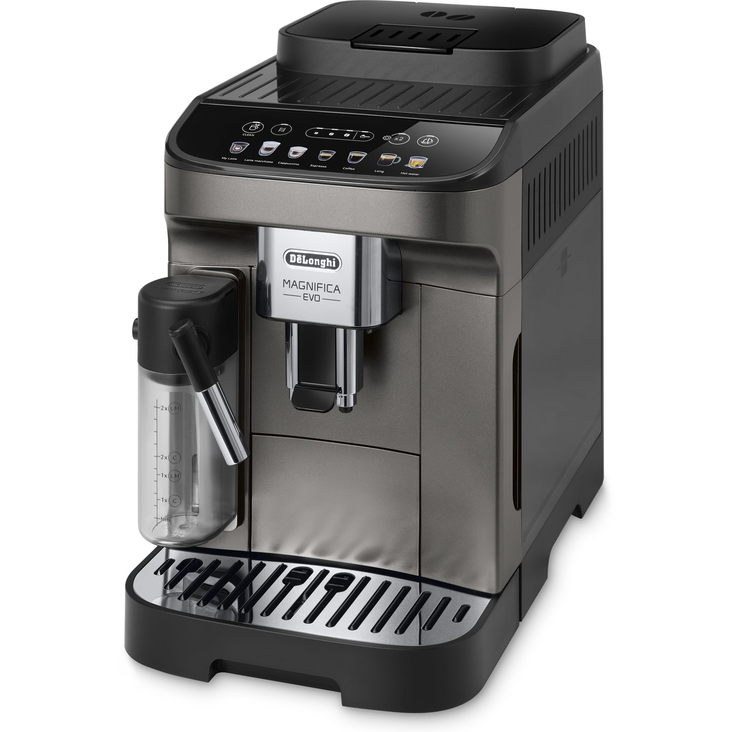 Magnifica Evo întruchipează experiența De'Longhi cu tehnologia sa avansată, băuturile autentice și designul modern elegant. Savurați espressoul italian perfect și o varietate de alte băuturi, completate cu spumă de lapte cremoasă datorită tehnologiei LatteCrema Hot și fără risipă de lapte, folosind funcția MyLatte. Puteți alege dintre 7 băuturi, cu o singură atingere, prin intermediul interfeței simple de utilizare.