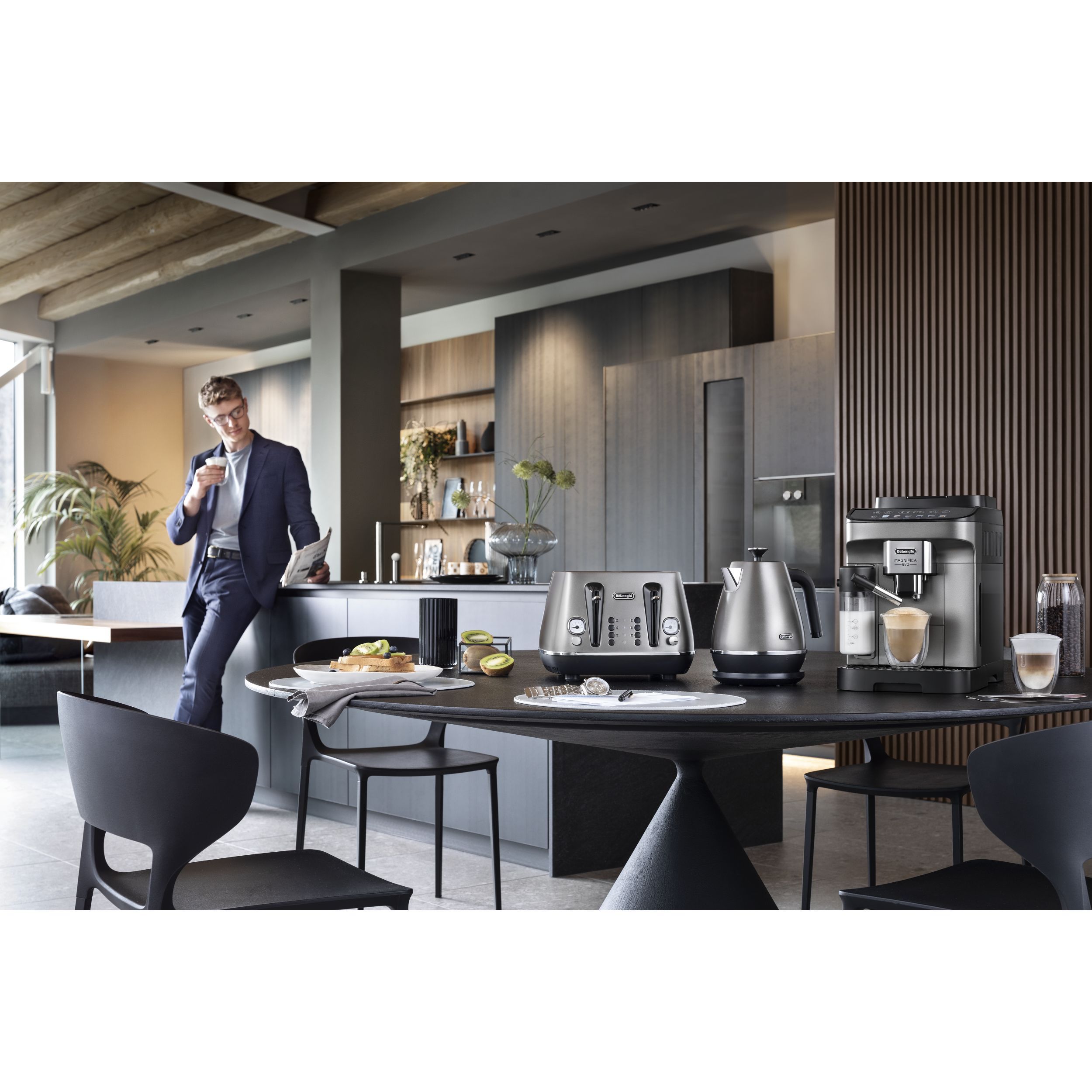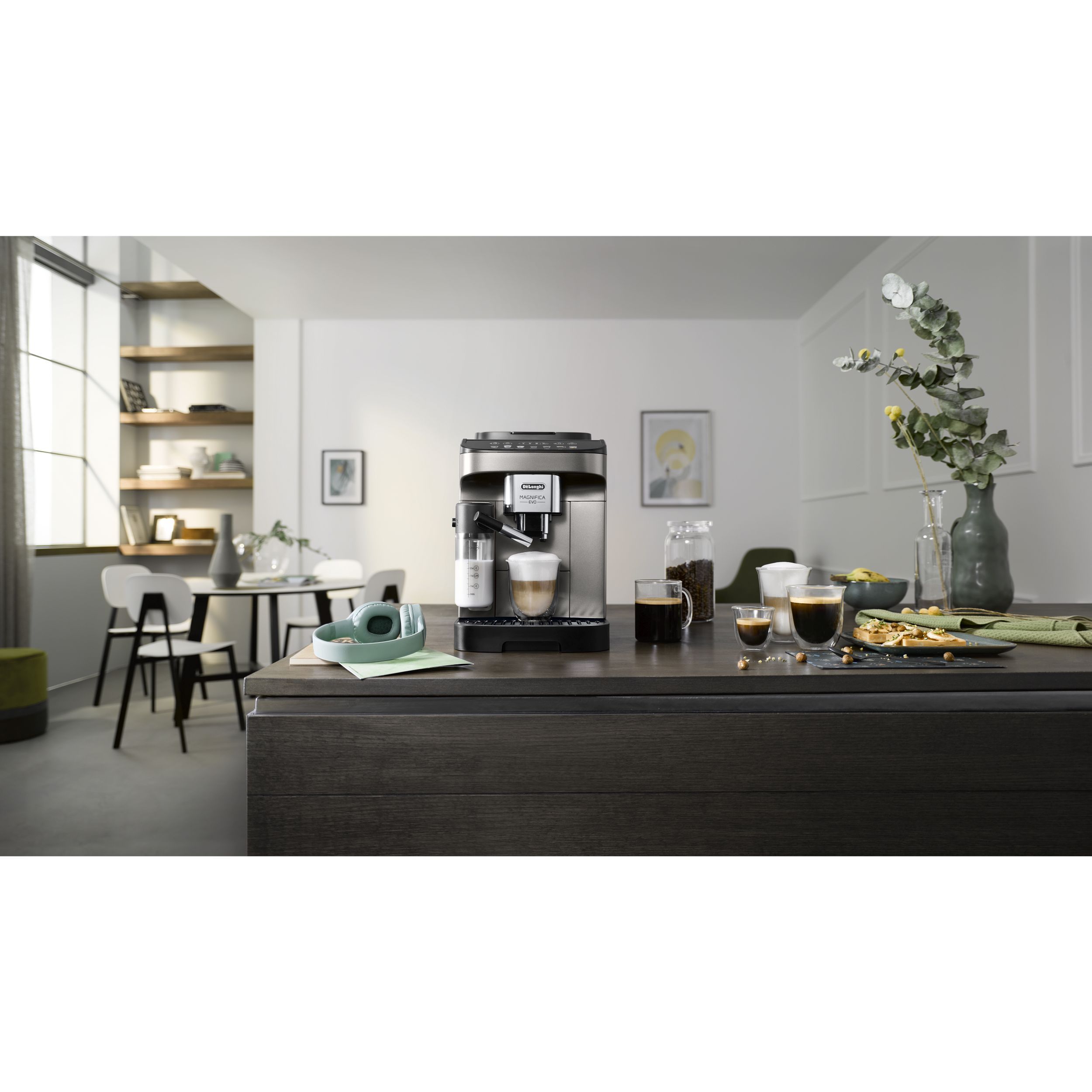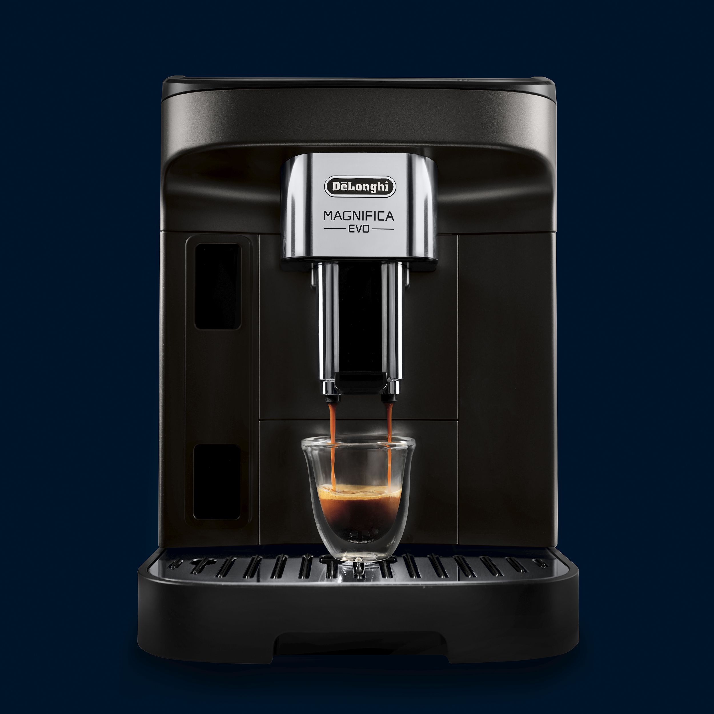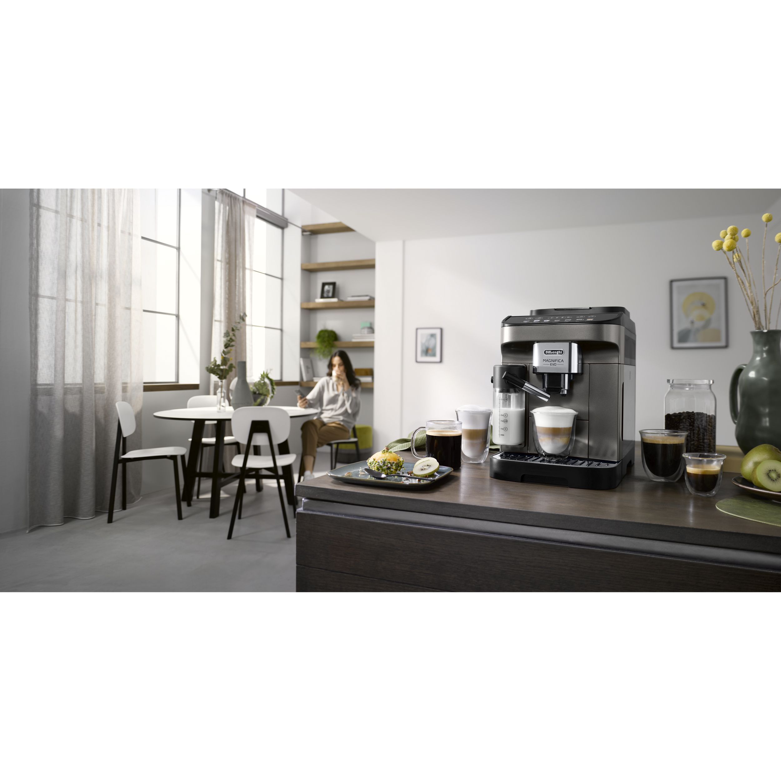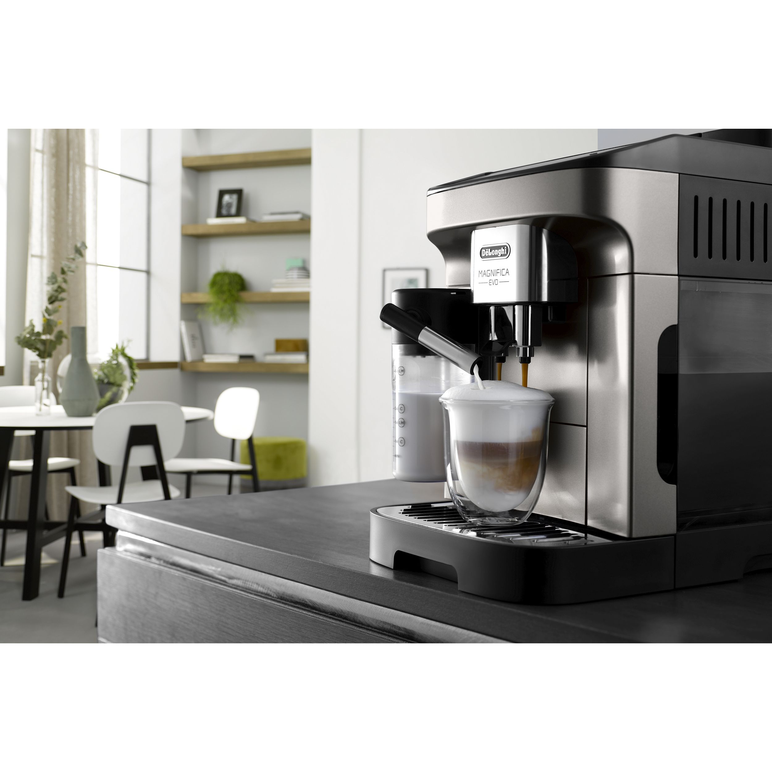 Magnifica Evo întruchipează experiența De'Longhi cu tehnologia sa avansată, băuturile autentice și designul modern elegant. Savurați espressoul italian perfect și o varietate de alte băuturi, completate cu spumă de lapte cremoasă datorită tehnologiei LatteCrema Hot și fără risipă de lapte, folosind funcția MyLatte. Puteți alege dintre 7 băuturi, cu o singură atingere, prin intermediul interfeței simple de utilizare.