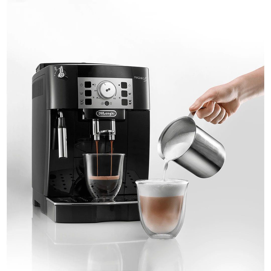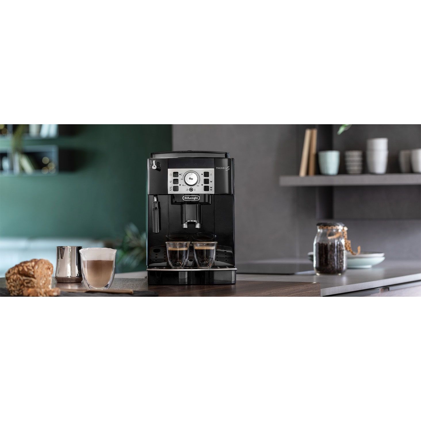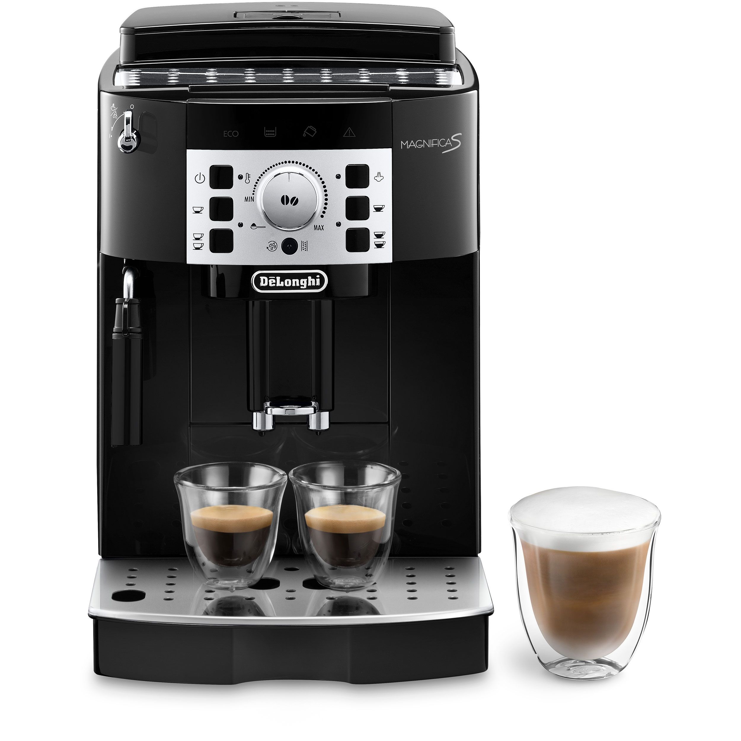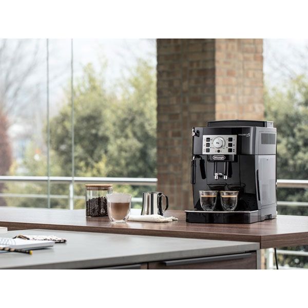 Cu espressorul automat Magnifica S rotiți butonul selector pentru a alege și personaliza aroma, iar apoi printr-o simplă apăsare de buton preparați cafeaua preferată. Este echipat cu un dispozitiv manual de spumare a laptelui, ideal pentru a obține o spumă bogată pentru cappuccino sau spumă de lapte.