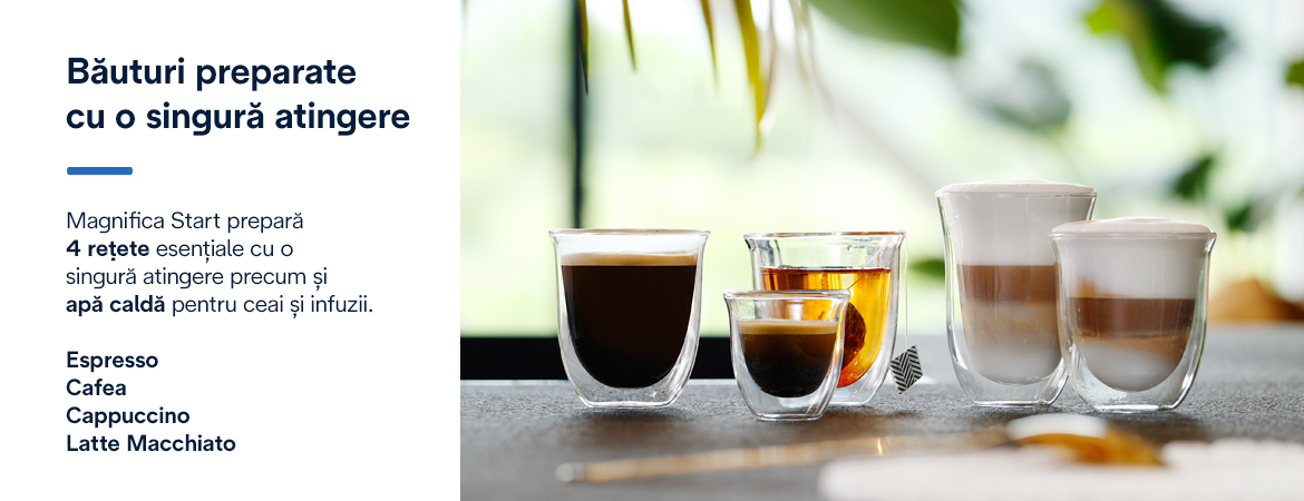 Magnifica Start prepară 4 rețete esențiale cu o singură atingere: Espresso, Cafea, Cappuccino, Latte Macchiato precum si apă caldă pentru ceai și infuzii.