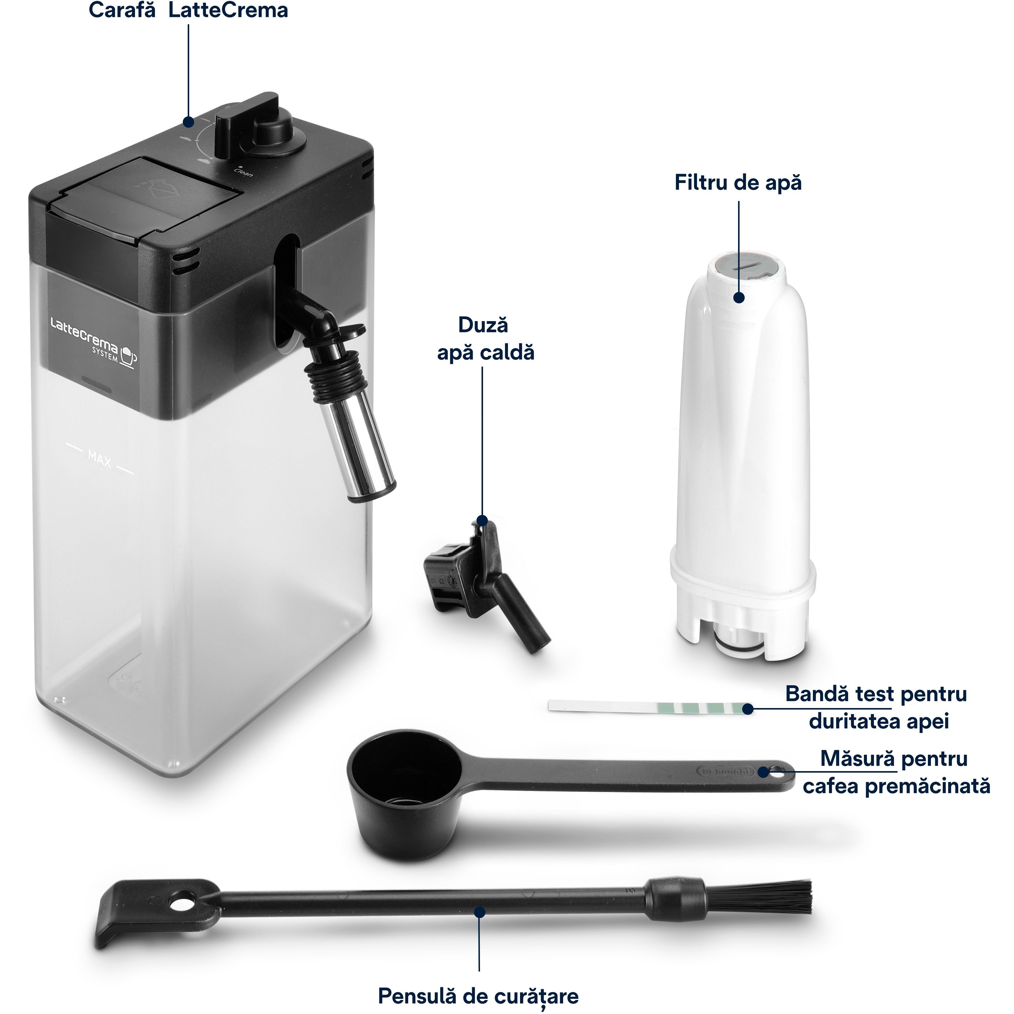 Pentru a prelungi durata de viață a espressorului și a obține un gust perfect în ceașcă, recomandăm folosirea accesoriilor De’Longhi pentru curățare și îngrijire. Decalcifiera, efectuată ori de câte ori este solicitată de espressor, este esentiata. Espressorul are un proces automat de decalcifiere și este recomandat să folosiți doar decalcifiantul De’Longhi EcoDecalk. Pentru procesul de decalcifiere, adăugați pur și simplu 100ml de soluție EcoDecalk în rezervorul de apă, completați cu apă rece, proaspătă și urmați instrucțiunile simple indicate de espressor. Decalcifiantul EcoDecalk este puternic, rapid, ecologic și conține doar ingrediente naturale. Filtrul de apă De’Longhi protejează espressorul de formarea depozitelor de calcar și ajută la eliminarea impurităților din apă, îmbunătățind gustului cafelei. În condiții normale de uz se poate utiliza timp de 2 luni, apoi este necesară înlocuirea cu un filtru nou, reducând astfel frecvența decalcifierii espresorului.