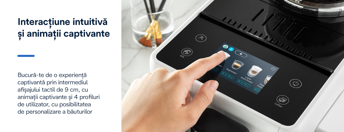 - Afișaj color intuitiv de 9cm cu 16 băuturi preparate printr-o singură atingere