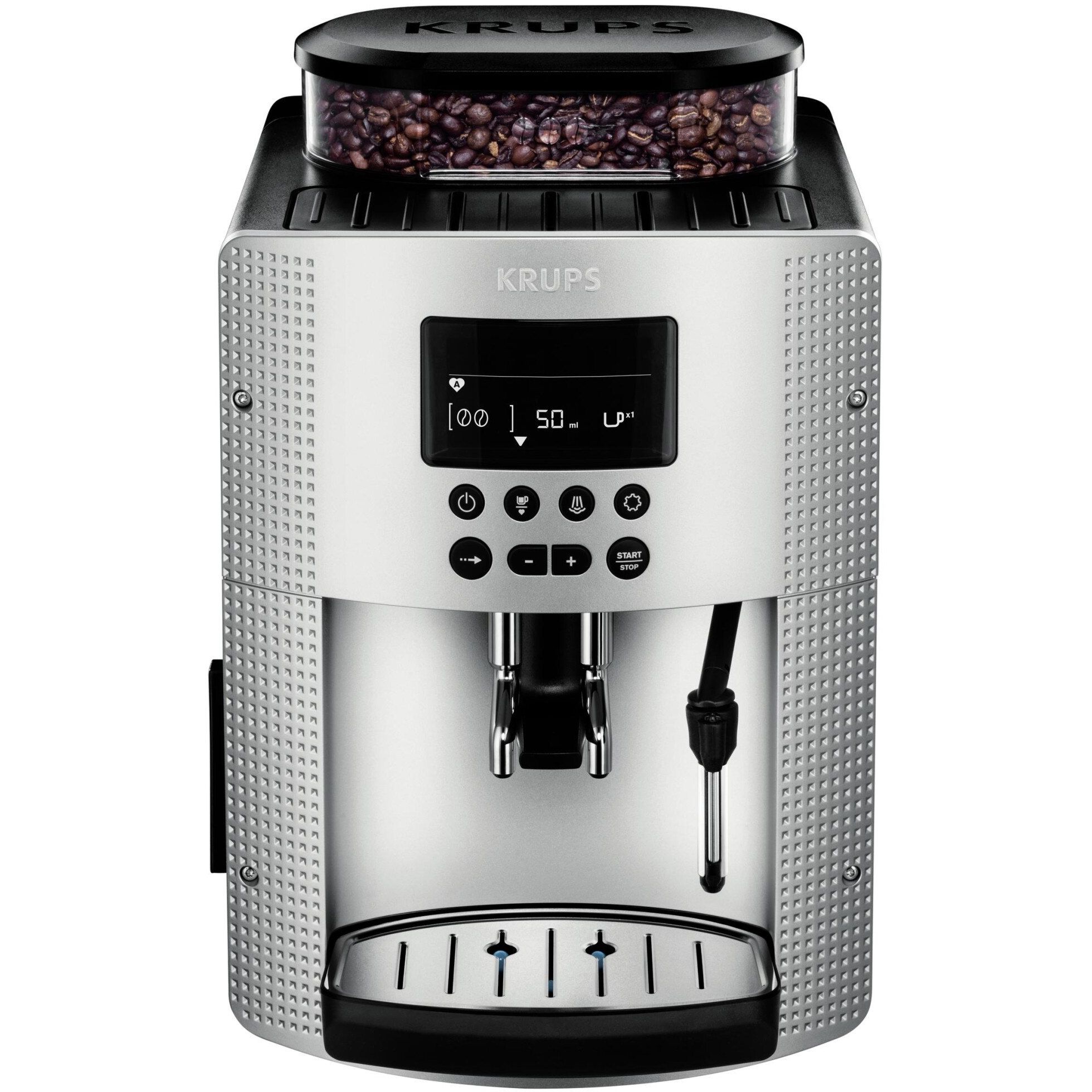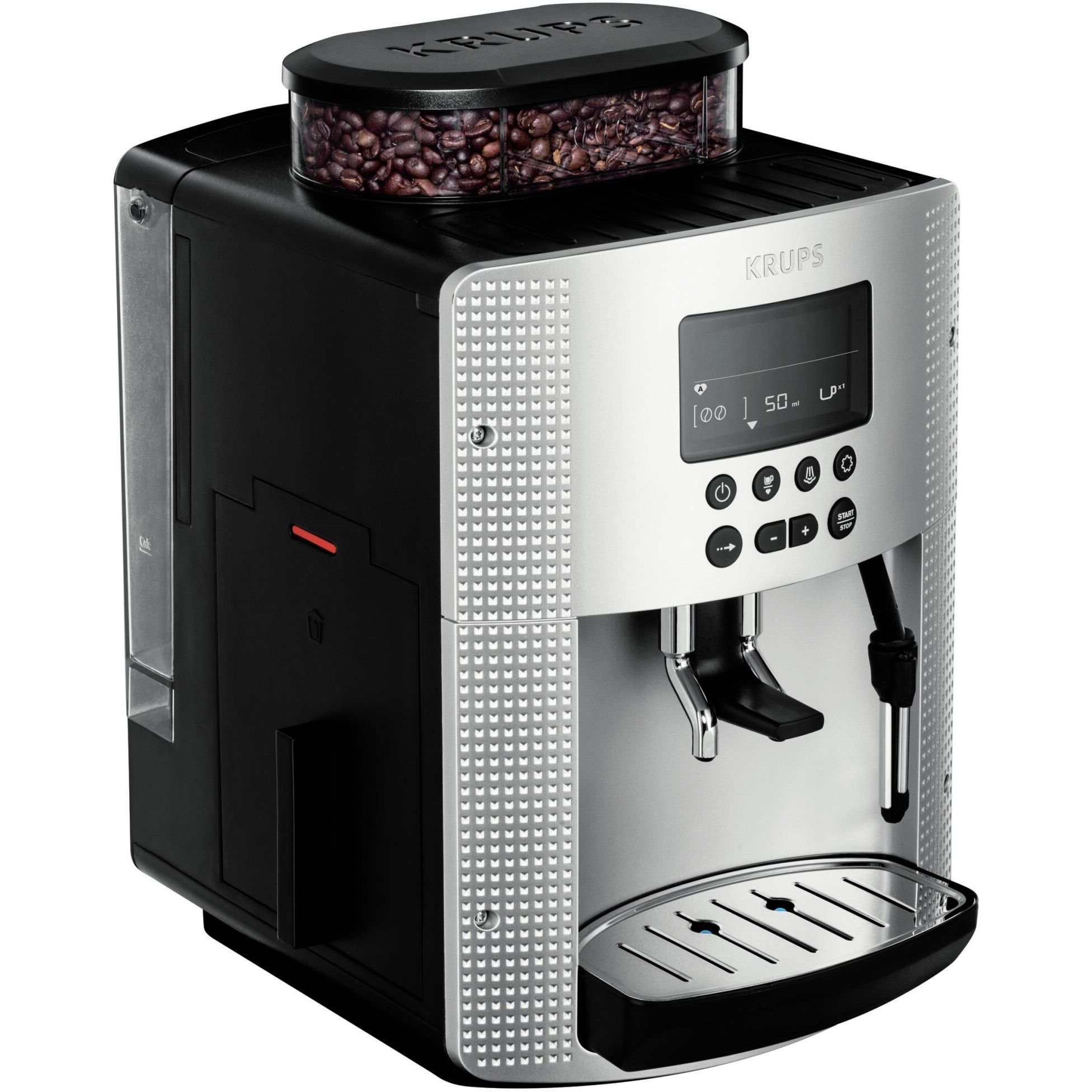 Espressorul automat Krups are un design compact însă dispune de un rezervor pentru apă de 1.7 L și de un recipient pentru 260 g de boabe de cafea.
