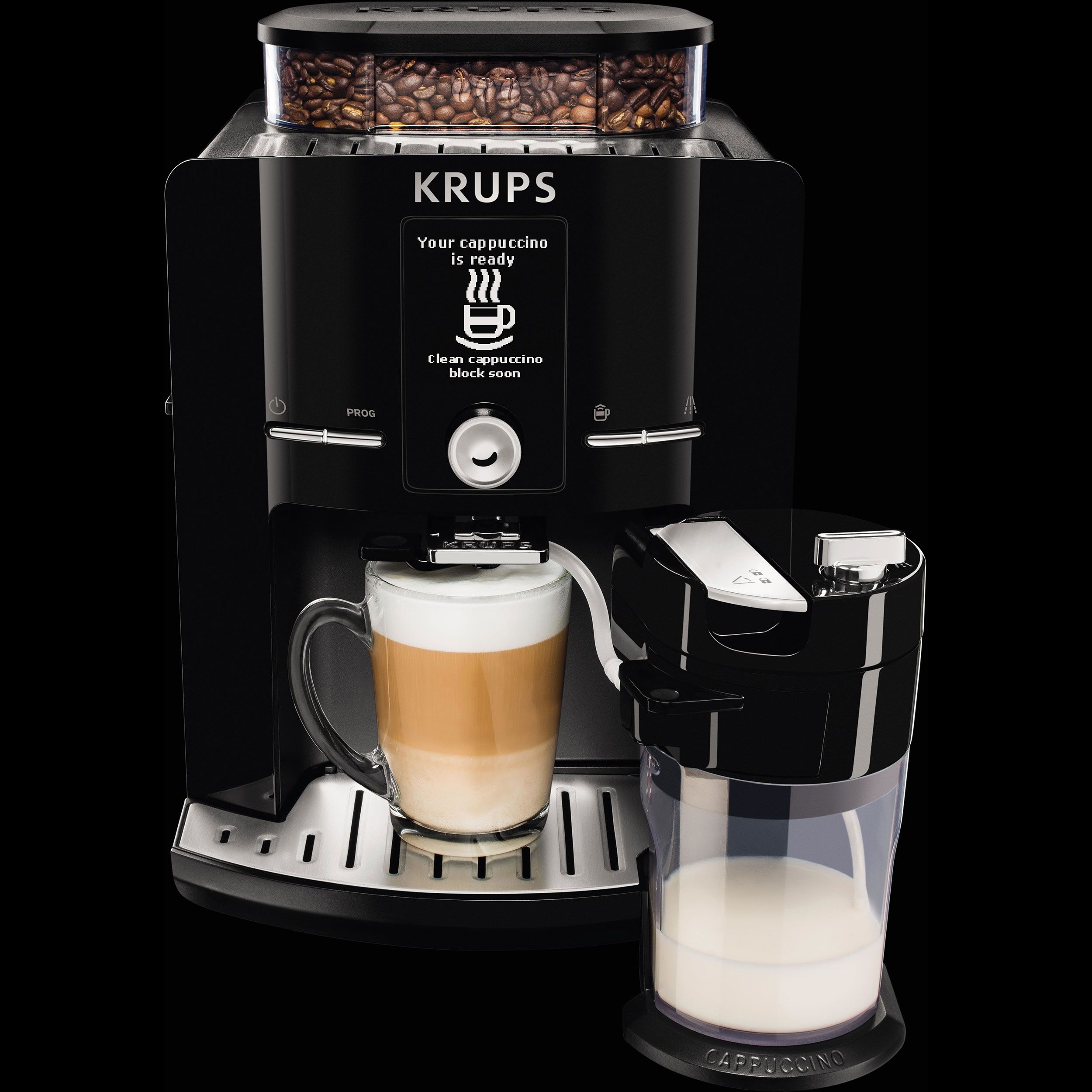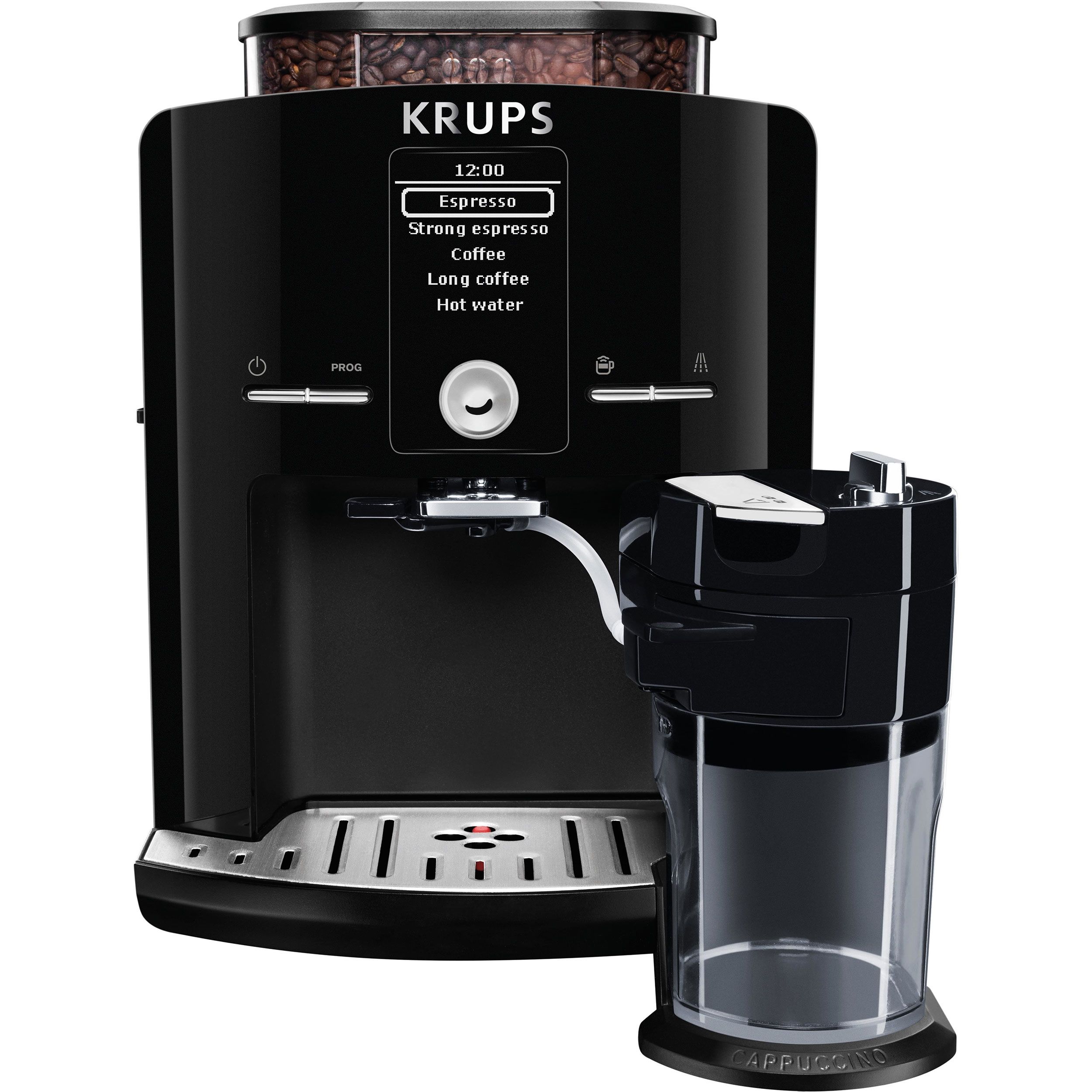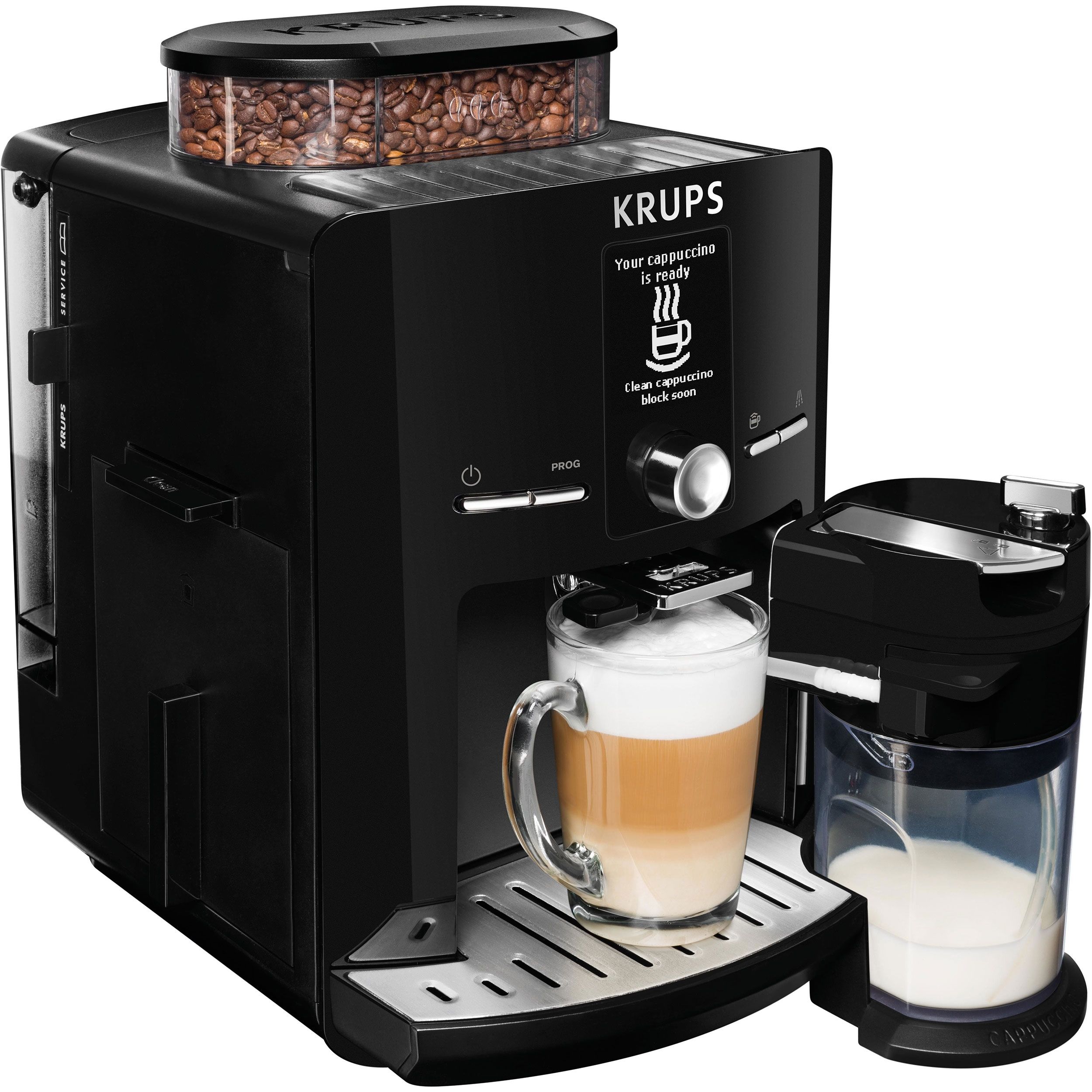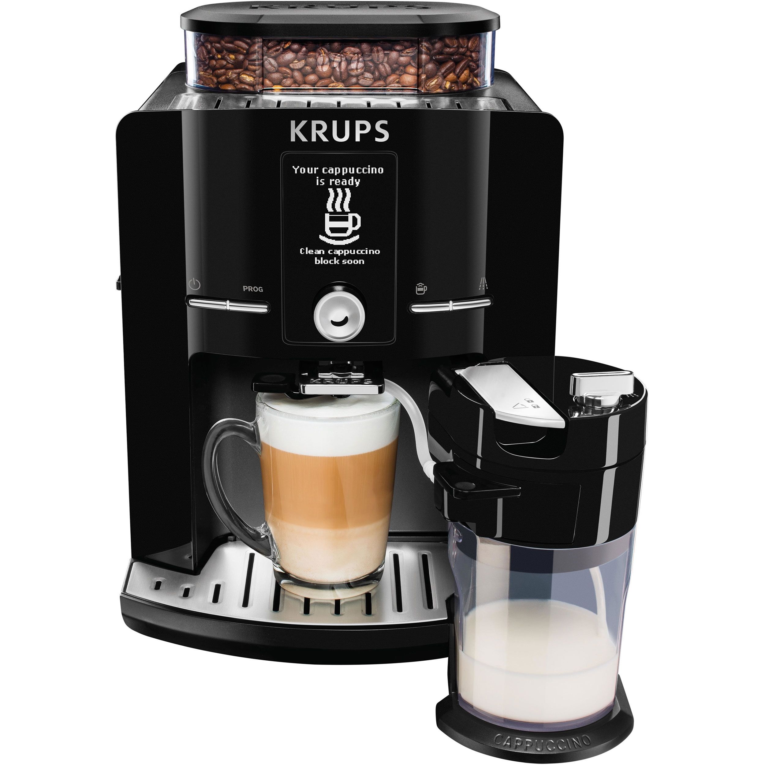 Cu espressorul automat KRUPS Latt`Espress prevăzut cu sistemul One-Touch-Cappuccino te bucuri de un cappuccino aromat și perfect echilibrat obținut din ingrediente proaspete, cu o singură atingere. Savurează gustul și calitatea deosebită datorită unei game mari de băuturi preparate perfect, pornind de la boabele de cafea direct în ceașcă. Mulțumită ecranului LCD intuitiv prepari cu ușurință băuturile tale preferate. Designul compact îl face să se potrivească perfect în orice bucătărie. Mai mult, acesta este prevăzut cu un recipient pentru 260 g de boabe de cafea și un rezervor pentru apă de 1.7 L. Espressorul automat vine la pachet cu un recipient pentru lapte dedicat conceput pentru a se potrivi perfect pe ușa frigiderului. Sistemul Patentat Thermoblock Compact oferă băuturi excepționale, o adevărată explozie de gust și savoare.